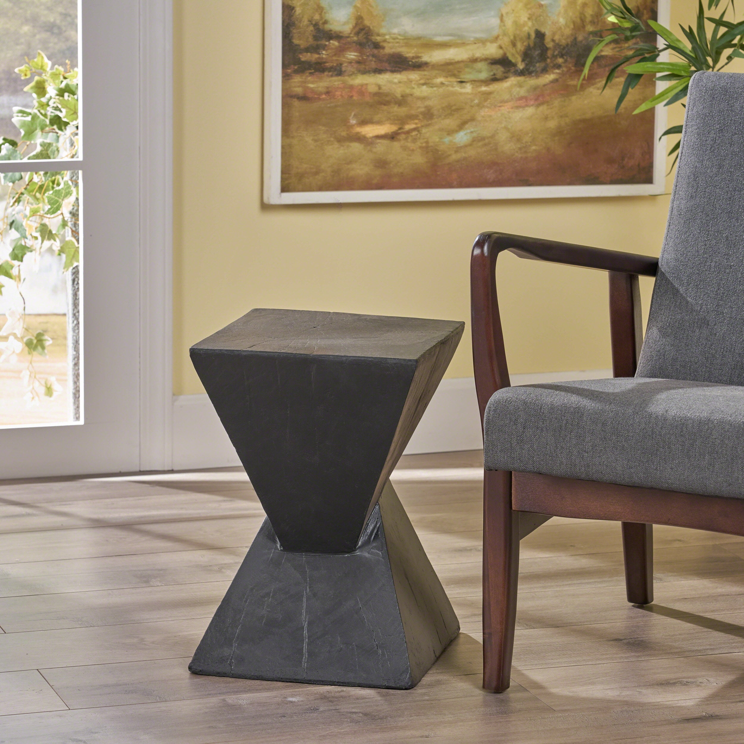 Turn your space into one that is worthy of a top-notch art gallery. This wonderfully sleek accent table brings both your indoor and outdoor spaces a modern aesthetic that is far from ordinary. Featuring an eye-catching twisted hourglass design crafted from lightweight concrete, this accessory not only offers a stylish aesthetic but is also a durable structure. Complemented by a wood-like finish with hand painted details that vary from piece to piece, this side table is the perfect addition to any art buff’s home. A TOUCH OF PERSONALITY: Bring both your outdoor and indoor space to life with our end table that features a twisted hourglass structure and a wood-like finish. With charming aesthetics, this side table will be sure to enliven any space. HAND PAINTED: This accessory is hand painted for a natural look. Any dark spots are not product flaws, but rather, will ensure that your purchase is truly a one-of-a-kind product. MODERN DESIGN: Featuring an understated design, this side table offers the look, feel, and design of a chic modern piece. With a minimalistic yet refined structure, this table brings out a simplistic style that emphasizes functionality. LIGHTWEIGHT CONCRETE: This side table is constructed with lightweight concrete for a smooth look. This provides a highly durable structure that can hold a substantial amount of weight. DIMENSIONS: Choose an accessory that is the perfect size for you and your furniture. This accent table is 12.50″ W x 12.50″ D x 18.00″ H. You will love how much your space can transform with the simple addition of this charming table.