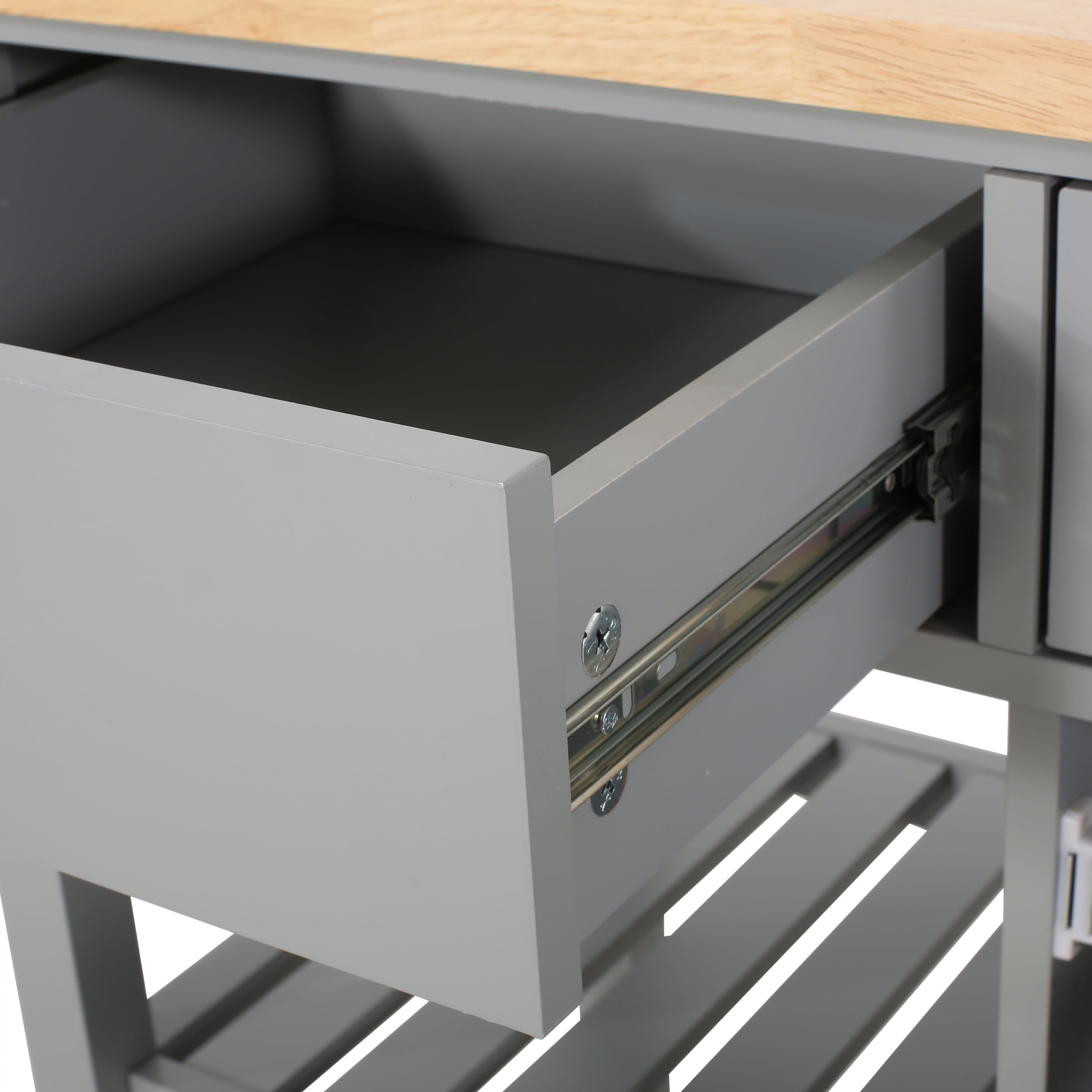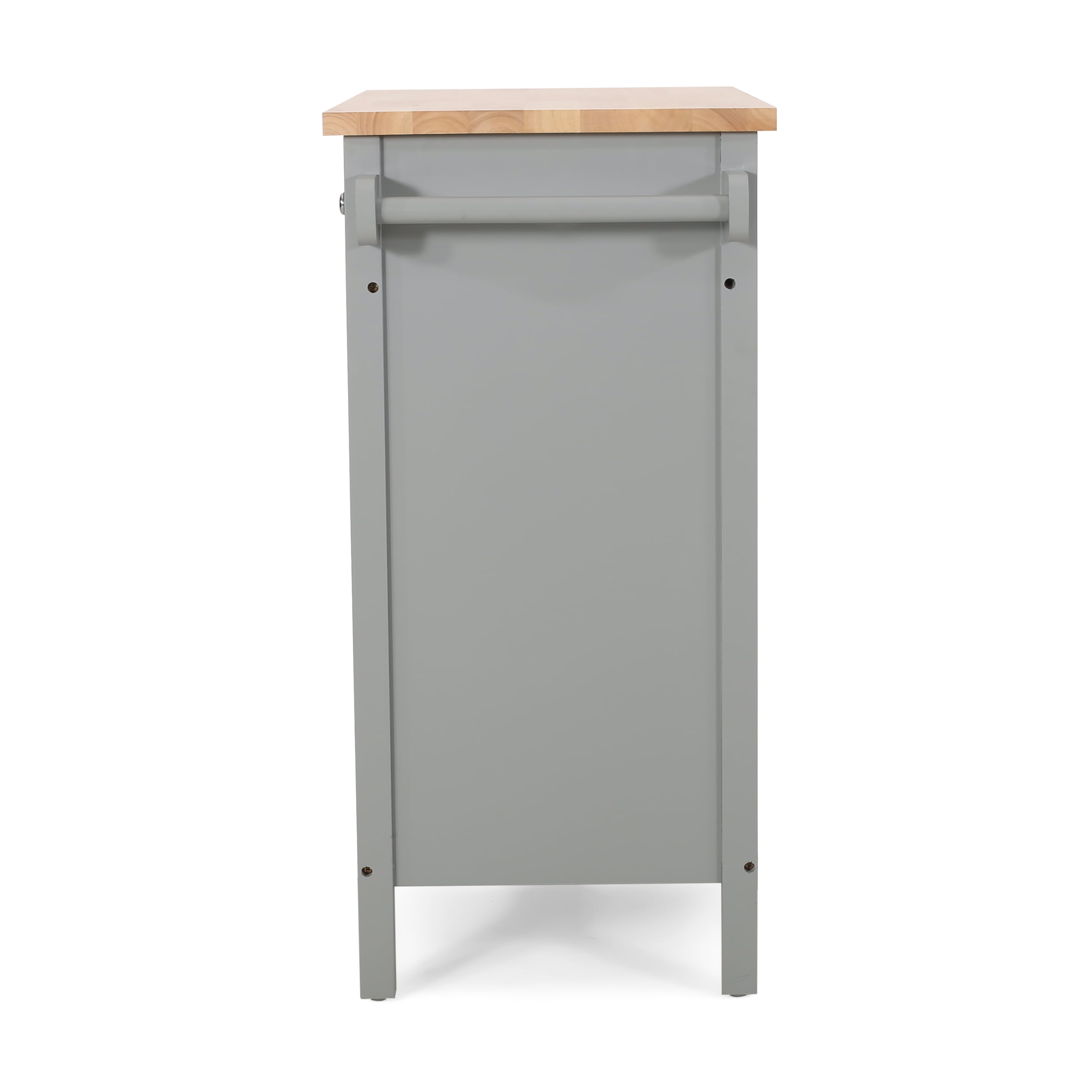Includes: One (1) Kitchen Cart Top Material: Rubberwood Leg Material: Pine Wood Base Material: Faux Wood Finish: Gray Top Finish: Natural Hand-Crafted Details Assembly Required Dimensions: 17.15 inches deep x 34.15 inches wide x 34.75 inches high