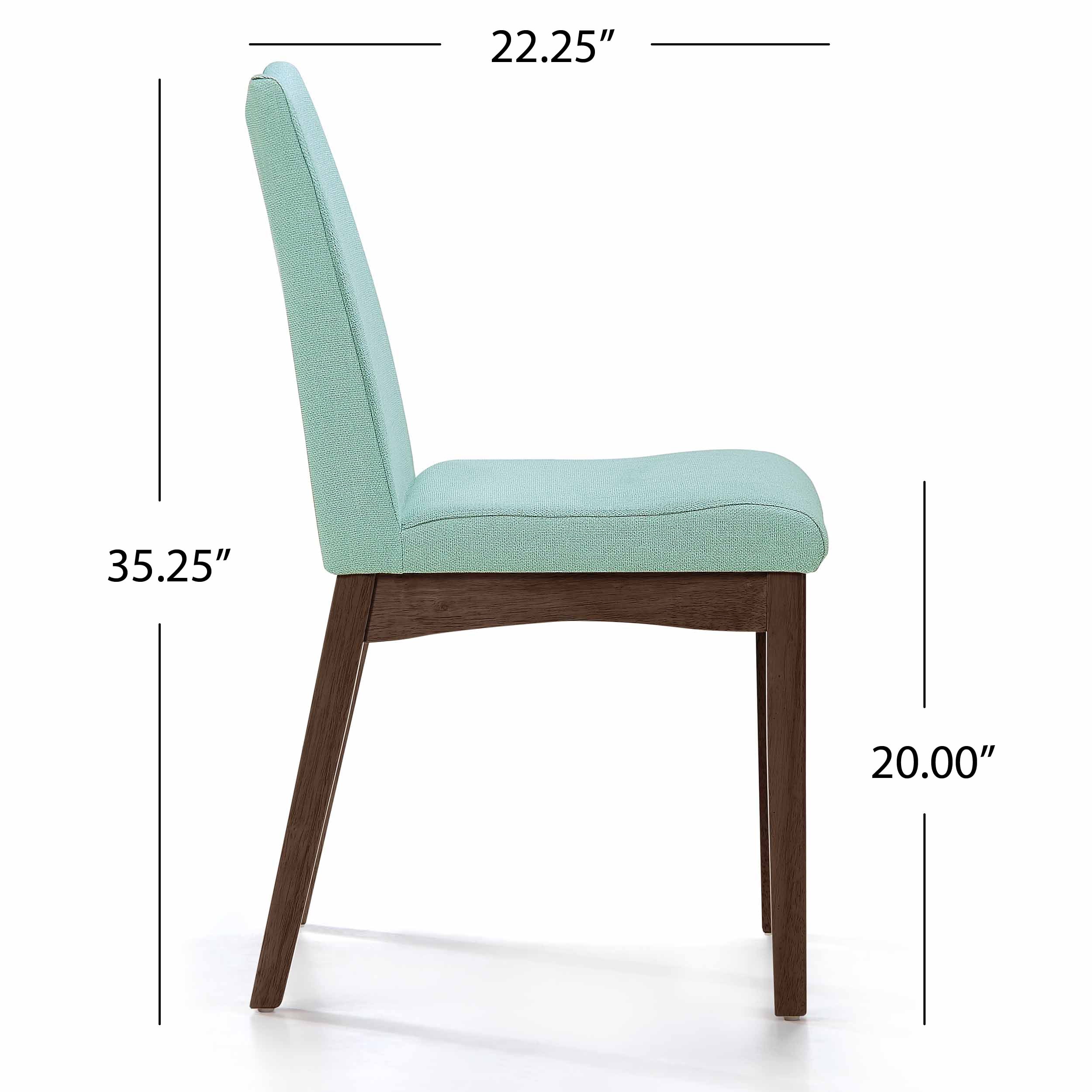 Noble House Roosevelt Mid Century Modern Mint Fabric Dining Chairs, Set of 2, Mint: Includes: Two (2) Dining Chairs Material: Fabric Fabric Composition: 100% Polyester Leg Material: Rubberwood Multiple Color Options Multiple Leg Finish Options Some Assembly Required Dimensions: 22.05 inches deep x 17.75 inches wide x 35.25 inches high Seat Dimensions: 16.25 inches deep x 17.75 inches wide x 20.00 inches high
