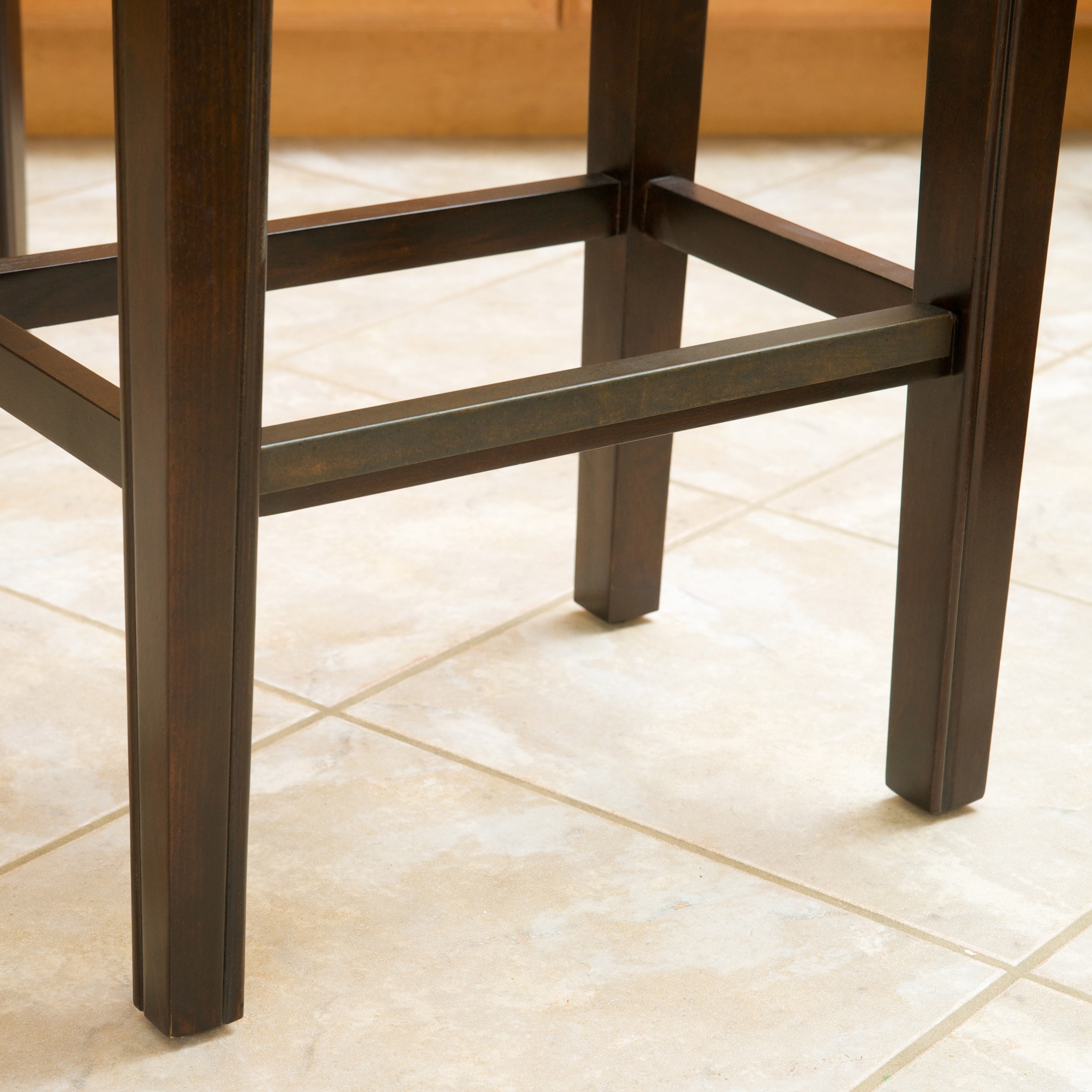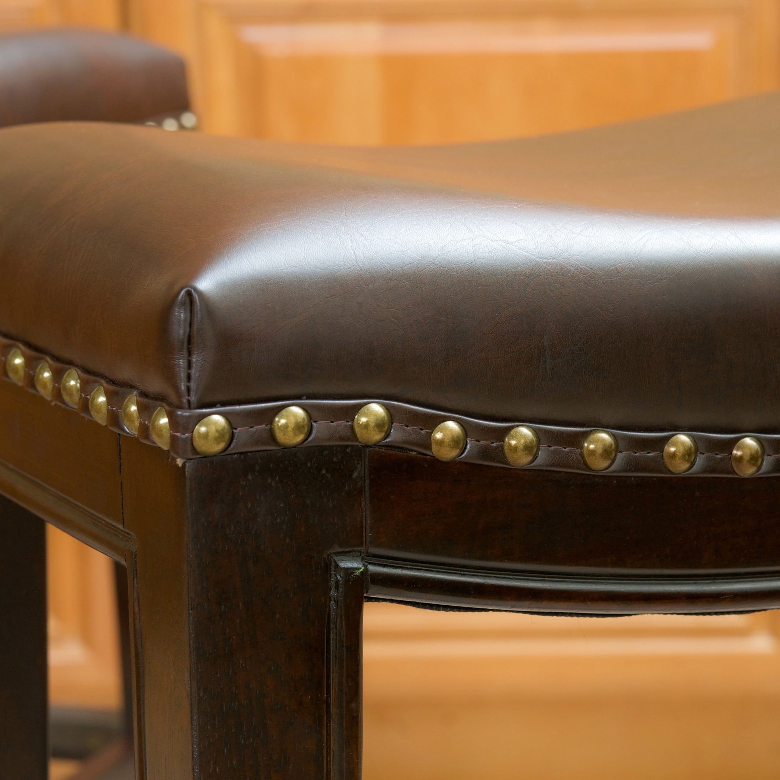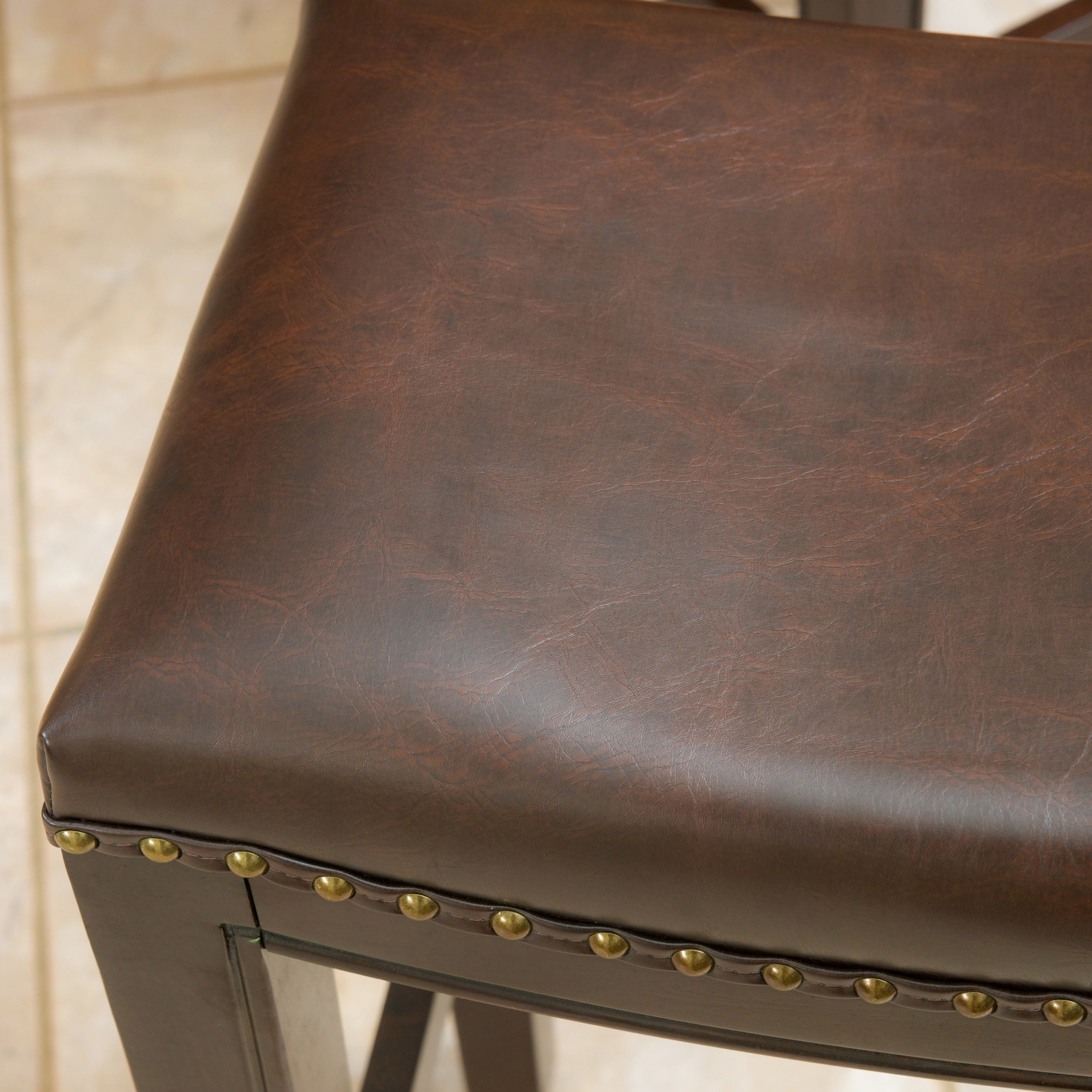 The Noble House Santina Backless Counter Stools combines elegance and structure. It features a well-padded bonded leather seat, espresso colored legs and bronze colored studs curved along the seat. This stool is a perfect transitional piece from your kitchen to your living room. Choose an accessory that is the perfect size for you and your furniture. You will love how much your space can transform with the simple addition of this charming counter stool.