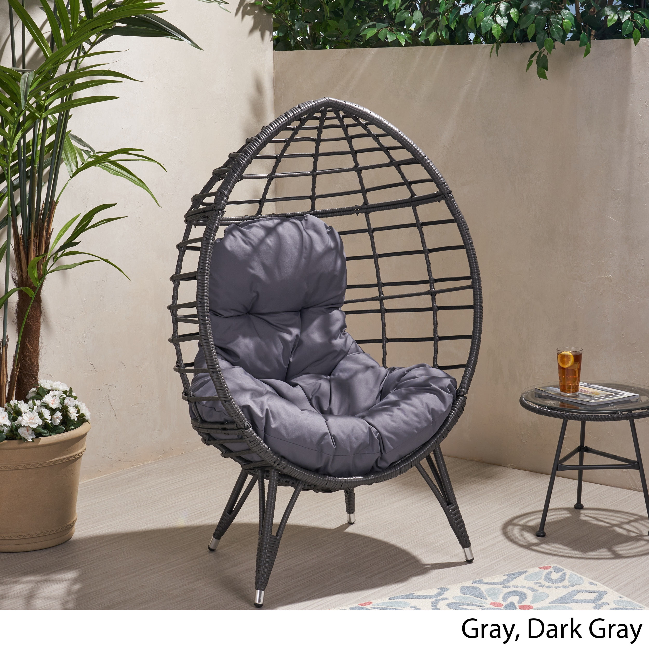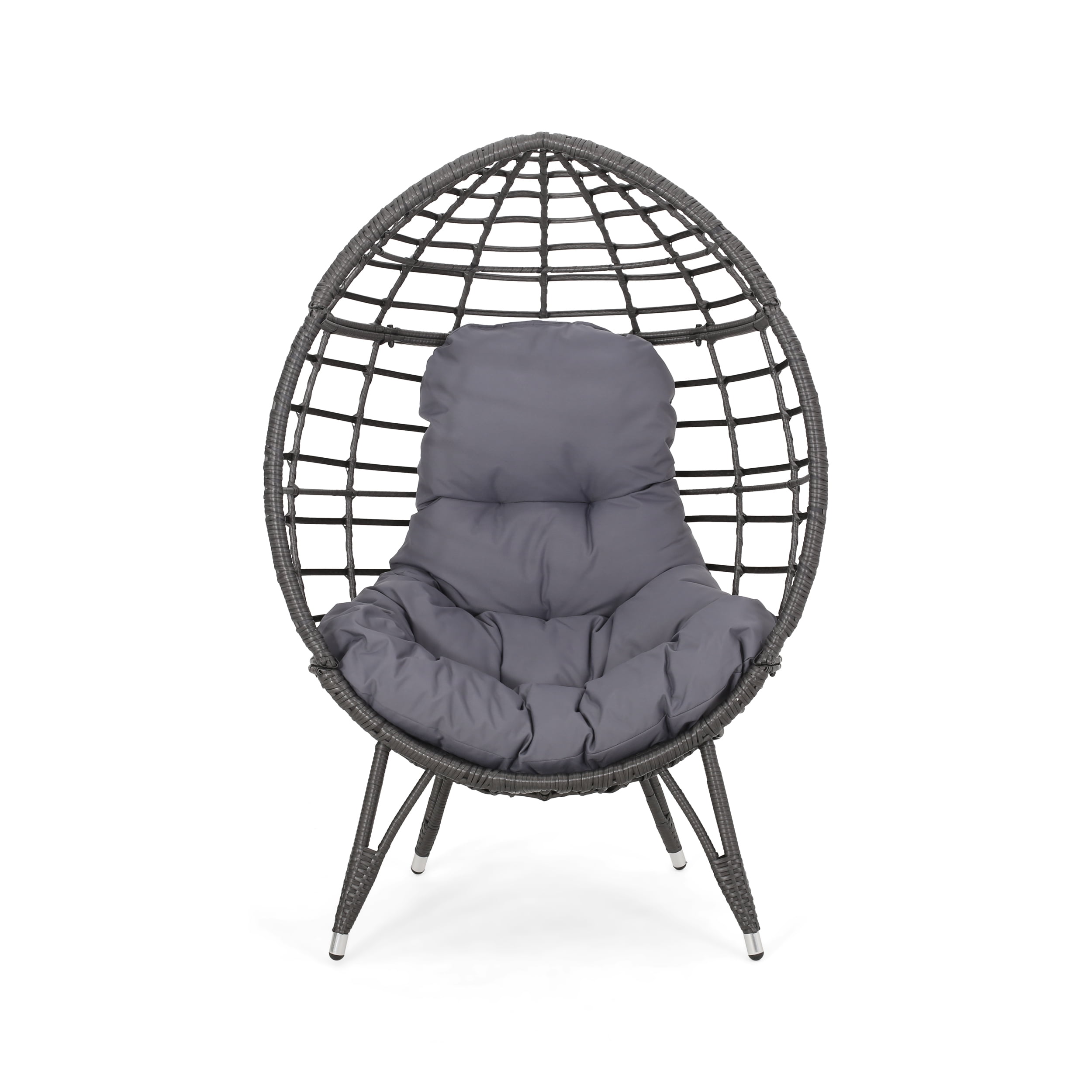 Includes: One (1) Teardrop Chair Material: Faux Rattan Frame Material: Iron Cushion Material: Water Resistant Fabric Cushion Composition: 100% Polyester Rattan Finish: Gray Cushion Color: Dark Gray Hand-Crafted Details Assembly Required