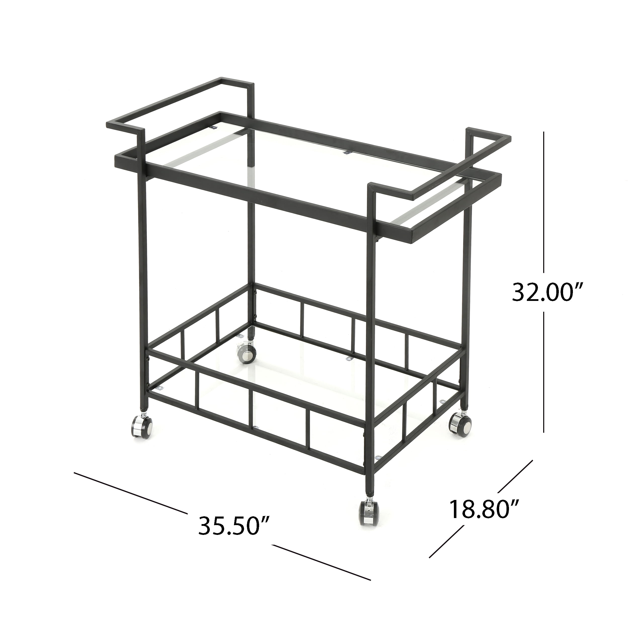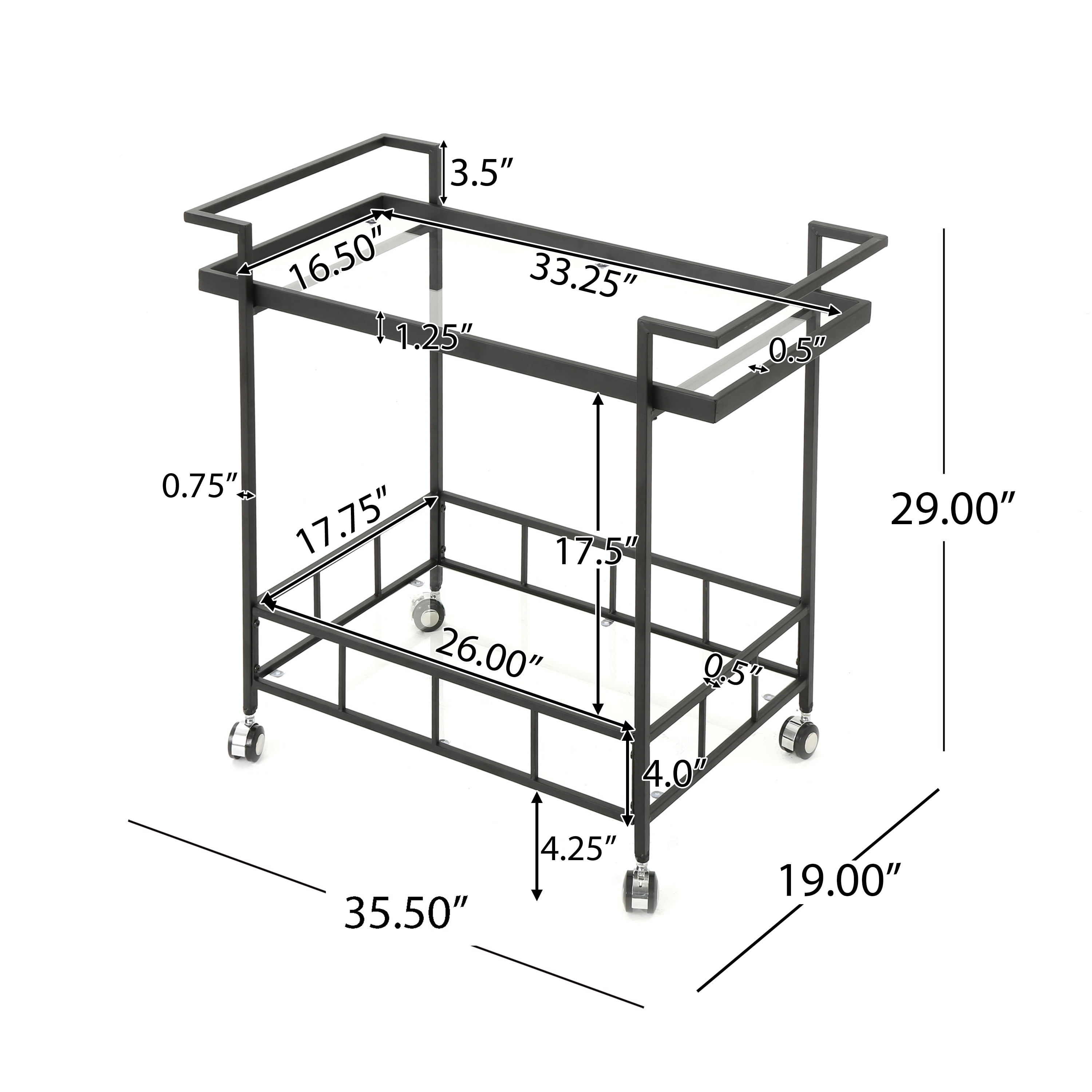 Includes: One (1) Bar Cart Material: Tempered Glass Frame Material: Iron Frame Finish: Black Assembly Required Hand Crafted Details Dimensions: 18.80 inches deep x 35.50 inches wide x 32.00 inches high
