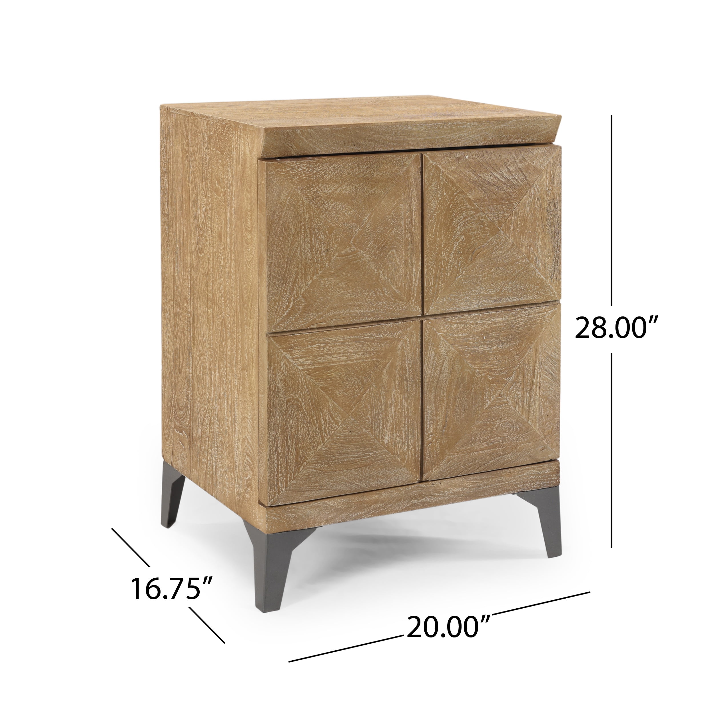 Accentuate your decor with an accessory that offers both style and convenient storage space in any room of your home. Featuring beautiful mango wood for a one-of-a-kind design, this accessory offers an understated boho look for your home with its pyramid tiled cabinet door. This cabinet is completed with plenty of storage space, giving you ample room to organize your items. With a minimalistic yet outstanding design, our cabinet will easily enhance your decor, bringing out the best of your interior space. BOHO: For a carefree, unconventional look for your home, our cabinet brings a bold boho touch to your decor. Featuring a textured wood finish that blends perfectly with its simple frame, this piece offers function and style that is finished with iron leg support. HANDCRAFTED DESIGN: This accessory is expertly designed and handcrafted with artisan expertise. Any natural variations are not product flaws, but rather, will ensure that your purchase is truly a one-of-a-kind product. Due to the nature of the wood, some knots will be made visible by the sandblast finish. MANGO WOOD: Mango wood features gorgeous golden browns with natural hues that come from spalting, making each piece a one-of-a-kind color. Not only does this hardwood showcase unique patterns and take well to stains, but it also offers dense durability to resist wear and tear. STORAGE SPACE: This cabinet offers one cabinet with two shelves for storing and organizing your items. The door is finished with subtle pyramid tiles, adding to its eccentric design. DIMENSIONS: Choose an accessory that is the perfect size for you and your furniture. This cabinet is 20.00” W x 16.75” D x 26.50” H. You will love how much your space can transform with the simple addition of this charming cabinet.