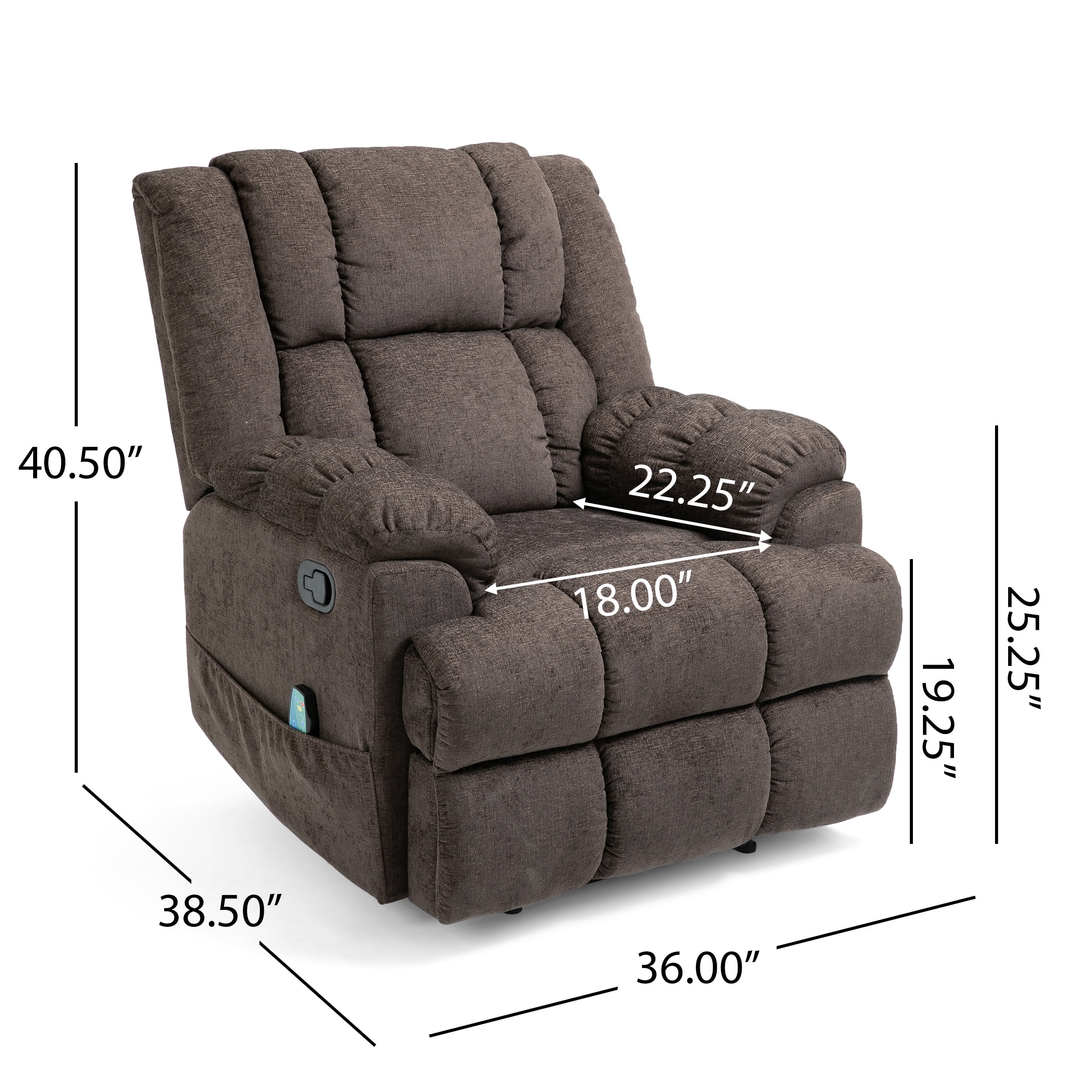 Includes: One (1) Massage Recliner Seats One Massage and Heating Features Remote Control Included 36.00” W x 38.50” D x 40.50” H Reclines Up To 36.00” W x 64.50” D x 32.25” H
