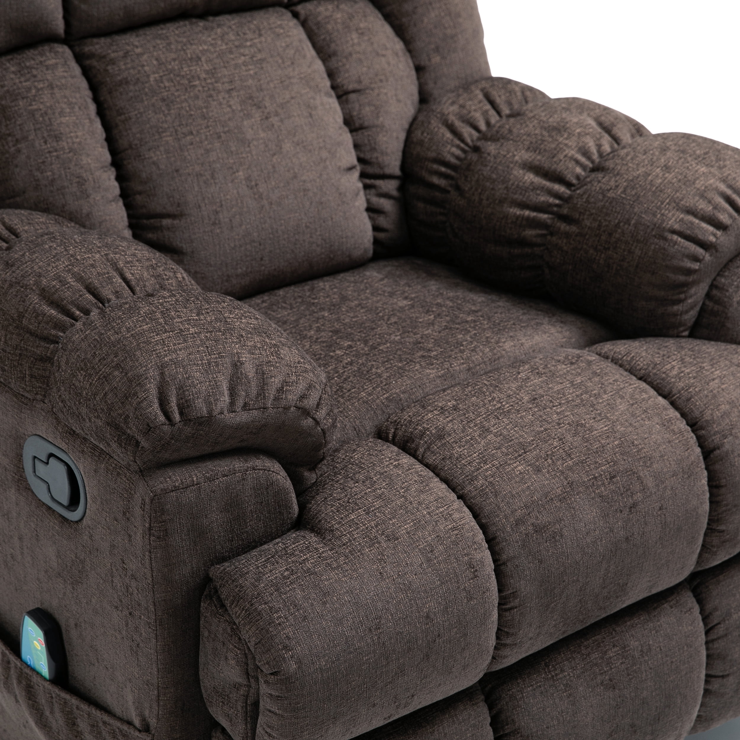 Offer you and your family the most comfortable seating experience they can have right in your own home. Featuring five massage modes, two intensity levels, four target areas, and a heating function, our massage recliner will have everyone unwinding in utter bliss. This includes a wired remote control for easy operation as well as a pull ring that allows you to recline in satisfaction. Finished with a cozy pillow tufted design for maximum comfort and a handsome look, this massage recliner is as stylish as it is functional. CONTEMPORARY DESIGN: Featuring a stunning pillow tufted design and clean lines, our massage recliner offers the look, feel, and design of a truly contemporary piece. With a minimalistic yet refined structure, this set brings out a simplistic style that emphasizes comfort and functionality. MASSAGE AND HEATING FEATURES: Featuring five massage modes and two intensity levels, this massage recliner targets the four major parts of your body to give you a fully relaxing experience. Modes include pulse, press, wave, auto, and normal on high and low intensity. Not only can you choose to massage your back, lumbar portion, thighs, and legs but you can also use a heating function to warm up your lumbar area. REMOTE CONTROL INCLUDED: This recliner offers a wired remote control that makes it easy for you to operate the massage and heat functions, allowing you to effortlessly select what mode you want to enjoy. RECLINING FUNCTION: This manual recliner uses a convenient ring pull lever to position the chair into its reclining state. To bring the chair back into its upright position, simply tilt your body weight forward and upwards and push the footrest down. DIMENSIONS: Choose an accessory that is the perfect size for you and your furniture. This recliner is 36.00” W x 38.50” D x 40.50” H and opens up to 36.00” W x 64.50” D x 32.25” H. You will love how much your space can transform with the simple addition of this charming recliner.