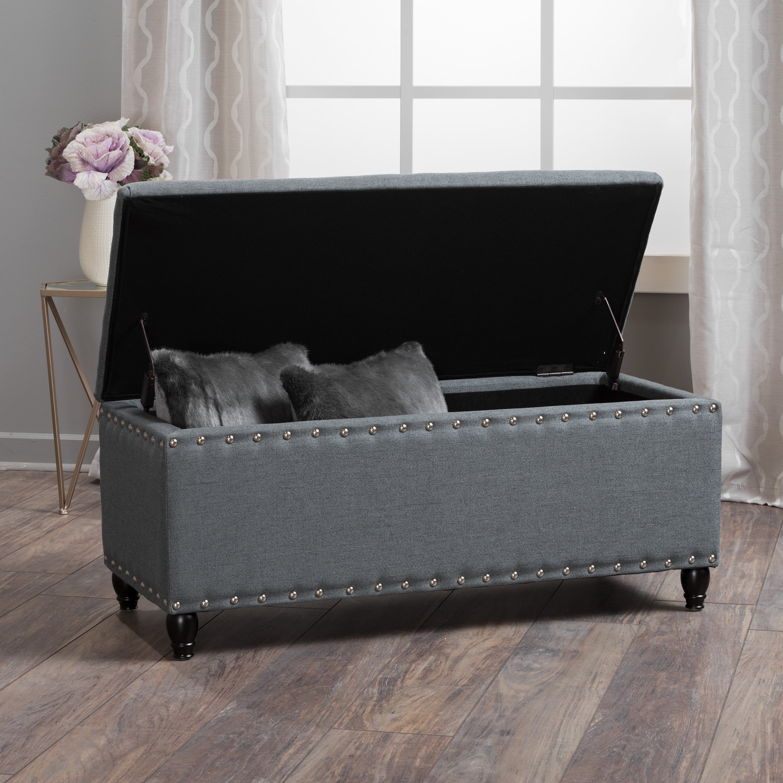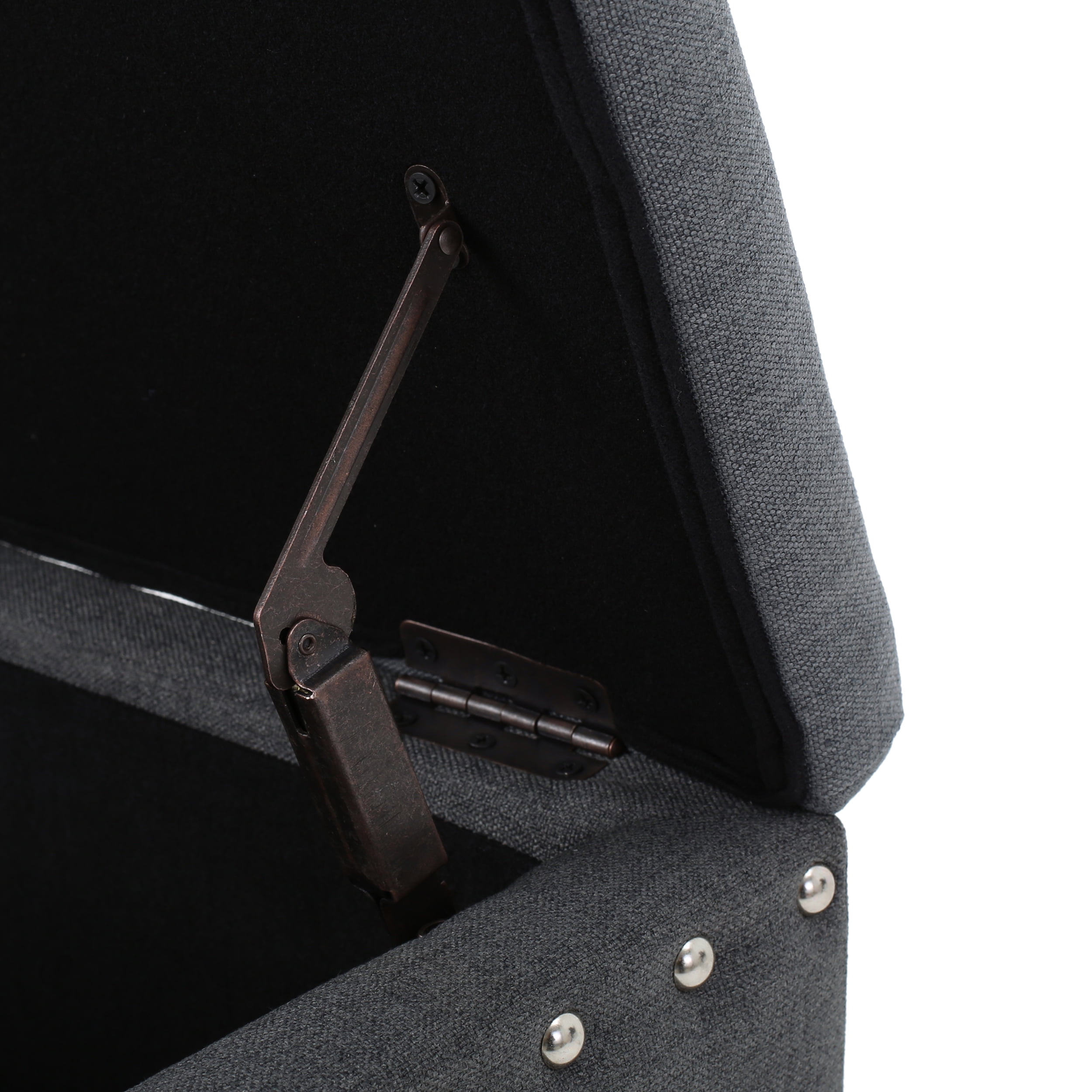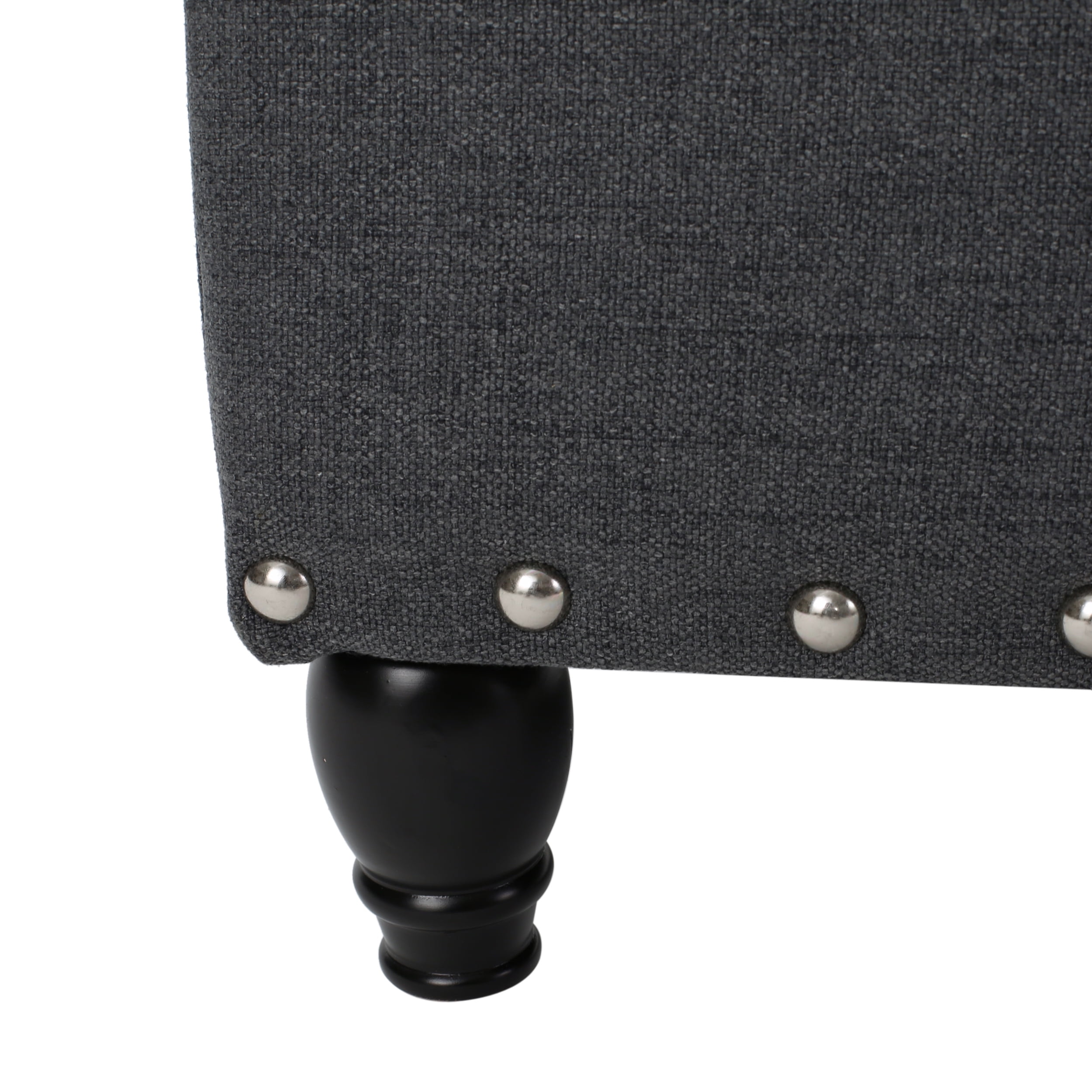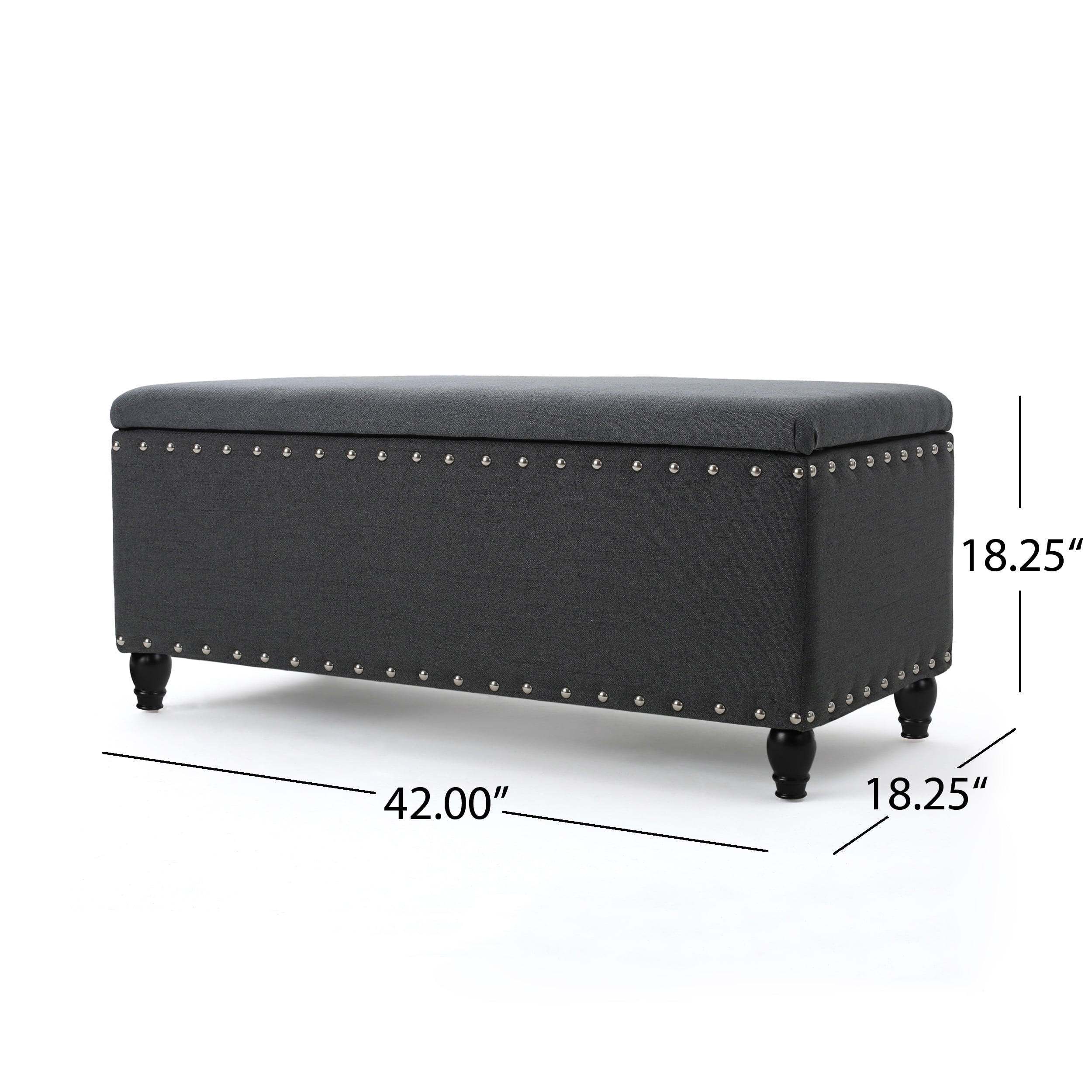Includes: One (1) Storage Ottoman Material: Fabric Fabric Composition: 100% Polyester Leg Material: Birch Wood Color: Charcoal Leg Finish: Dark Brown Hand-Crafted Details Assembly Required Dimensions: 18.25 inches deep x 42.00 inches wide x 18.25 inches high