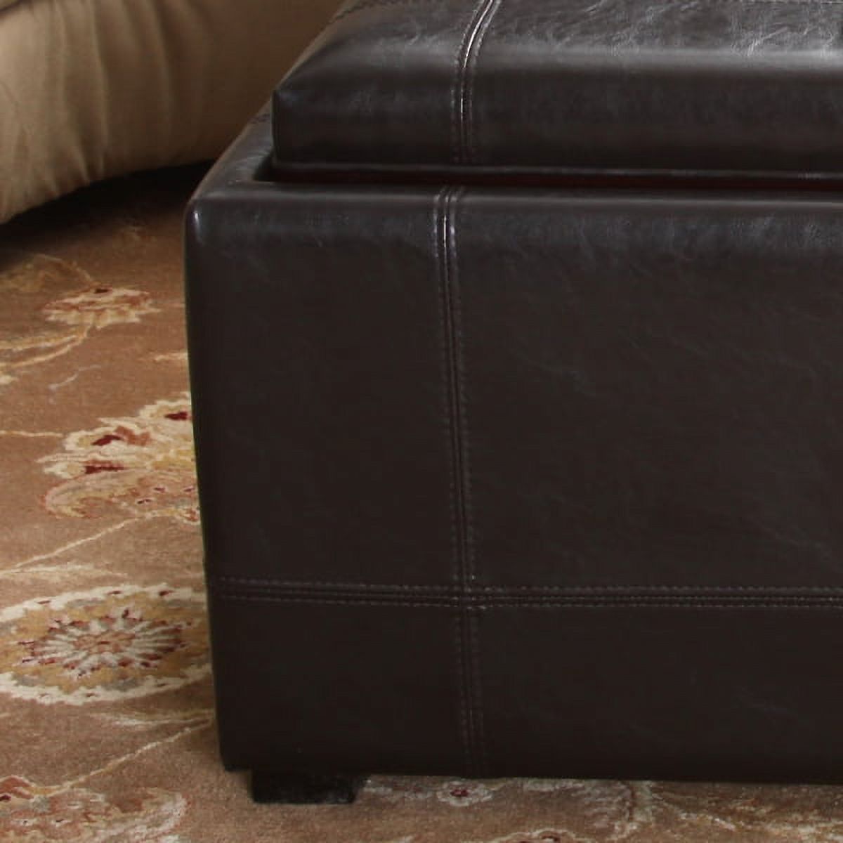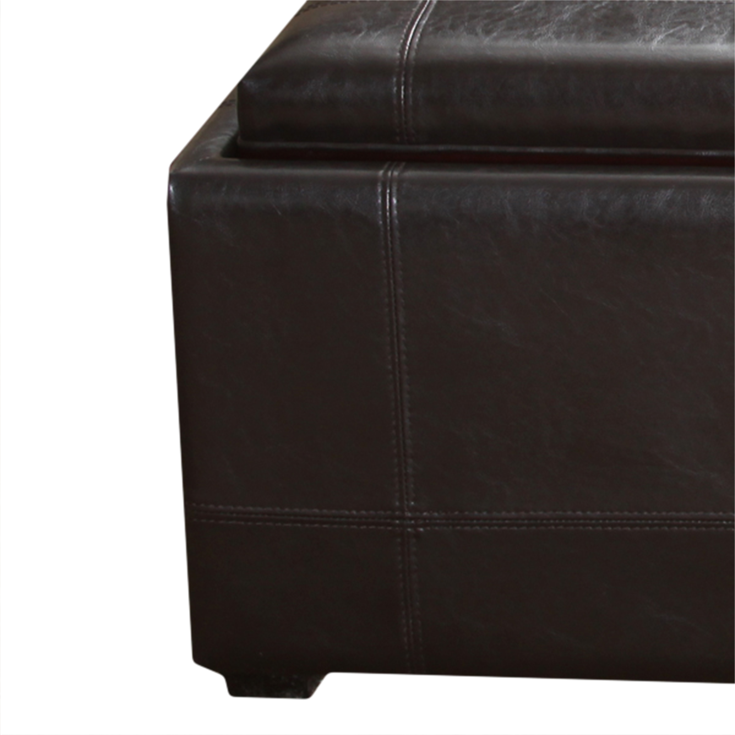 Includes one storage ottoman with a tray top and two cube ottomans that nest inside Made of sturdy hardwood and bonded leather Slightly padded for comfort Espresso brown upholstery Storage ottoman measures 18.5″H x 21.75″W x 41″D with inside dimensions of 13.5″H x 17″W x 36″D Each cube ottoman measures 13″H x 15″W x 15″D