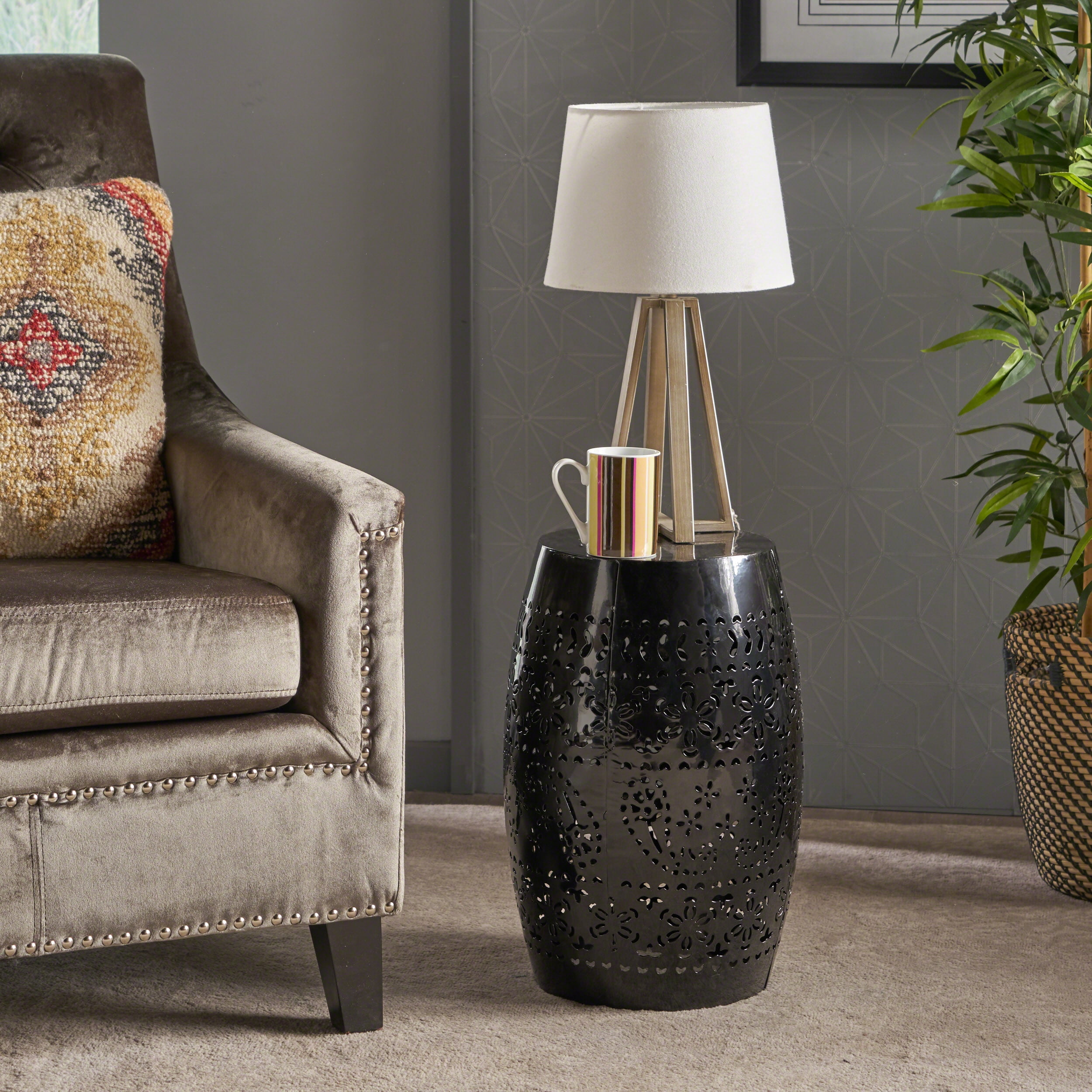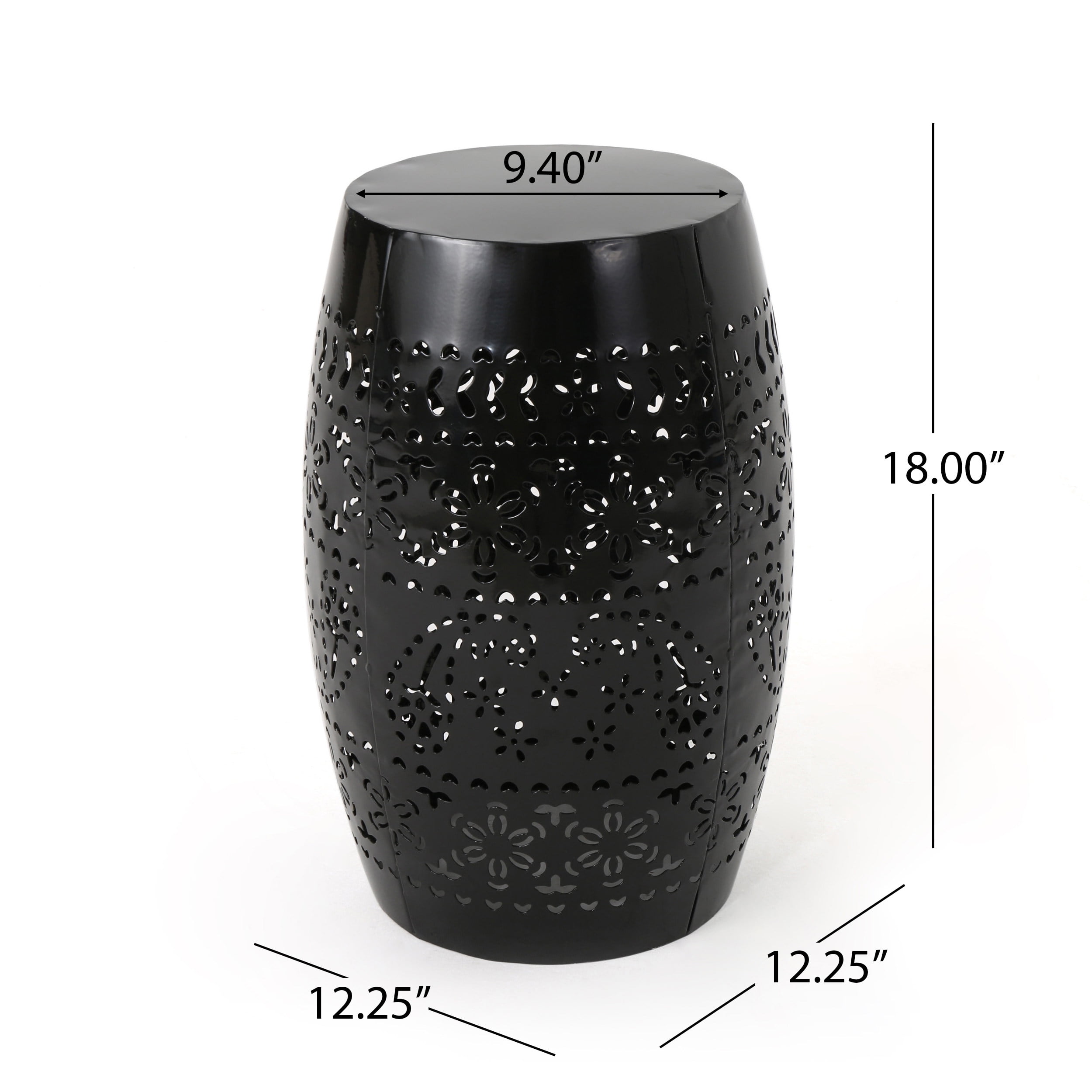 Whether you’re using this in your backyard space or in your living room, combine this accessory with your favorite chair to create a cozy corner. With a sleek, modern barrel structure, this end table is an excellent sidekick to your existing outdoor or indoor furniture, perfect for holding a tray of snacks or a pitcher of lemonade. The frame of our side table features a beautiful lace cut pattern, making this great for any area in need of something new. MODERN DESIGN: With clean, precise lines, our side is the ideal modern accessory for your space. Finished with a charming barrel structure and lace-cut design, this table not only offers a chic, minimalistic look but also provides incredible structure. LACE CUT DESIGN: Refined with a lace cut design, the frame of this table brings an elegant touch to the overall piece, making it an understated yet chic addition to your home. METAL FRAME: Constructed of powder-coated iron, the frame of this table is made to be incredibly durable, ensuring that this piece will hold up under use. DIMENSIONS: Choose an accessory that is the perfect size for you and your furniture. This accent table measures to be 12.25” W x 12.25” D x 18.00” H. You will love how much your space can transform with the simple addition of this charming table. NO ASSEMBLY: This accent table comes ready to use straight out of the box. No assembly is required.