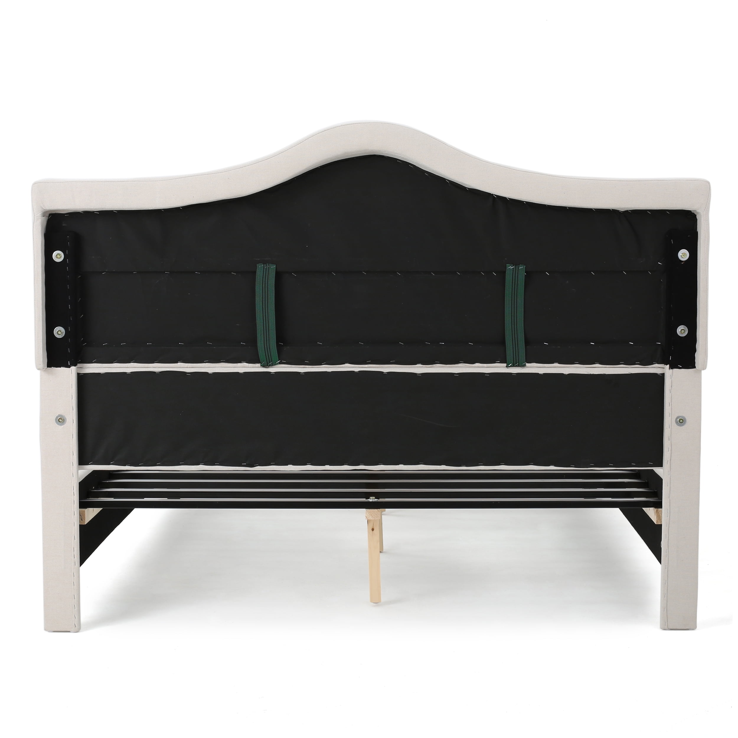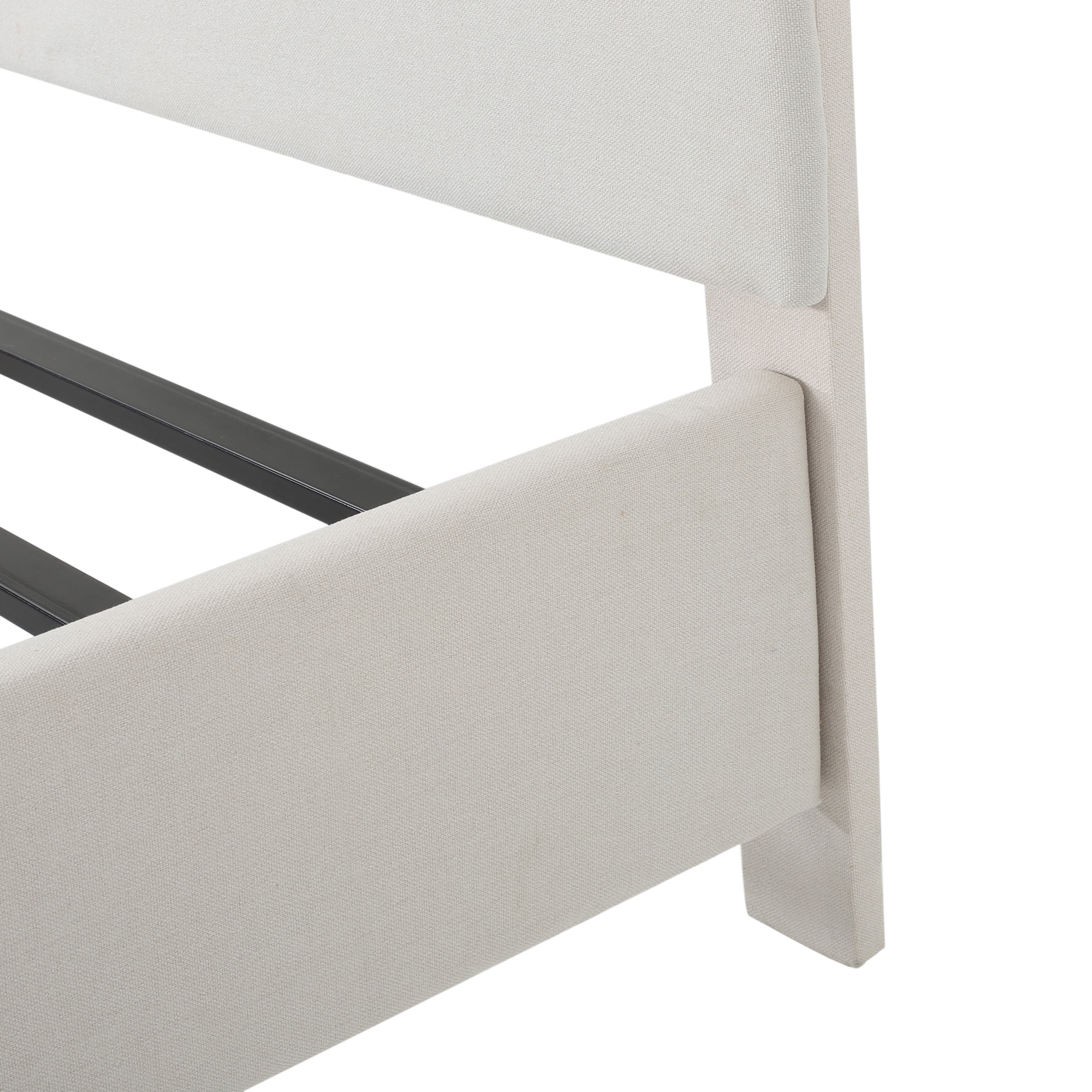 Includes: One (1) Frame and One (1) Headboard Material: Fabric (100% Polyester), Birch, and Iron 87.30 inches deep x 65.75 inches wide x 50.00 inches high Color: Ivory Leg Finish: Dark Brown Assembly Required