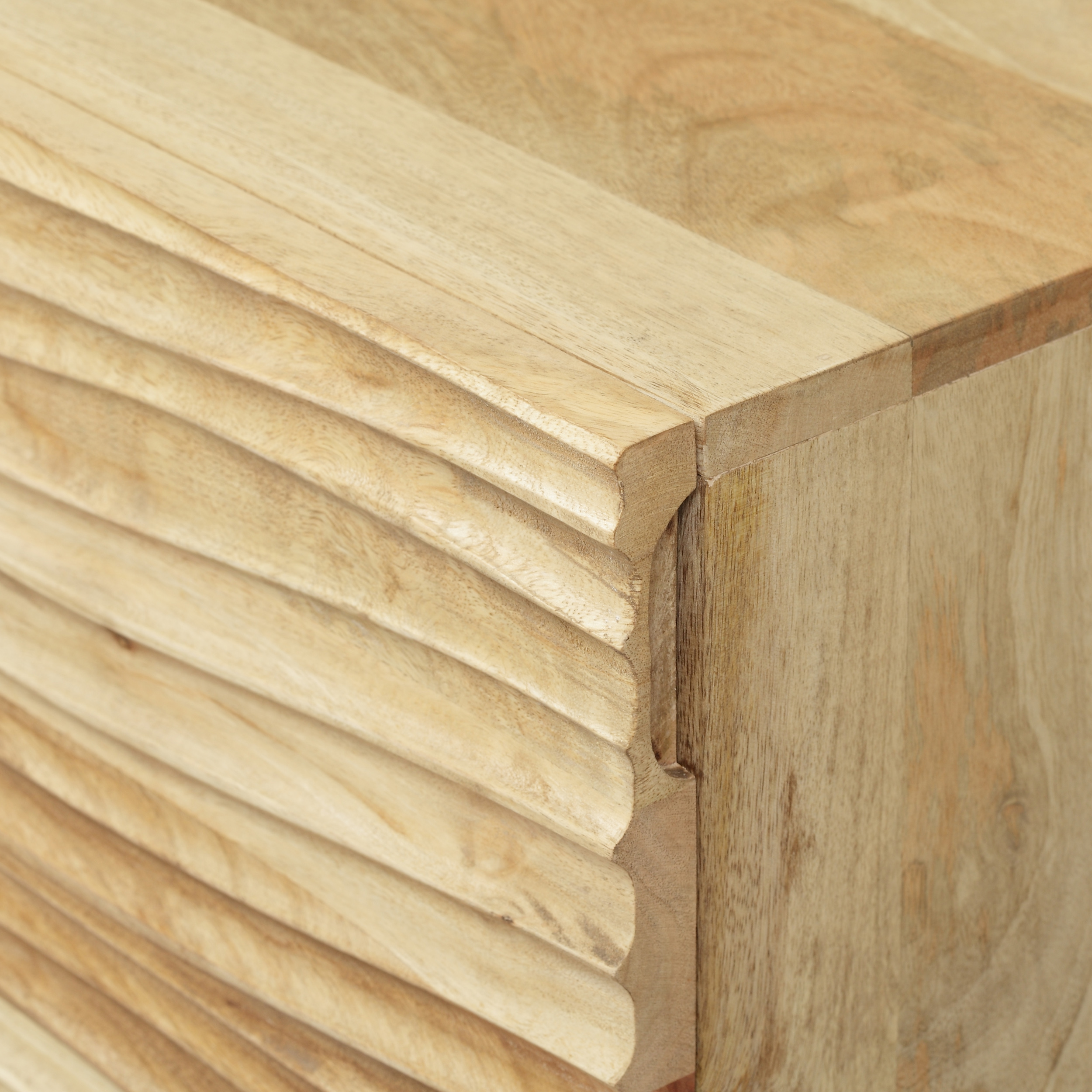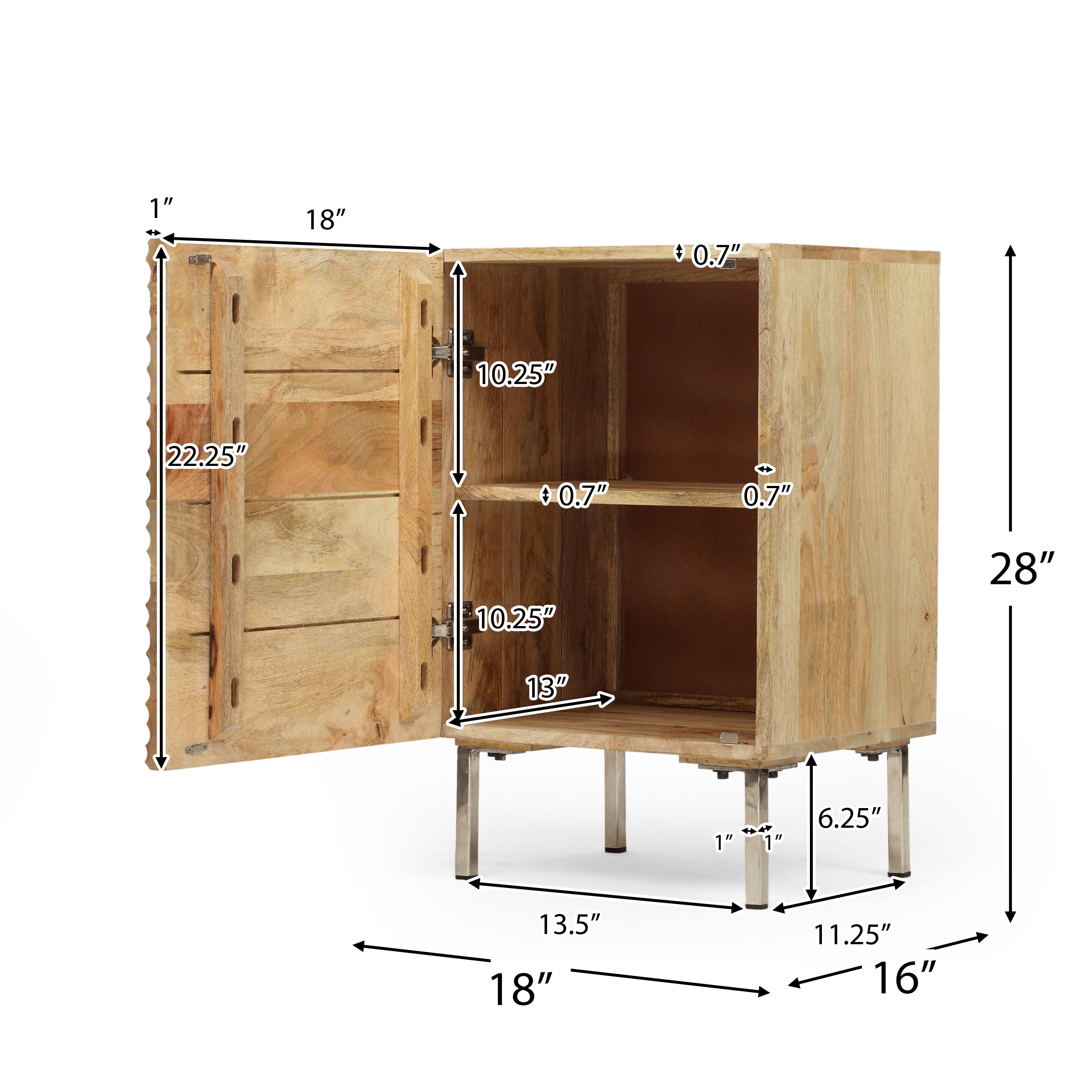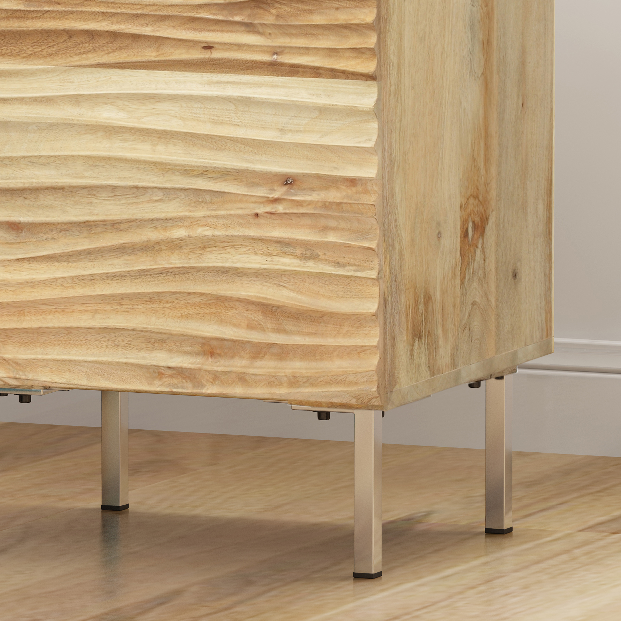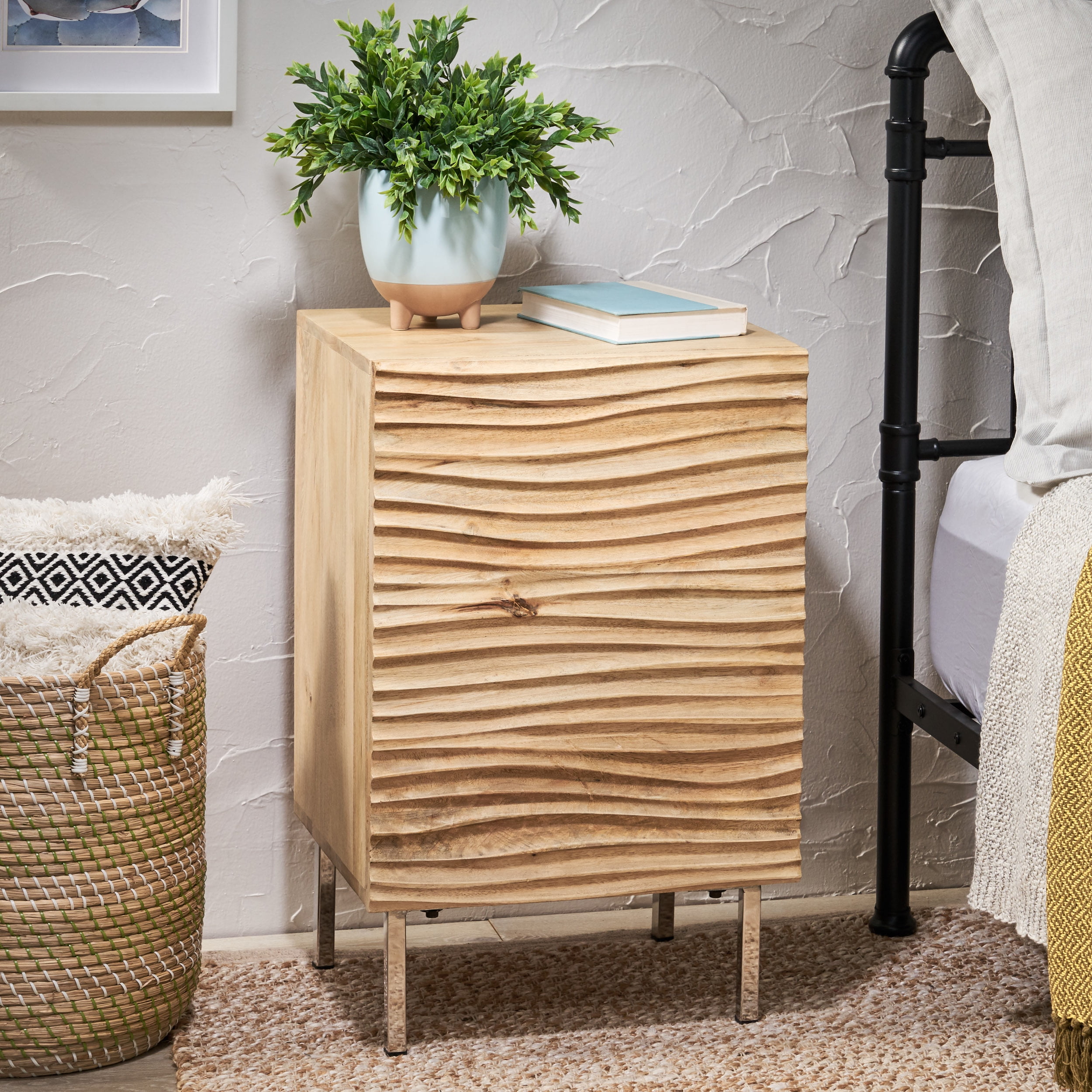 Incorporate a charming, creative piece into your home while still maintaining incredible functionality for an impressive upgrade in decor. Featuring beautiful mango wood for a one-of-a-kind style, this accessory offers an artsy modern look for your home with its uniquely designed cabinet door. This textured nightstand is completed with shelving space, giving you ample room to organize your items. With a minimalistic yet exquisite design, our nightstand will easily enhance your decor, bringing out the best of your interior space. MODERN DESIGN: With clean, precise lines, our nightstand is the ideal modern accessory for your interior space. Finished with a wave design on the cabinet door and slim iron legs, this nightstand not only offers a sleek, minimalistic look but also provides incredible textures that make this a work of art. MANGO WOOD: Mango wood features gorgeous golden browns with natural hues that come from spalting, making each piece a one-of-a-kind color. Not only does this hardwood showcase unique patterns and take well to stains, but it also offers dense durability to resist wear and tear. STORAGE SPACE: This nightstand offers one cabinet space that contains one shelf for storing and organizing your items. DIMENSIONS: Choose an accessory that is the perfect size for you and your furniture. This nightstand is 18.00” W x 16.00” D x 28.00” H. You will love how much your space can transform with the simple addition of this charming nightstand. ASSEMBLY REQUIRED: Some assembly is required for this nightstand. All of the instructions and tools needed for assembly are included.