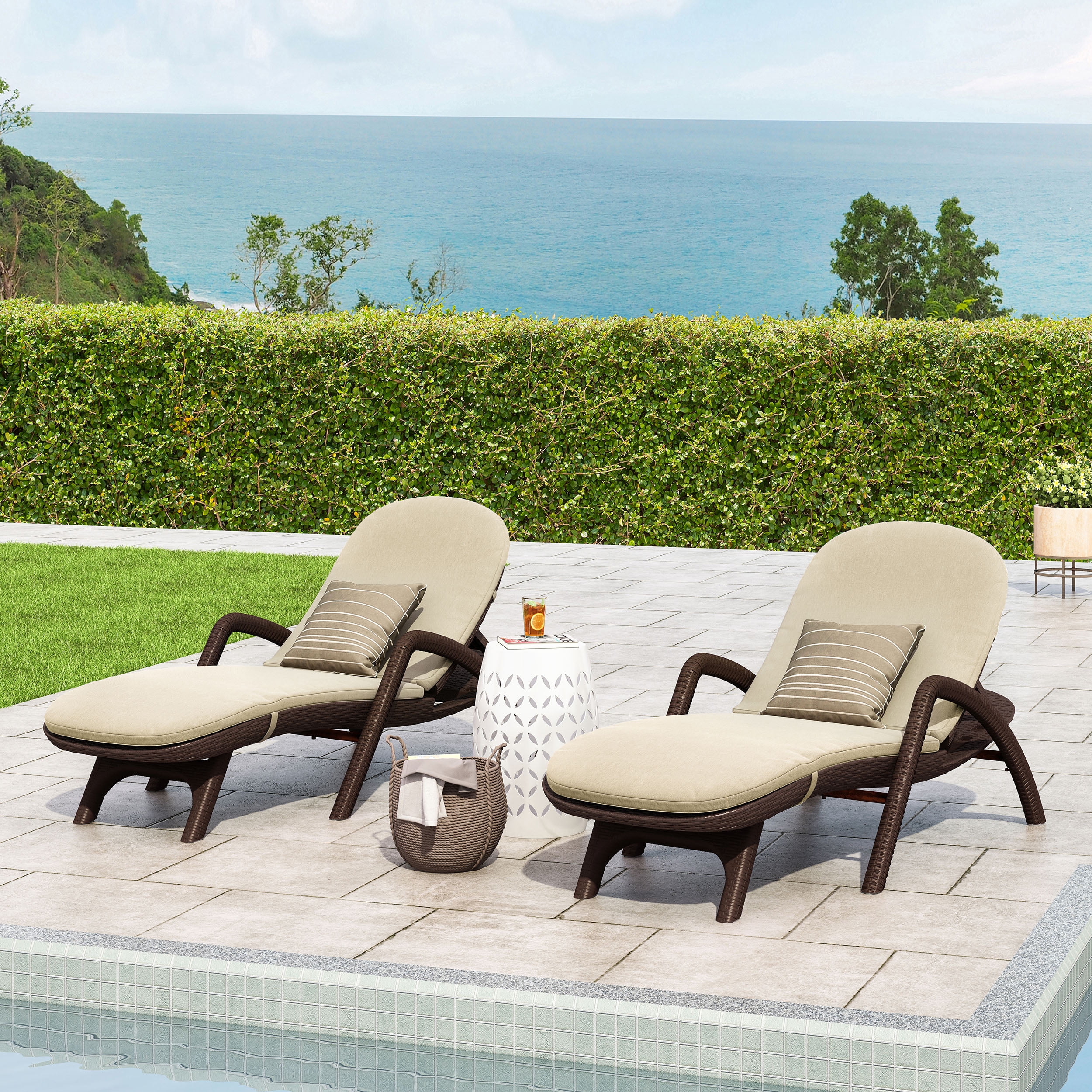 Includes: Two (2) Chaise Lounges with Cushion Cushion Material: Water Resistant Fabric Cushion Composition: 100% Polyester Finish: Dark Brown Cushion Color: Beige Hand-Crafted Details Assembly Required Dimensions: 76.50 inches deep x 32.25 inches wide x 21.00-37.00 inches high Seat Dimensions: 43.00 inches deep x 28.00 inches wide x 14.25 inches high Arm Height: 21.00 inches