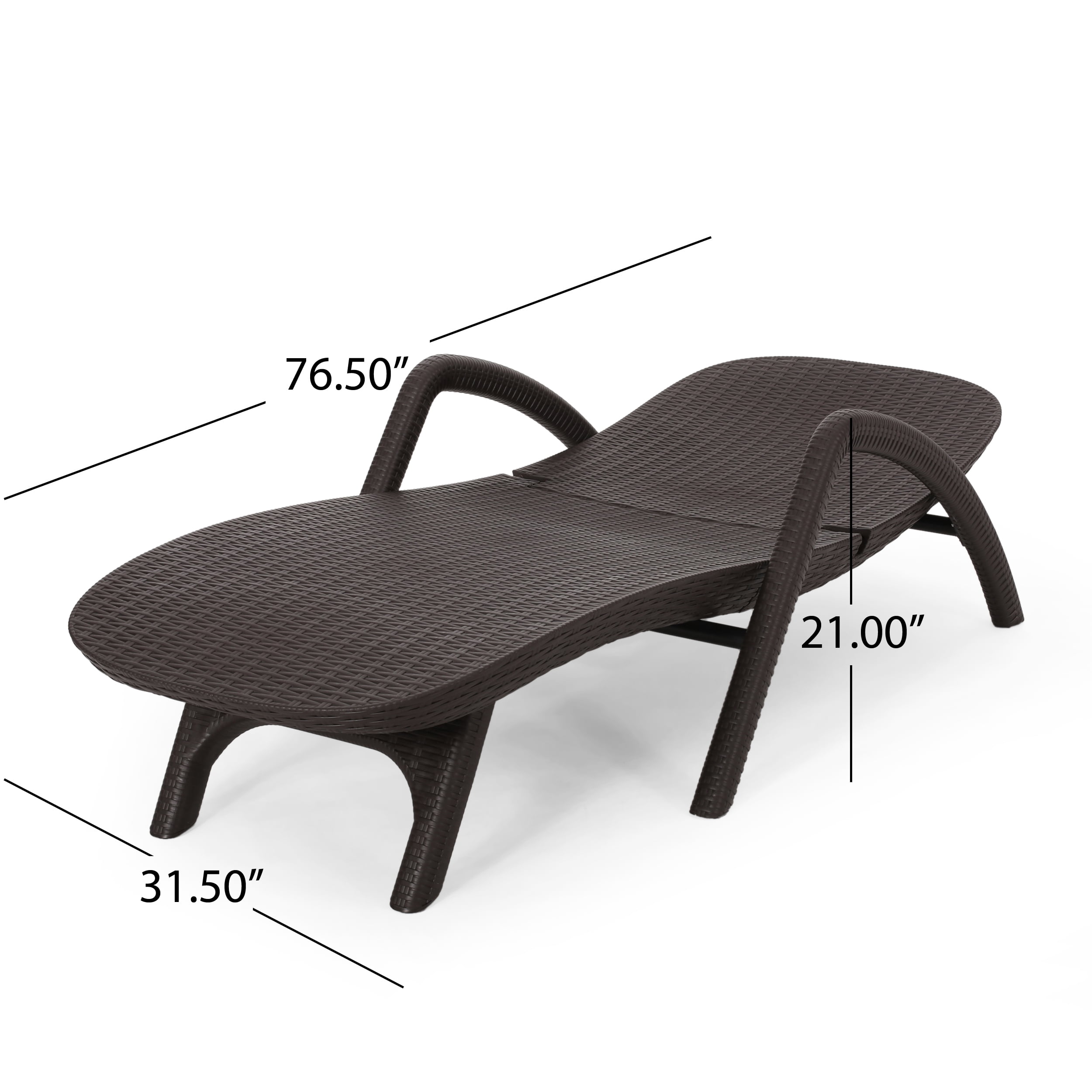 Turn your backyard or patio space into a stunning oasis that will have you welcoming the sunshine with a smile. Featuring a remarkable polypropylene material of durable design, our outstanding chaise lounge set uses advanced technology to create an astonishingly stable frame that will last you for years to come. This minimalistic design balances clean-cut lines and elegant curves with an impressive wicker-like look to create a sturdy structure and an adjustable backrest that brings an extra boost of comfort to your home. POLYPROPYLENE RESIN: Created with high-quality, specially designed polypropylene, our chaise lounge set is made to be highly durable and weather-resistant. Each individual component of our polypropylene blend is specifically chosen to create a unique mixture that ensures that your product is of the best quality. Using a process called injection molding, this resin is injected into a mold and cooled to harden into an incredibly durable product. WICKER-LIKE TEXTURE: Our chaise lounge mimics an elegant woven design that brings a homey atmosphere to your outdoor space. Our polypropylene material uses a 3-D pattern to create a texture that has the appearance of wicker and is also made to withstand outdoor weather without rusting or corroding. WEATHER-RESISTANT SURFACE: Our chaise lounge set consists of weather-resistant material, known to resist water and resist sunlight. This durable lounge set offers easy maintenance, emphasizing its functionality and convenience. DIMENSIONS: Choose an accessory that is the perfect size for you and your furniture. Each chaise lounge is 31.50” W x 76.50” D x 21.00” H. You will love how much your space can transform with the simple addition of this charming lounge set. This comes as a set of two. ASSEMBLY REQUIRED: Some assembly is required for this chaise lounge set. All of the instructions and tools needed for assembly are included. Features: Includes: Two (2) Chaise Lounges Material: Polypropylene Resin Finish: Dark Brown Hand-Crafted Details Assembly Required Specifications: Chaise Lounge Dimensions: 76.50″ D x 31.50″ W x 21.00″ H Arm Height: 21.00″
