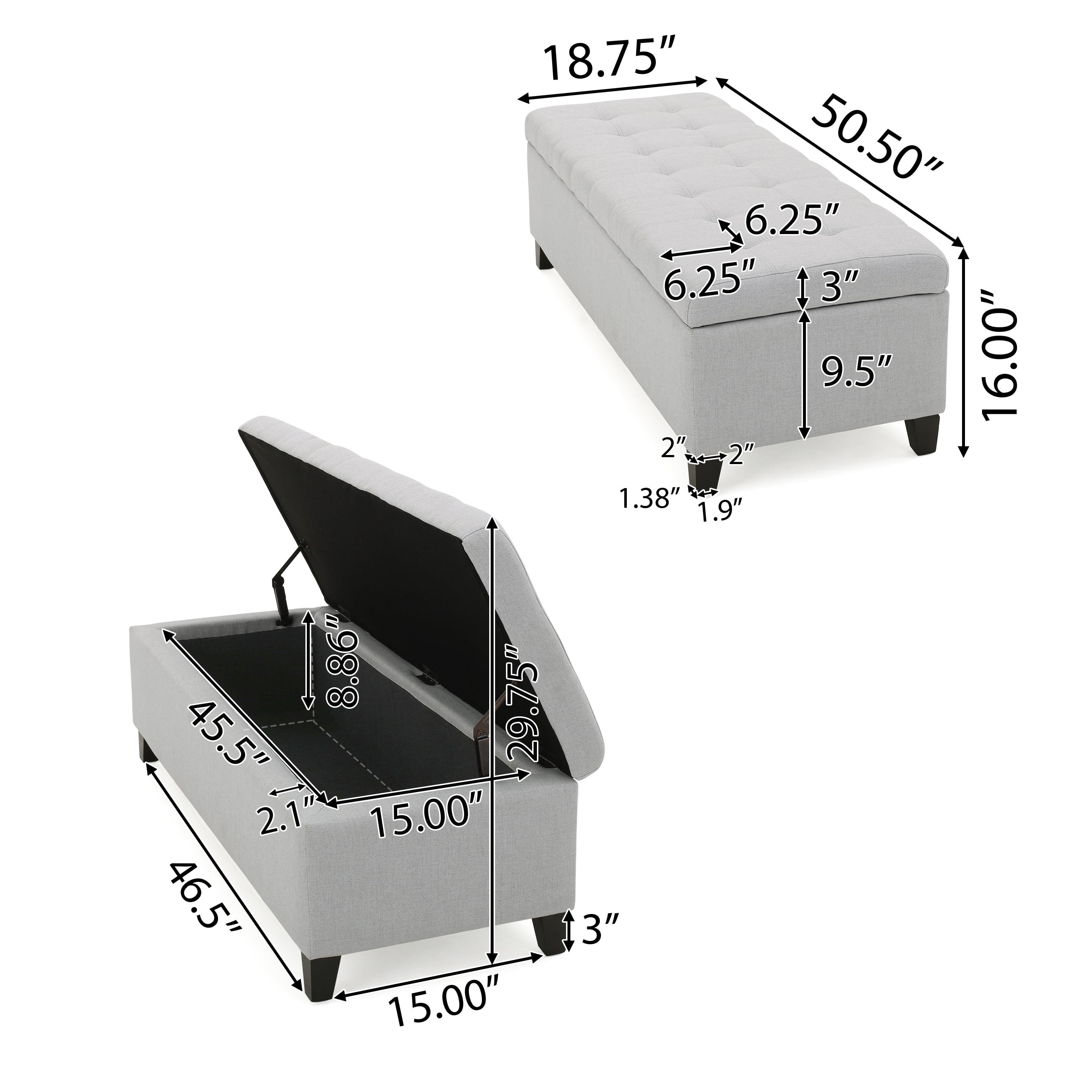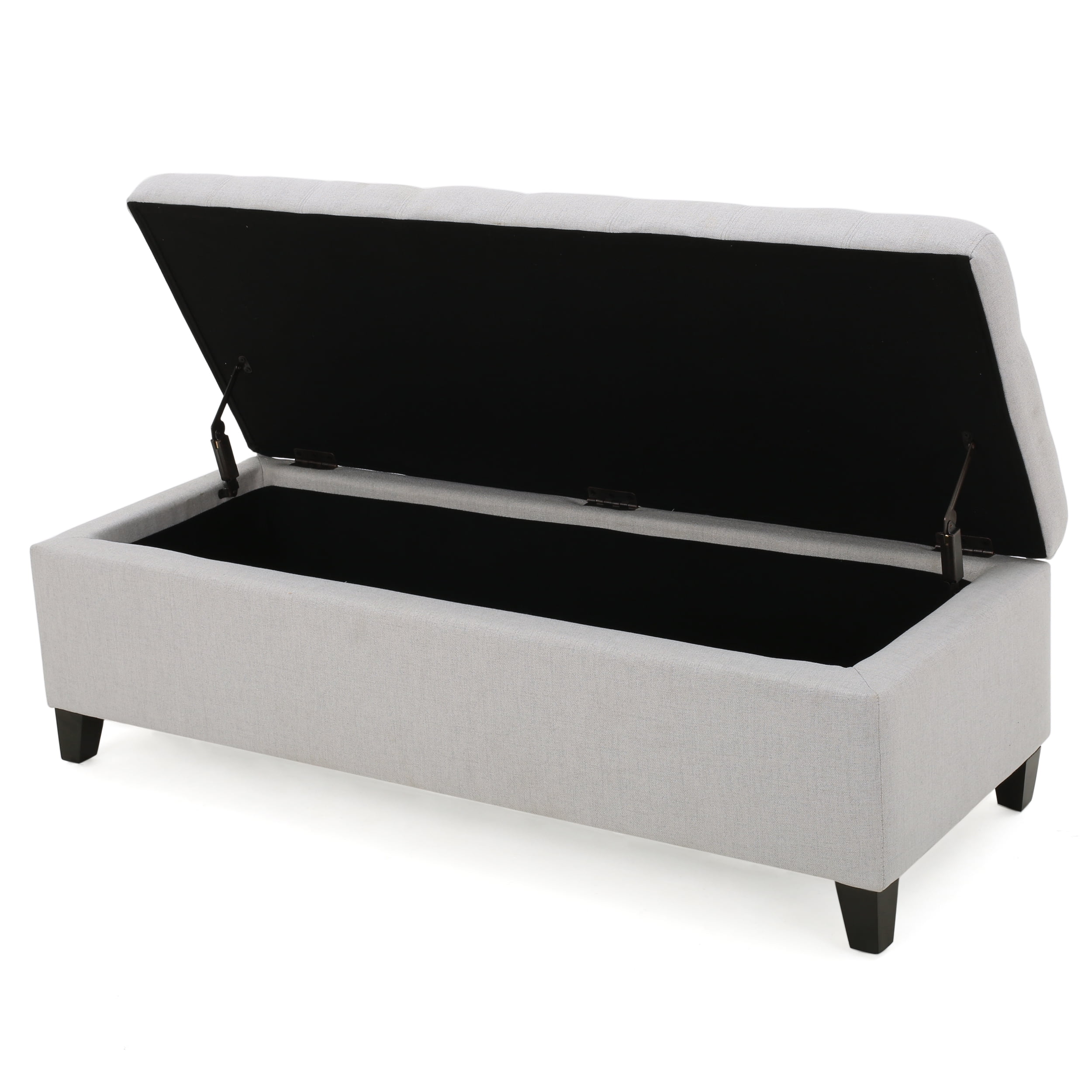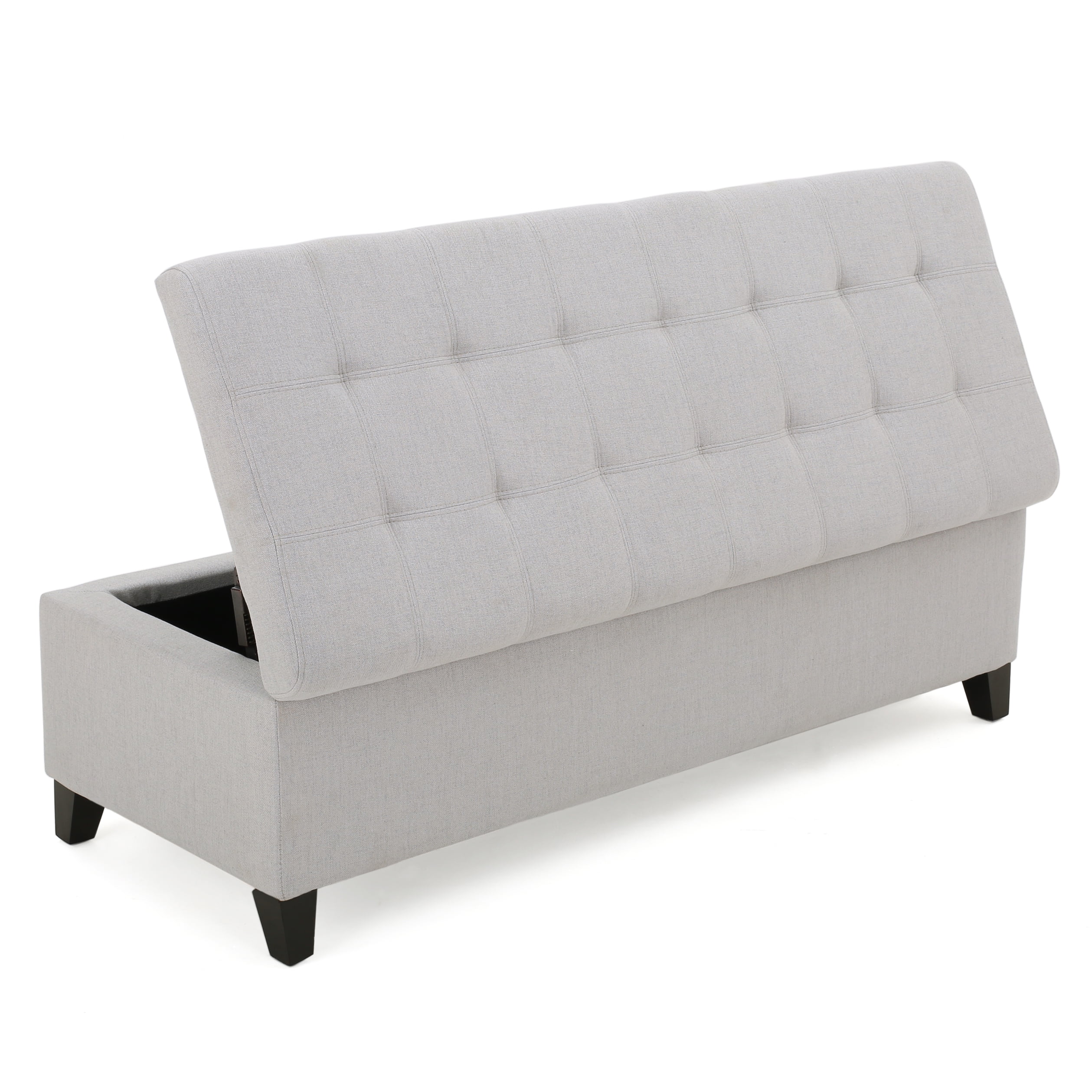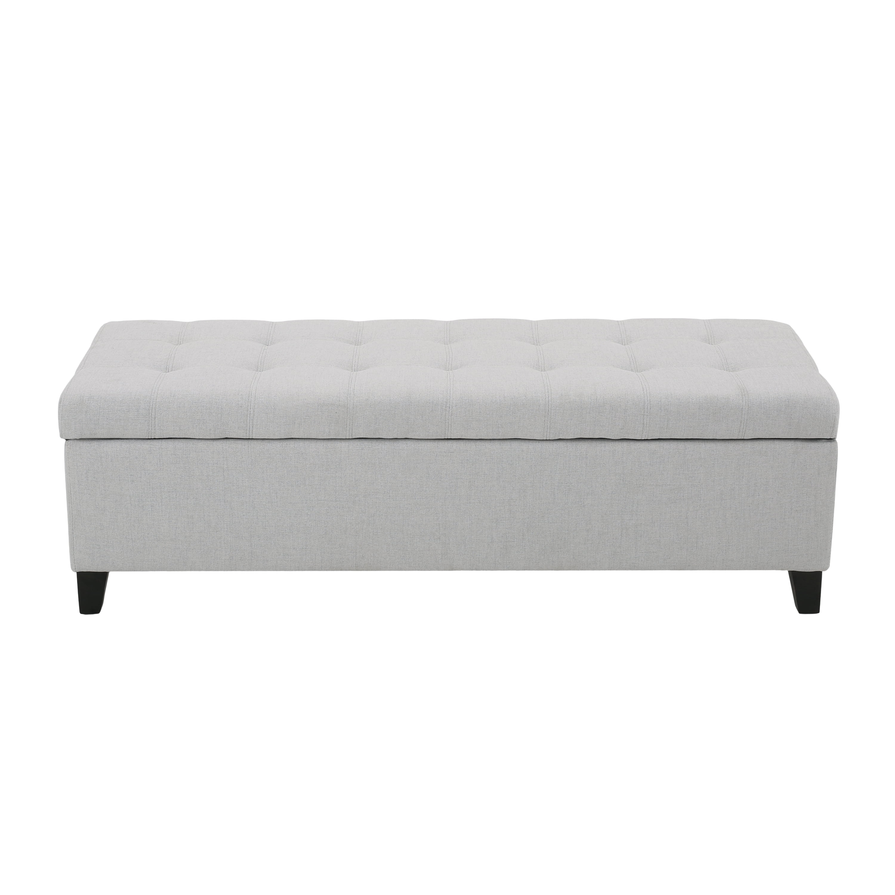 Noble House Wester Field Light Grey Fabric Storage Ottoman: Includes: One (1) Ottoman Bench Material: Fabric Leg Material: Birch Wood Multiple Color Options Leg Finish: Dark Brown Hand-Crafted Details Assembly Required Dimensions: 18.75 inches deep x 50.50 inches wide x 16.00 inches high Weight Capacity: 125 lbs.