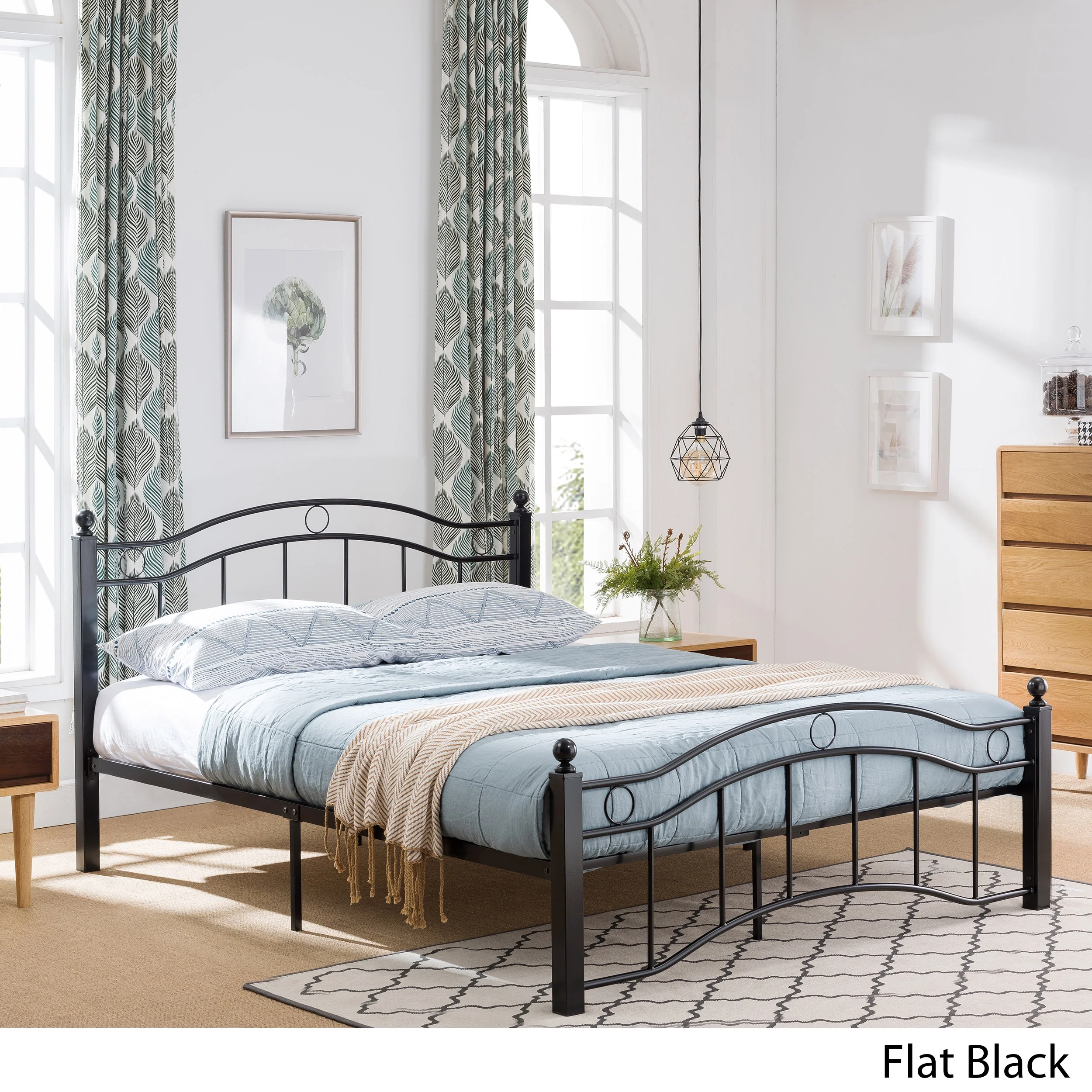 Combining classic convention with modern appeal, our metal bed frame strikes a delicate balance between old and new. This stylish frame offers a timeless elegance for your home while providing a low profile and sturdy slat design to eliminate the use of a box spring. Featuring classic finials at each post and an intriguing geometrical motif ornamenting both the headboard and footboard, this sophisticated bed frame is built with iron to imbue the room with a feeling of contemporary style. CONTEMPORARY: Our bed frame set has the look, feel, and design of contemporary style with its camelback silhouette, wideset pipe slats, and traditional knob posts. With a classy and functional design, this bed frame will give your room an instant upgrade in style and comfort. IRON FRAME: The sturdy construction of this iron frame ensures that this bed will hold up under heavy use. This sleek look is accented with geometric elements, adding to the modern design of this frame. LOW PROFILE: This bed set features a platform frame that eliminates the need for a box spring. This allows for your mattress to be placed directly on the frame without the extra hassle. SLATS: This bed frame comes with multiple iron slats and a center bar for substantial support. These horizontal slats offer additional reinforcement for any mattress of your choice. ASSEMBLY REQUIRED: Some assembly is required for this bed frame. All of the instructions and tools needed for assembly are included.