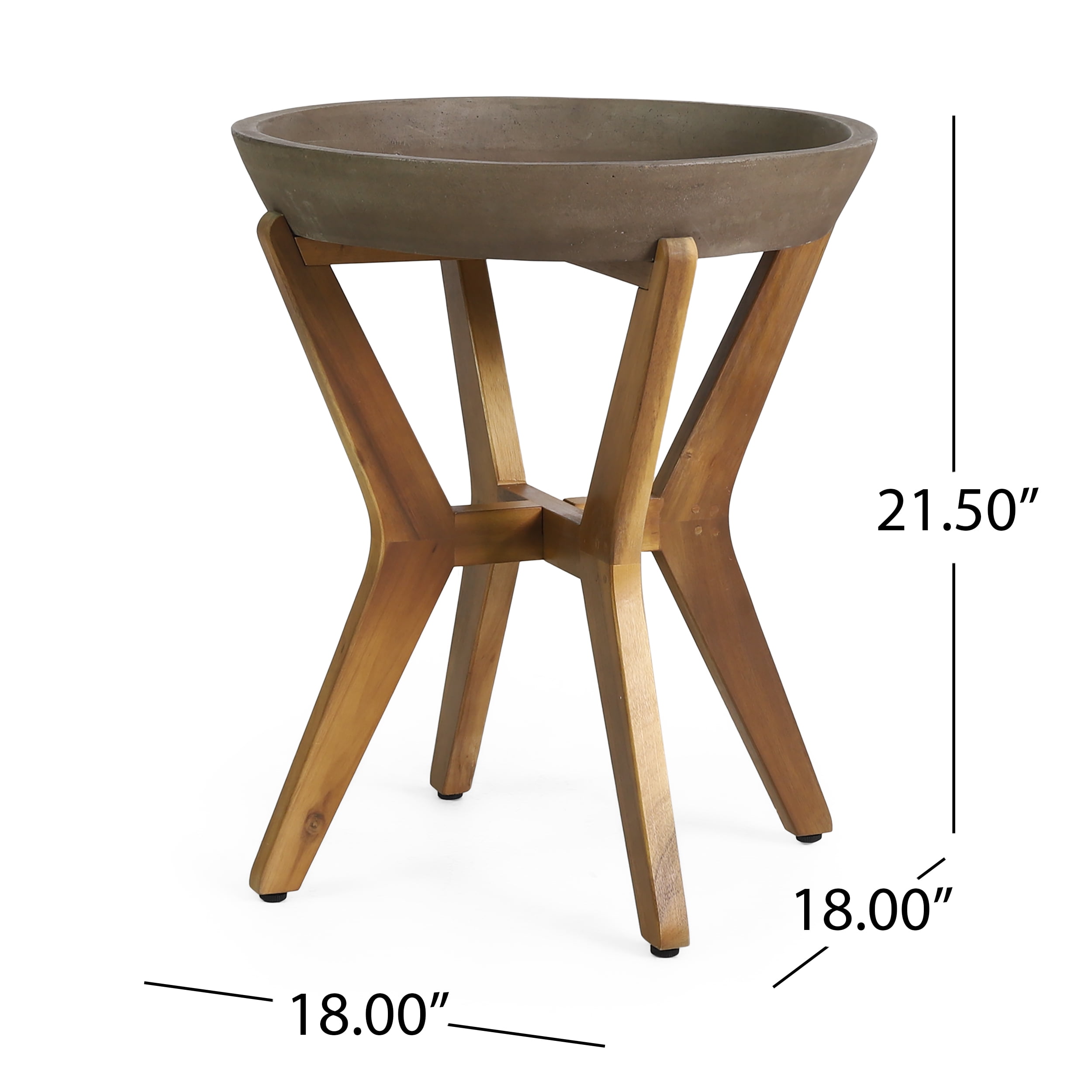 Includes: One (1) Side Table Tabletop Material: Lightweight Concrete Frame Material: Acacia Wood Tabletop Finish: Light Gray Frame Finish: Teak Hand-Crafted Details Assembly Required Dimensions: 18.00 inches deep x 18.00 inches wide x 21.50 inches high