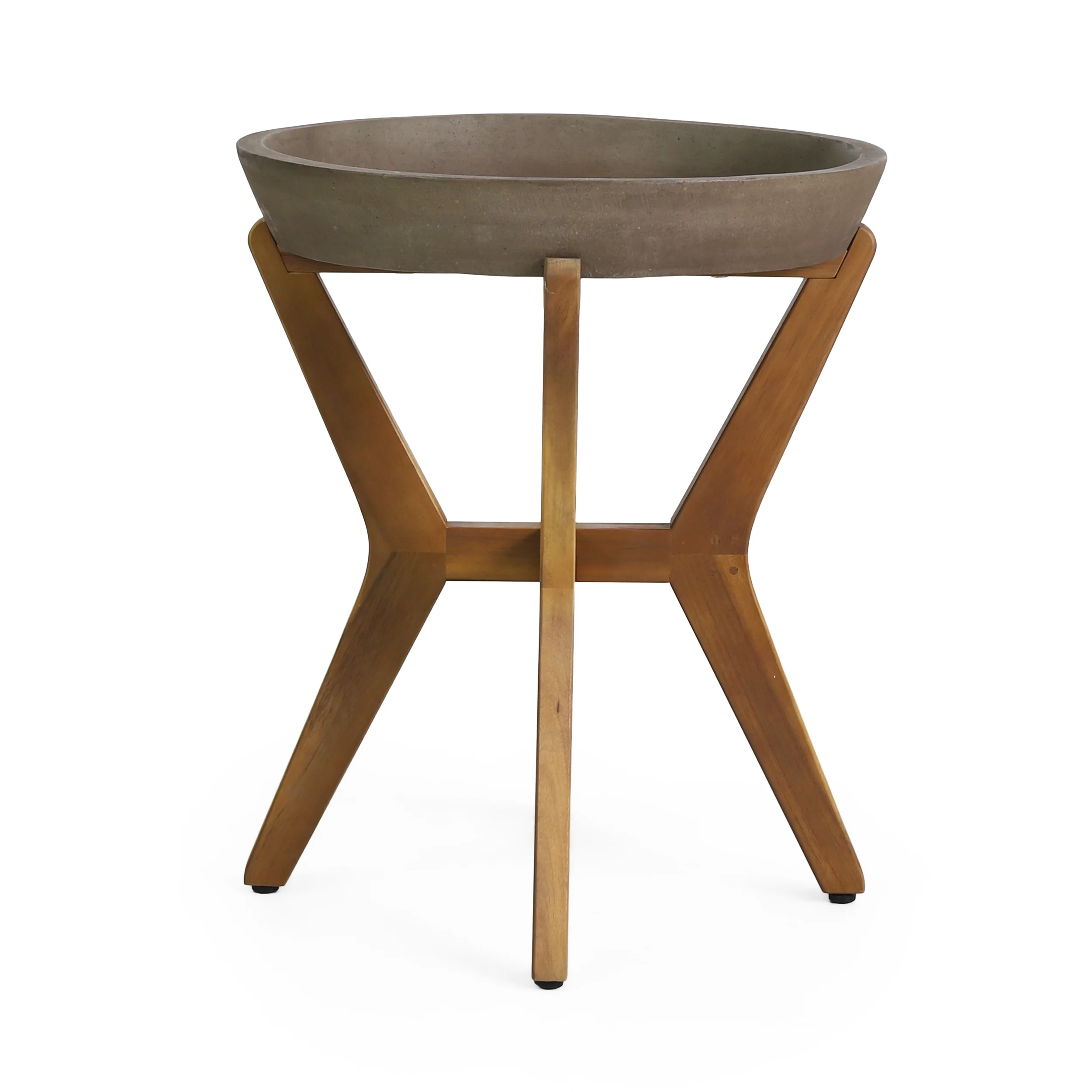 Bring a unique look to your outdoor space with a focal point that plays with mixed materials. With a smooth lightweight concrete tabletop and acacia wood frame, our side table offers high durability and stunning looks for your backyard or patio. Perfect as an end table next to your chat set or sectional, this piece will hold any snacks or chilled drinks in sophisticated grace. Finished with a round tabletop and splayed legs, this table is a seamless addition to any space.TOUCH OF PERSONALITY: Bring your outdoor space to life with our accent table that features a unique combination of a lightweight concrete tabletop and acacia wood frame. With charming aesthetics, this side table will be sure to enliven any backyard or patio.LIGHTWEIGHT CONCRETE: The tabletop of this piece constructed with lightweight concrete for a smooth look. This provides a highly durable structure that can hold a substantial amount of weight.ACACIA WOOD: Made with acacia wood that brings a sleek and exotic look to your space, this durable hardwood naturally withstands the elements and will not darken over time. Acacia wood is perfect as a solid, heavy frame that resists wear and tear.DIMENSIONS: Choose an accessory that is the perfect size for you and your furniture. This accent table is 18″ W x 18″ D x 21.5″ H. You will love how much your space can transform with the simple addition of this charming table.ASSEMBLY REQUIRED: Some assembly is required for this side table. All of the instructions and tools needed for assembly are included. Features: Includes: One (1) Side Table Tabletop Material: Lightweight Concrete Frame Material: Acacia Wood Tabletop Finish: Light Gray Frame Finish: Teak Assembly Required Specifications: Product Dimensions: 21.5″H x 18″W x 18″D