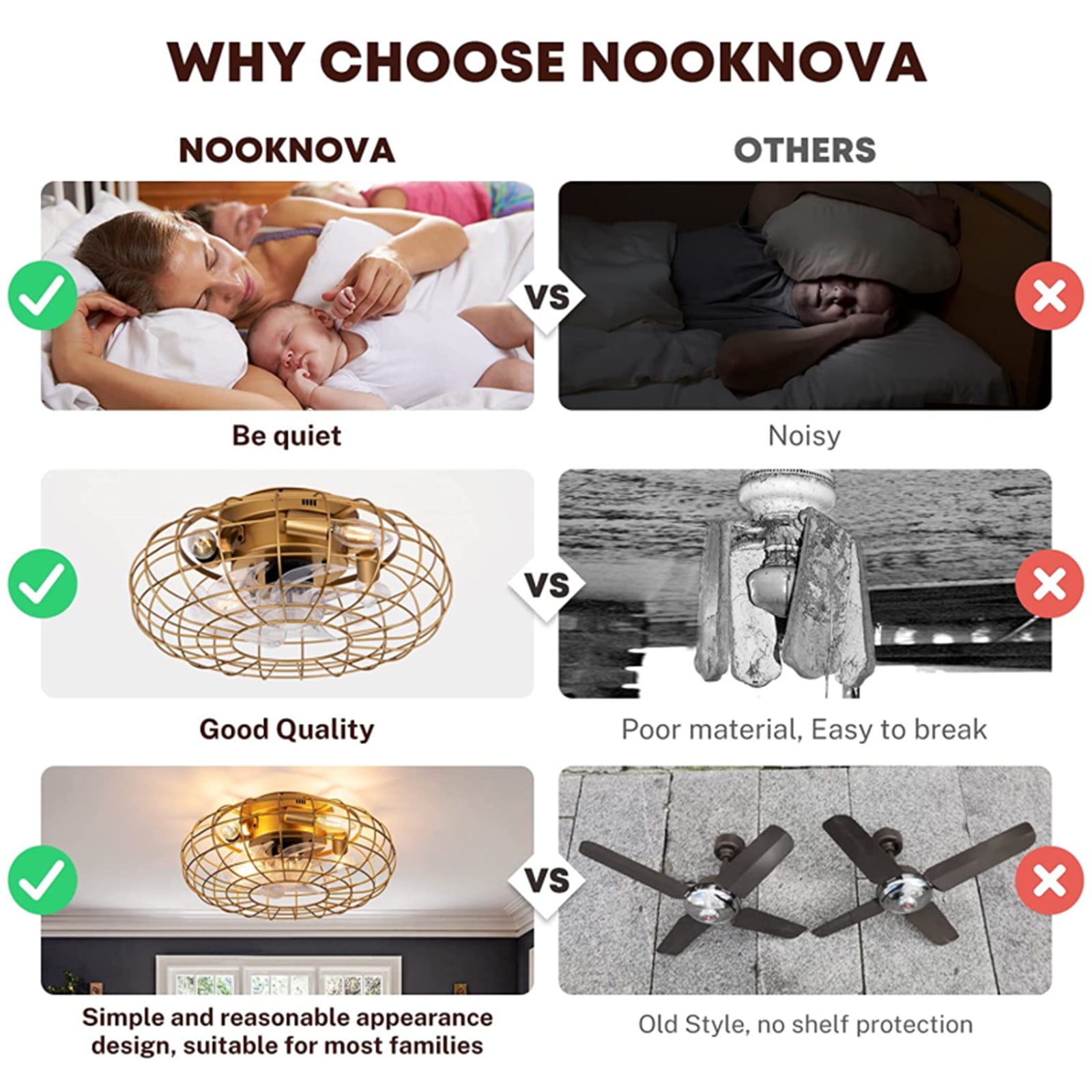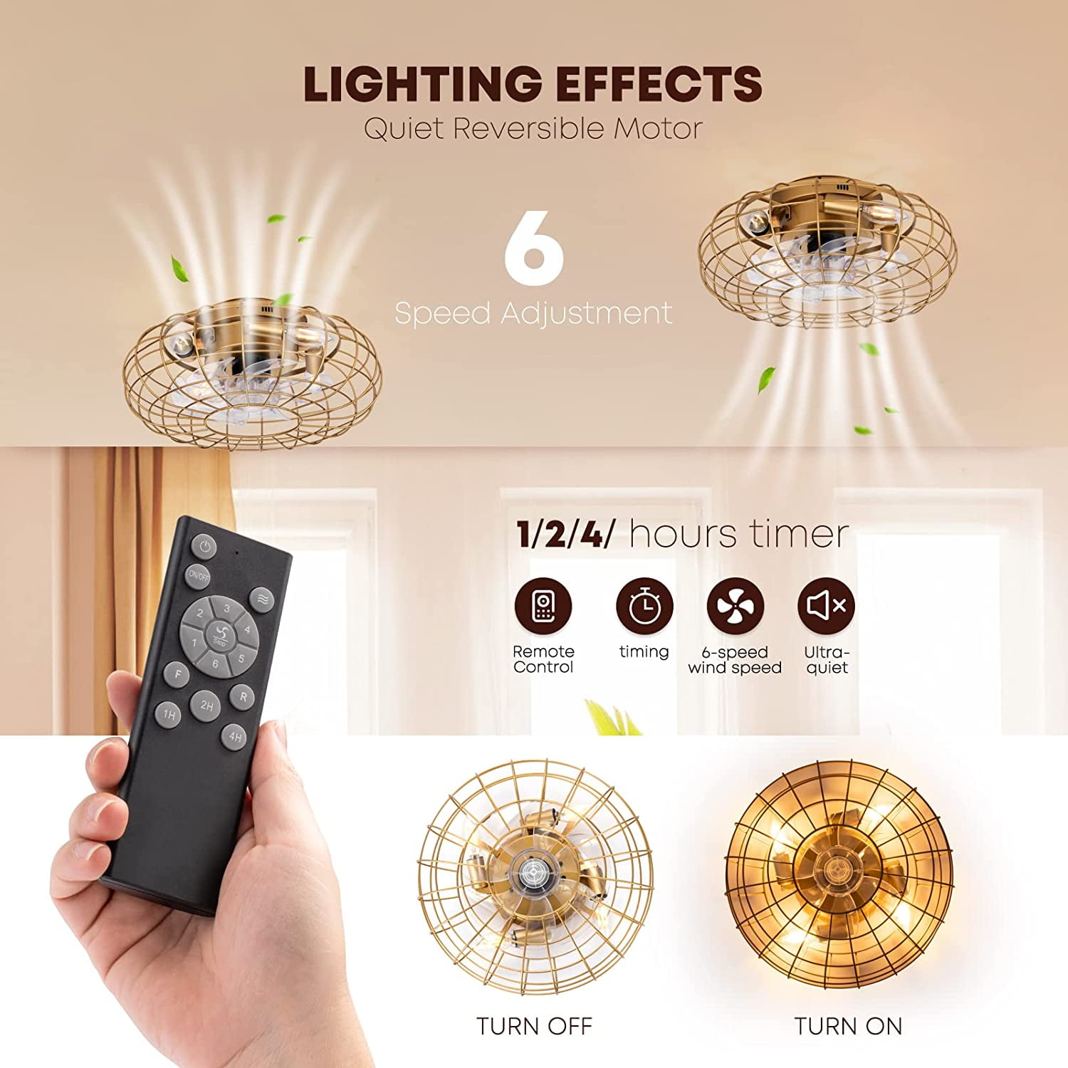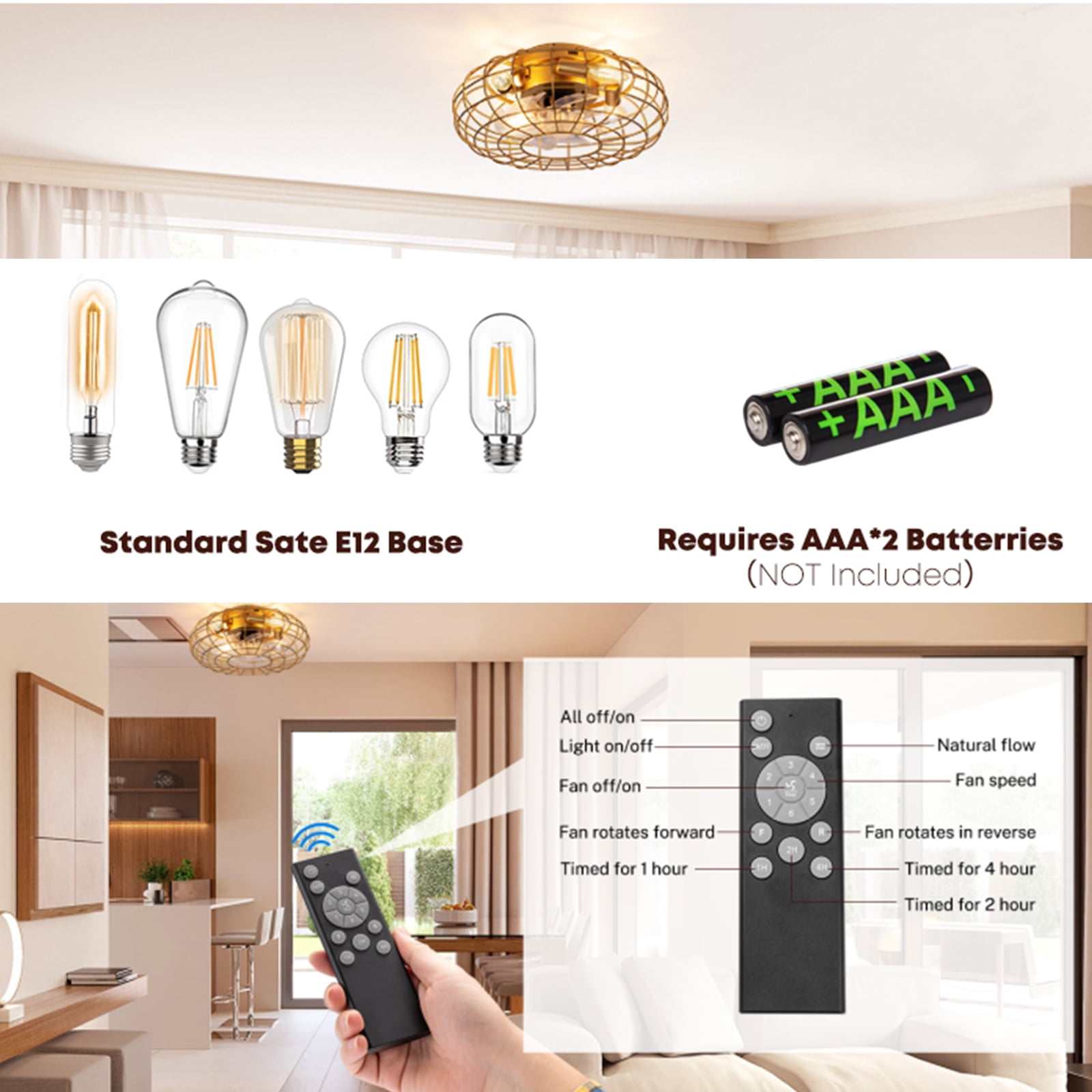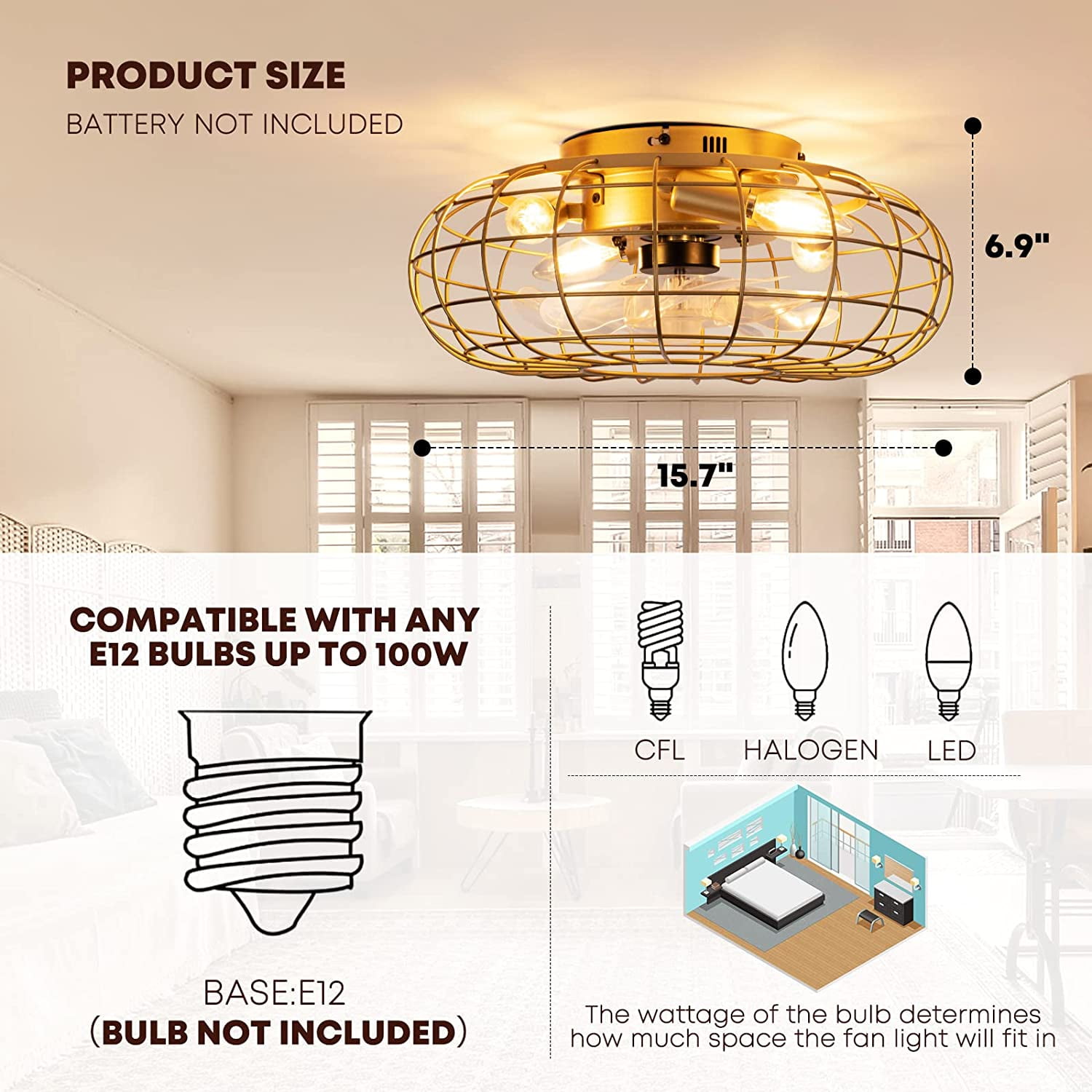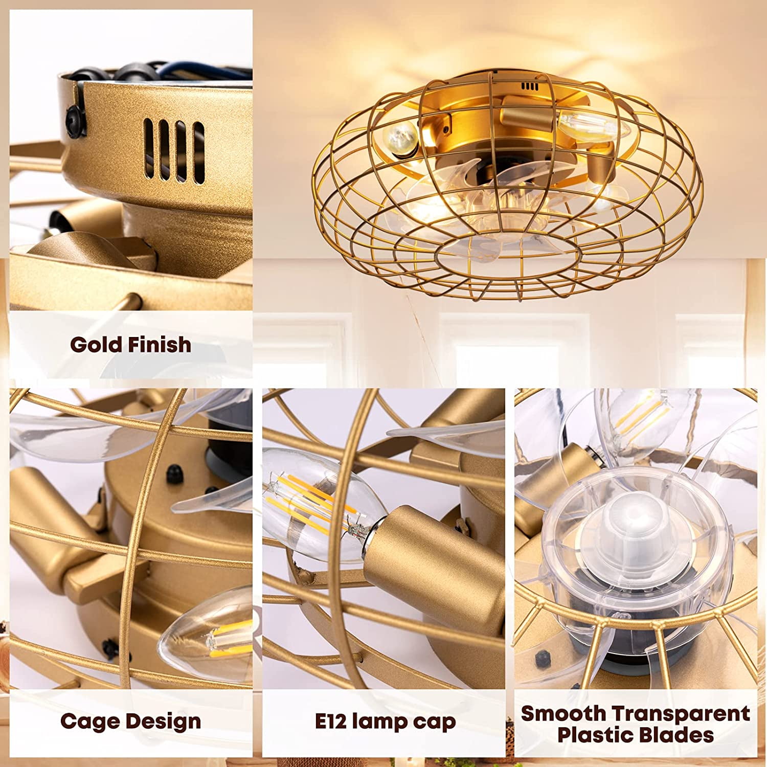 Nooknova 16″ Gold Caged Industrial Farmhouse LED Light Flush Mount Living Room Ceiling Fan with Remote Control Great & Safe Design: This bladeless caged ceiling fan measures approximately 15.7×15.7×6.9 inches, featuring built in recessed invisible blades for safety. The gold finish and cage design enhance the elegance of industrial style indoor spaces Smart Remote Control & 6 Wind Speeds: Control all functions of this 16 inch mini light fan with the remote, including 6 speed adjustments and a timer (1/2/4 hours). The fan and lighting functions can be used separately, with a one to one correspondence between each remote control and fan Reversible Motor: Easily switch between downdraft and updraft modes using the handheld remote. In summer, run the fan counterclockwise for a cooling breeze; in winter, run it clockwise to distribute heat evenly throughout the room Bulbs and Application Scenario: The NookNova enclosed ceiling fan requires 4 E12 base bulbs (100w max), compatible with incandescent, CFL, or halogen bulbs. Note: Bulbs are not included for safe transportation. This fan complements various indoor spaces, including living rooms, bedrooms, kitchens, and studies Easy to Install: All parts of the light fan come pre assembled for straightforward installation on the ceiling. If you are familiar with home circuits, installation can be done without an electrician. The fan can be linked to wall control or operated via remote
