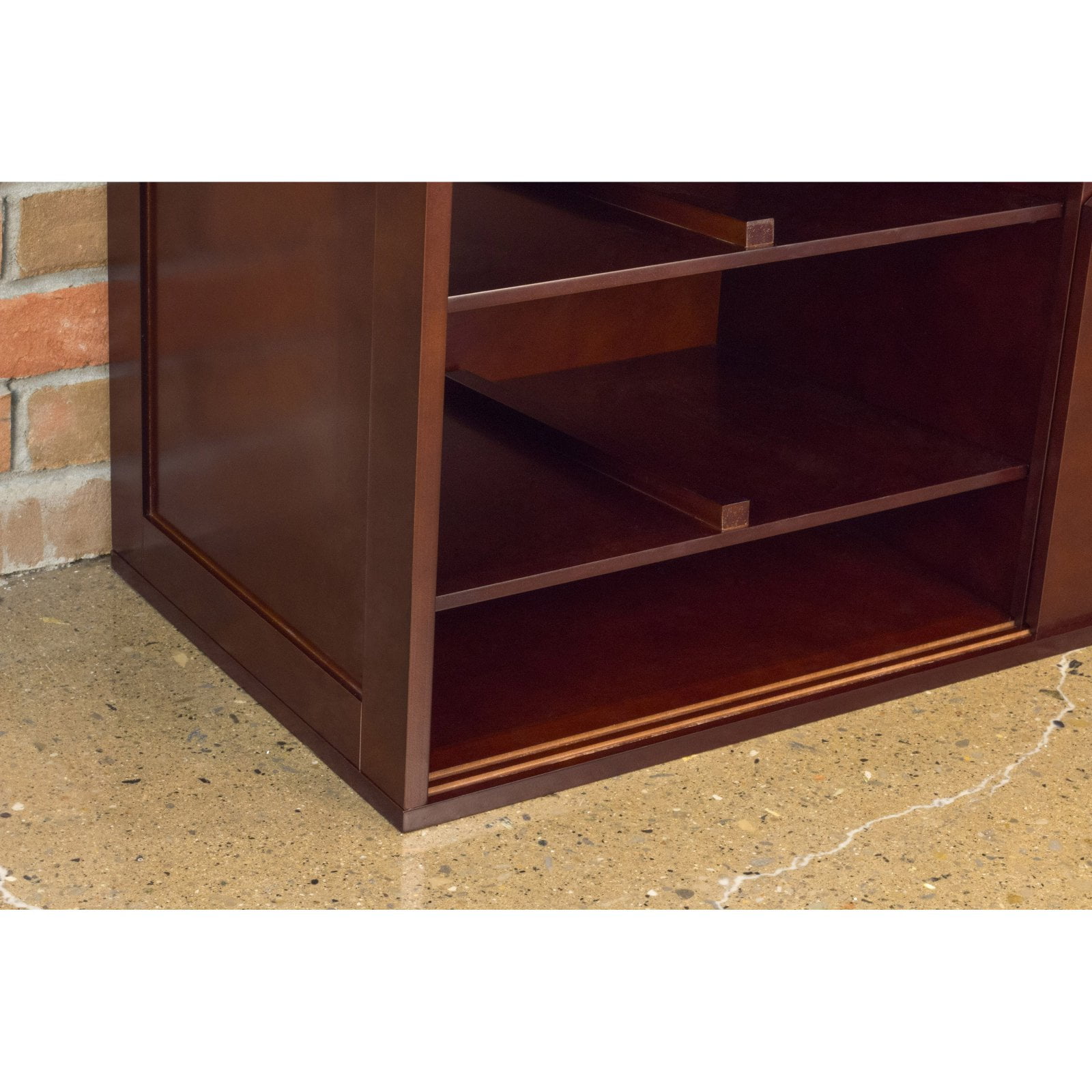 Concealed shoe storage with cushioned bench on top Two front doors with X-frame panels Two interior levels