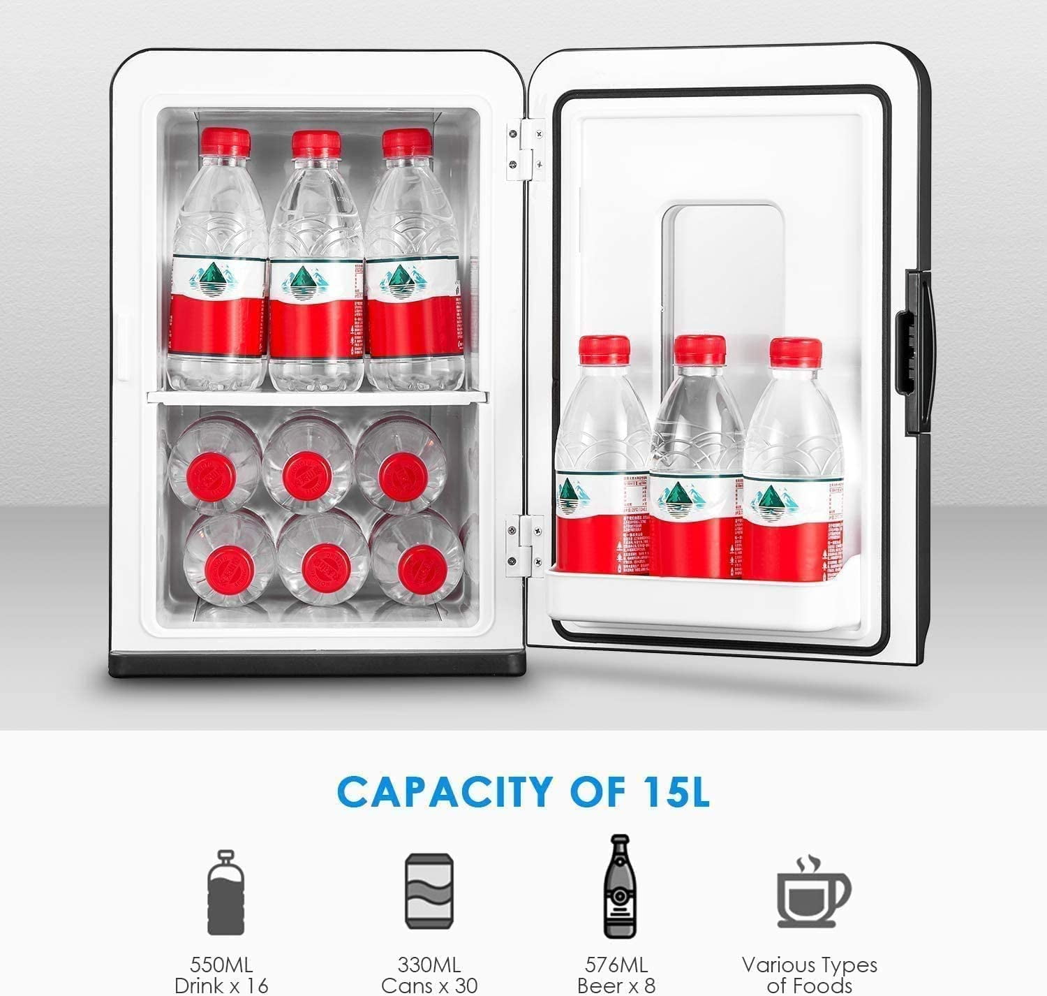 15 Liters Capacity Ideal Size: NORTHCLAN mini fridge with 10.82*12.20*16.22 inches(15 litres) capacity, which can easily store 21 cans of 330ml(11oz), or 6 cans of 330ml(12oz) + 6 bottles of 550ml(18.6oz) drinks. The small size and stylish design make the compact fridge perfect for any occasion, such as travel, offices, dorms, road trips, boating, camping, commuting, and so on. NORTHCLAN space-saving mini refrigerator can fully meet your daily needs. Cold & Warm Personal Fridge: The 15-liter mini refrigerator has two modes of heating and cooling. Cold temperature range is 41-50℉, which can be used for the preservation of cosmetics, medicines, fruits and beverages; It can also maintain the temperature of hot drinks and heat to About 141-150℉ AC/DC Adapters: Two plugs are included for both standard wall outlets and 12V cigarette lighters in vehicles, so you use them both at home and outside. And the convenient carry handle increases the versatility of our mini-refrigerator. Please note: Make sure to run the cooler/heater only when the engine is on, otherwise there will be a risk of draining the battery. Perfect Gift for Girls: NORTHCLAN skincare fridge is a great solution for storing your cosmetics at a cool temperature to enhance their active ingredients. And the removable shelf design makes small items like masks, perfume, face cream easy to store separately. The small size and stylish design make the mini-fridge perfect for any occasion. It’s the best gift for women and girls. Top Quality Service: All NORTHCLAN mini-fridges go through a full quality inspection and any error in details isn’t allowed, which ensures your worry-free purchase. In addition, we provide 24 hours * 7 days after-sales service. If you have any questions, please contact us directly. NORTHCLAN is committed to providing 100% satisfactory service, and we will do everything we can to make things right. Dimensions: 10.20 x 11.80 x 15.7 inches Net Weight: 8.55 lbs. Noise Decibel: 35dB Colour: Black Applicable venue: Home; Bedroom; 0ffice; Bedroom Set Temperature: 41℉-150℉ Capacity: 15 Liter Material (Outer Cover): ABS Input: AC 110V~50/ 60Hz DC12V