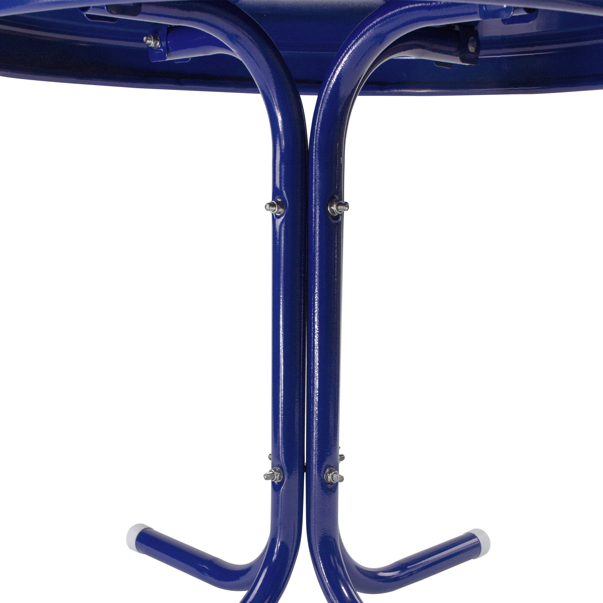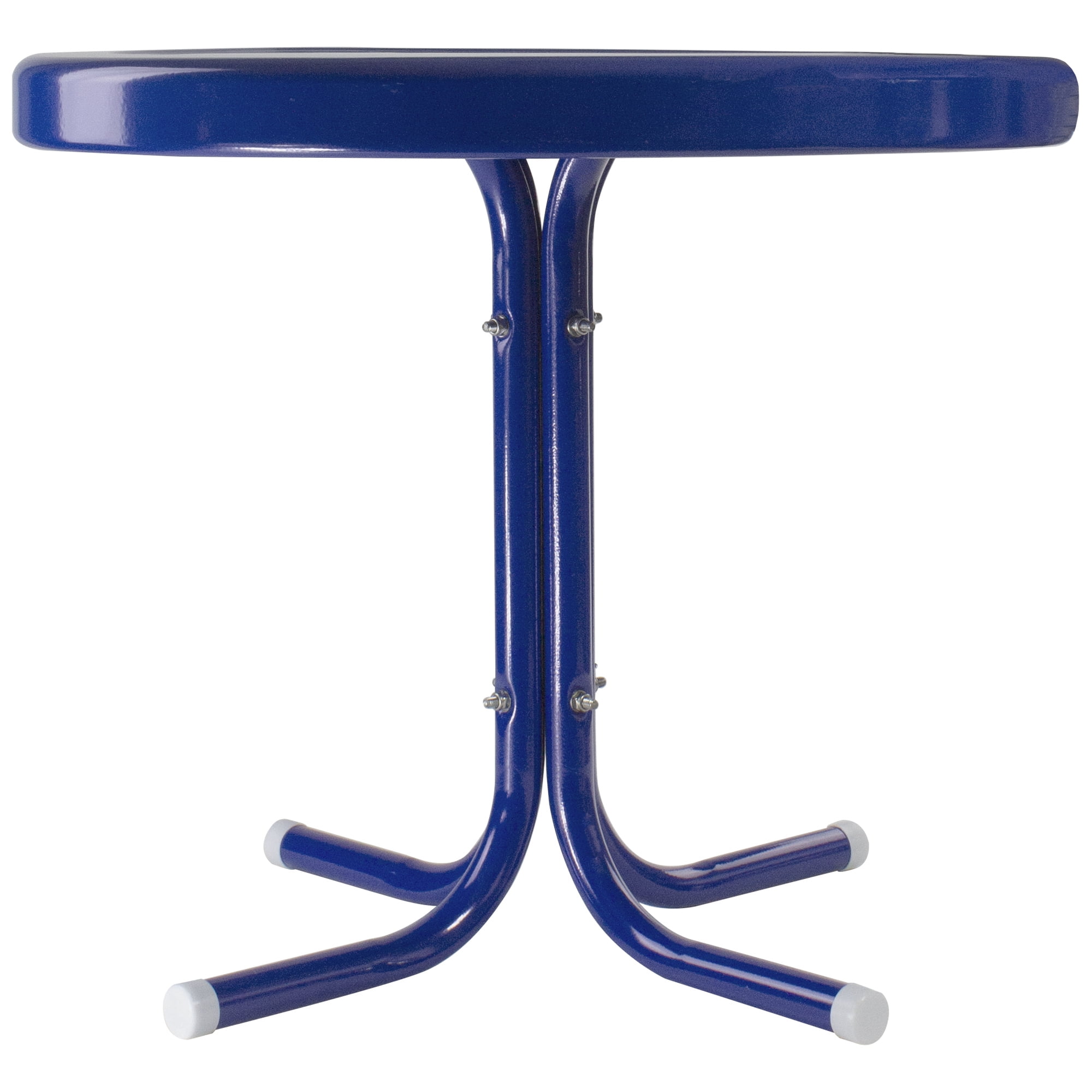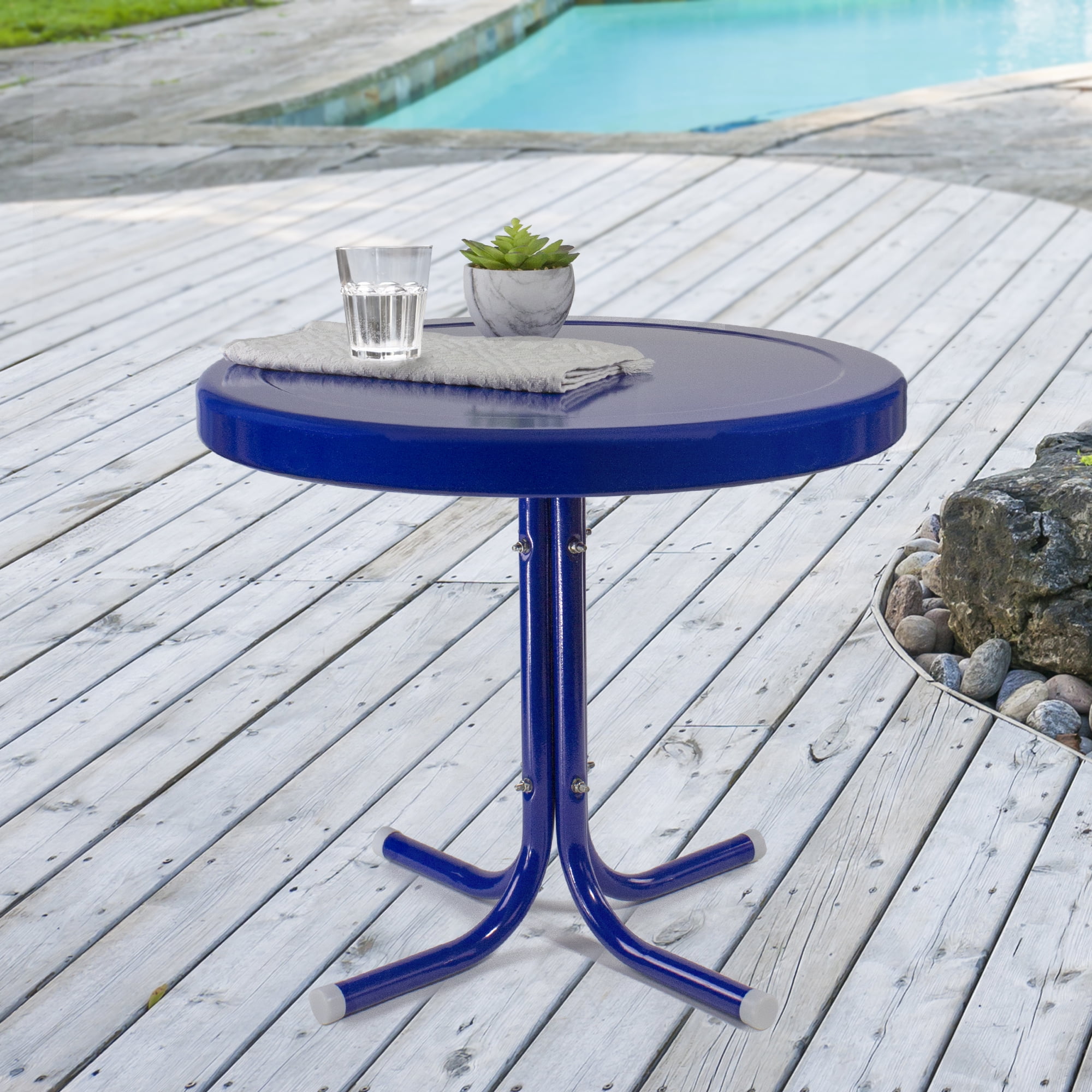 Blue retro outdoor patio side table Powder-coated finish prevents color fading and corrosion The plastic caps on the legs protect your surfaces For indoor or outdoor use; Easy to follow instructions for assembly Table measures 19 inches high by 22 inches in diameter
