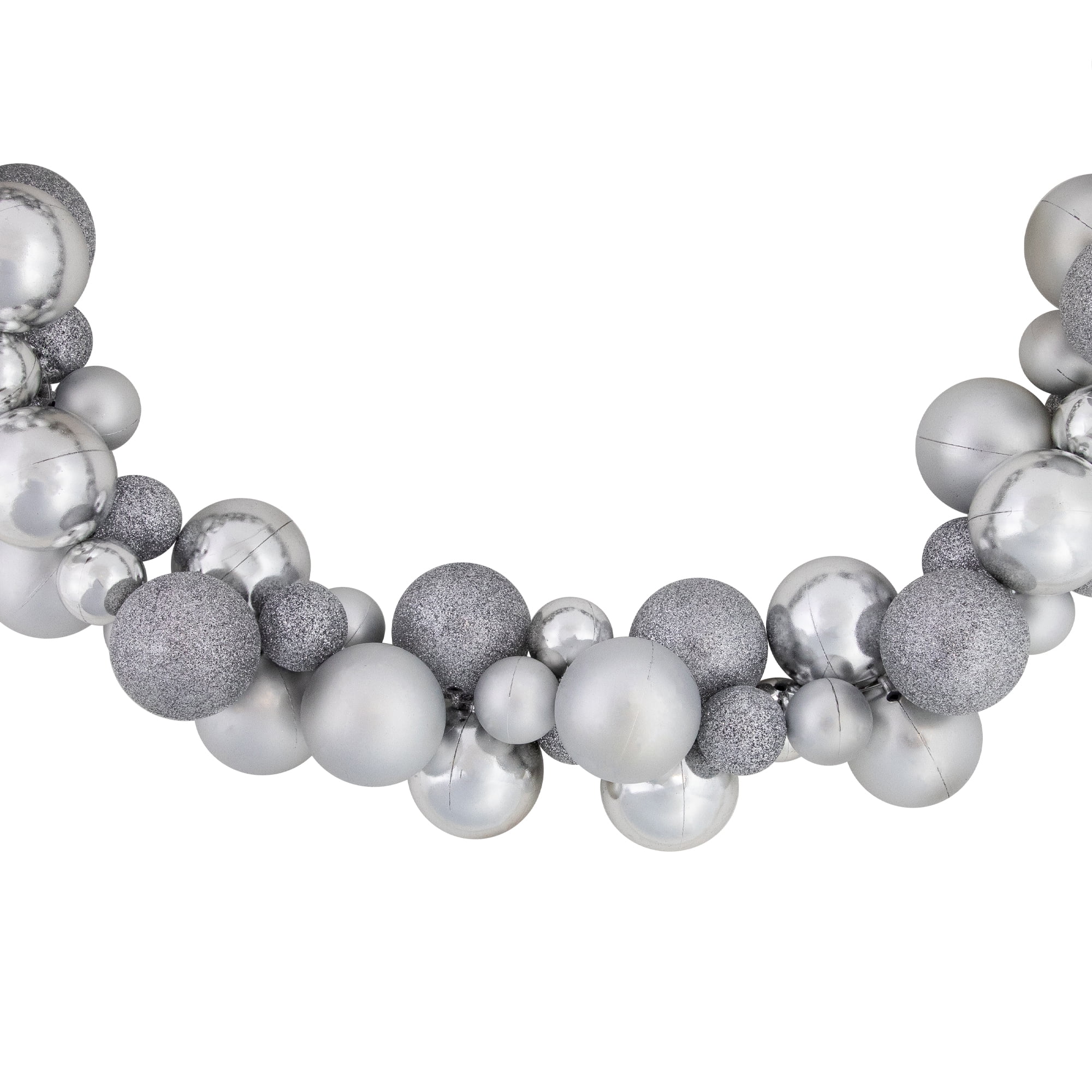 Silver shatterproof ball ornament Christmas garland Features shiny, glitter and matte ball ornaments Clear plastic loops on each end for easy hanging Recommended for indoor use only Measure 6 feet long by 2 inches wide
