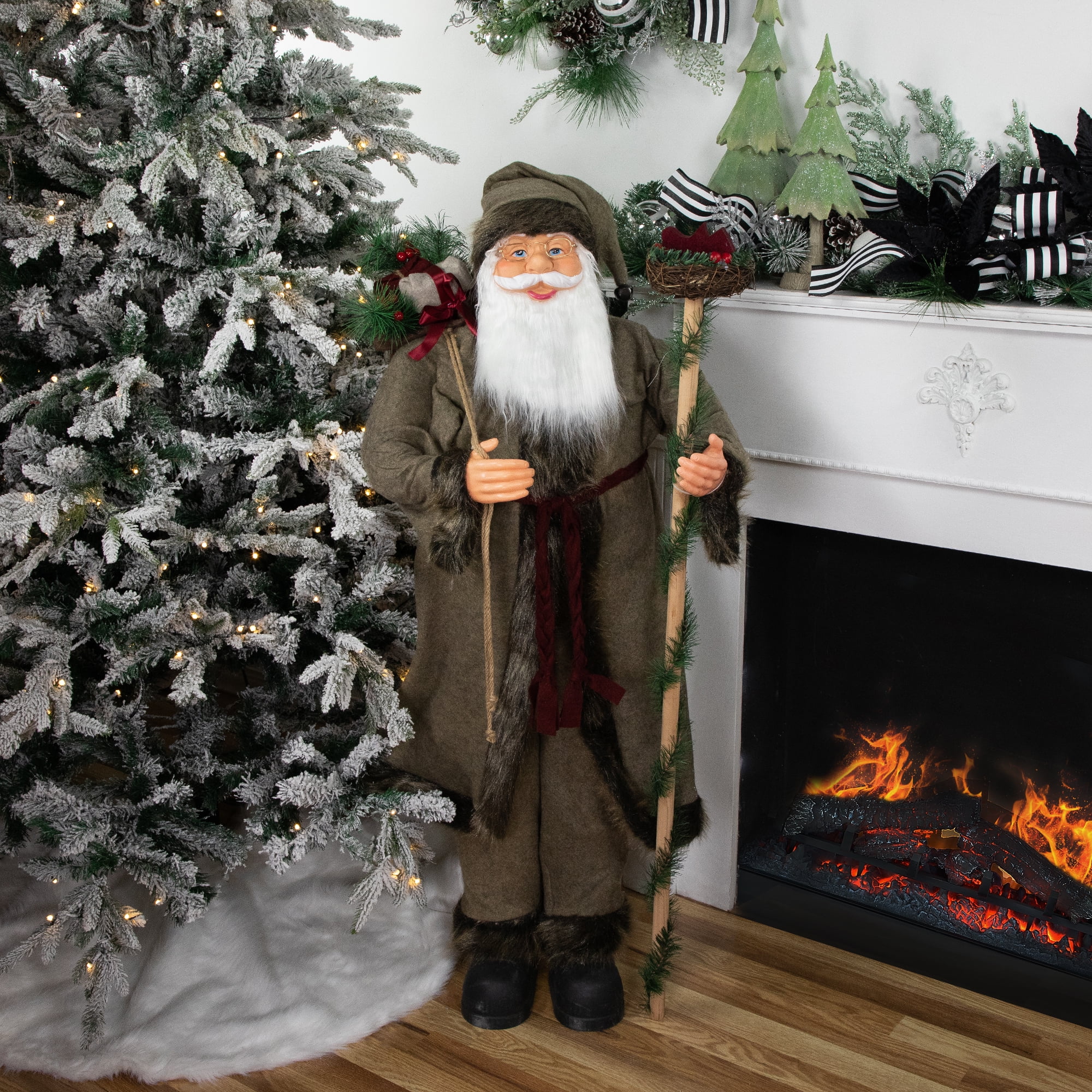 This old-world Santa Claus is full of holiday cheer and ready to join you in your holiday festivities! This Santa features an olive green robe trimmed in brown faux fur. With a sack bursting with gifts Santa is ready for his night of visiting all the children of the world! This Santa is a must-have for this holiday season and many more to come! Perfect to add to any room in your home that needs a little bit of holiday cheer. Product Features: Santa with a gift bag and walking stick Christmas Figure. Santa is wearing a long olive green robe with brown faux fur and a burgundy belt. Santa’s walking stick is wrapped with pine and has a bird’s nest on top. Santa is carrying a gift bag exploding with gifts pine and berries. For indoor use only. Dimensions: 48″H x 18″W x 17″D. Material(s): plastic/felt/metal/wood/foam/pine cones