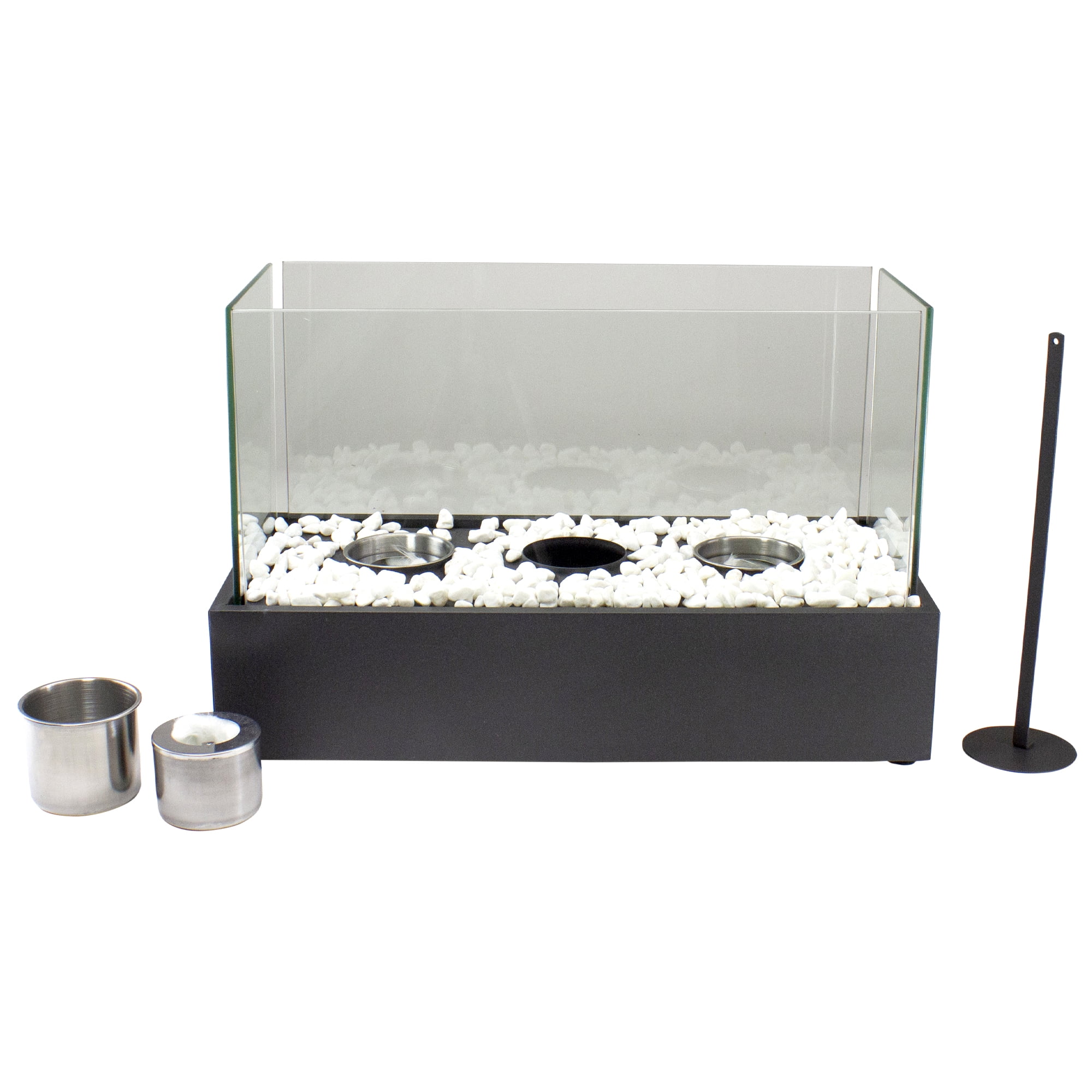 Smokeless and odorless Bio Ethanol fueled real triple flame fireplace Self contained fireplace ideal for indoor or outdoor use; quick and easy assembly Includes three wool wick burners for long lasting flame Stainless steel snuffer for extinguishing also included Measures 11.5 inches high by 17.75 inches long by 8.25 inches wide