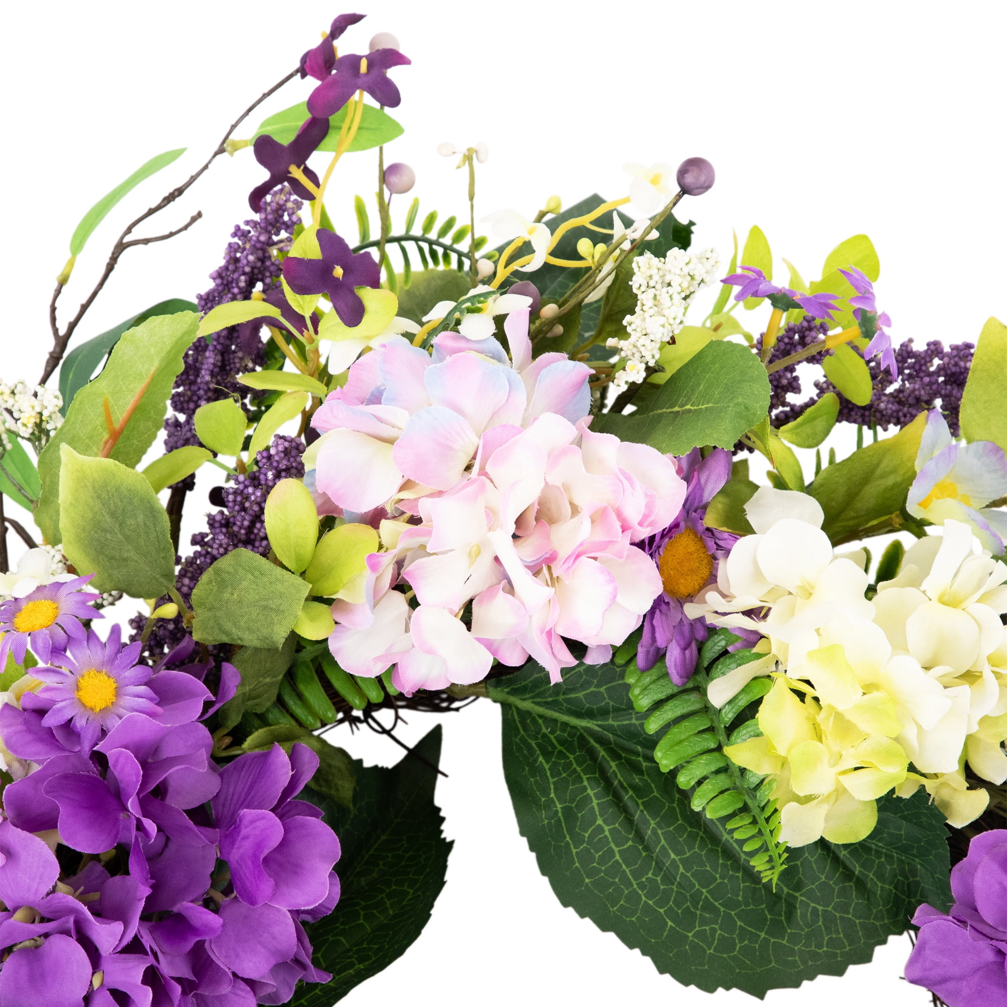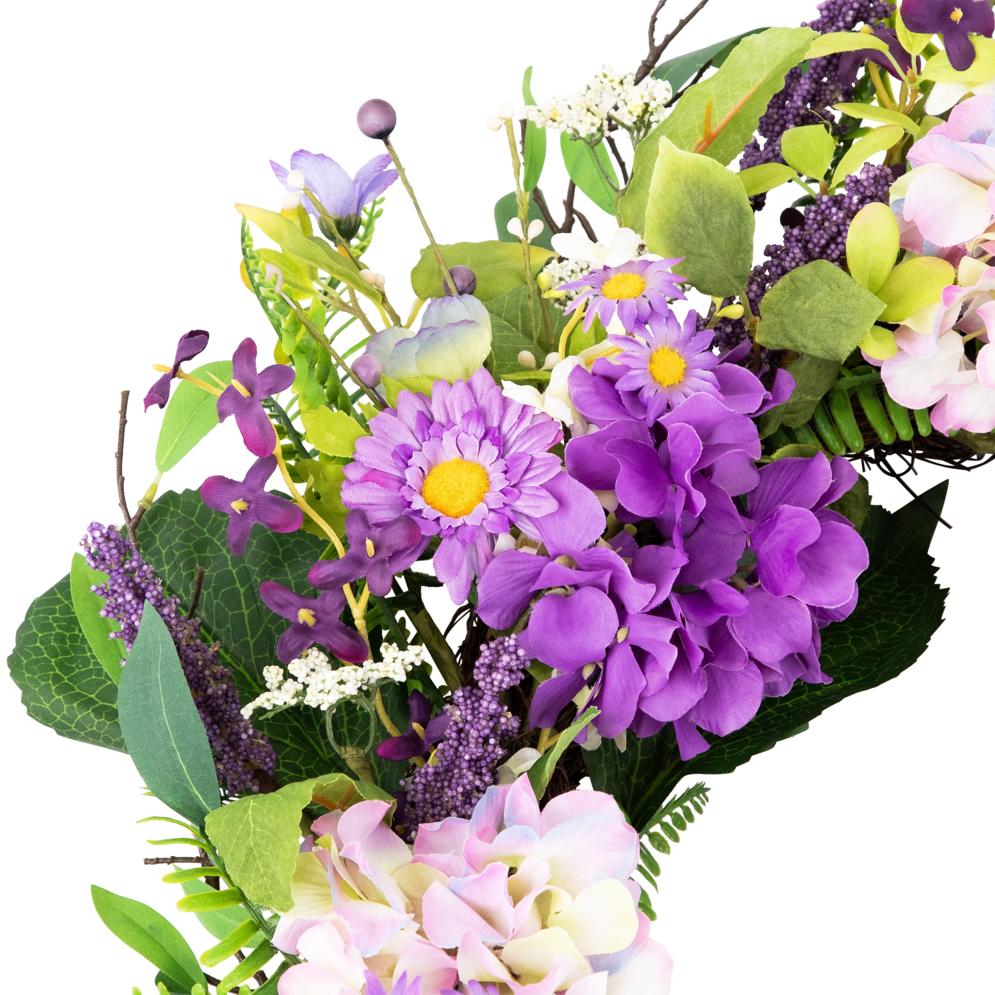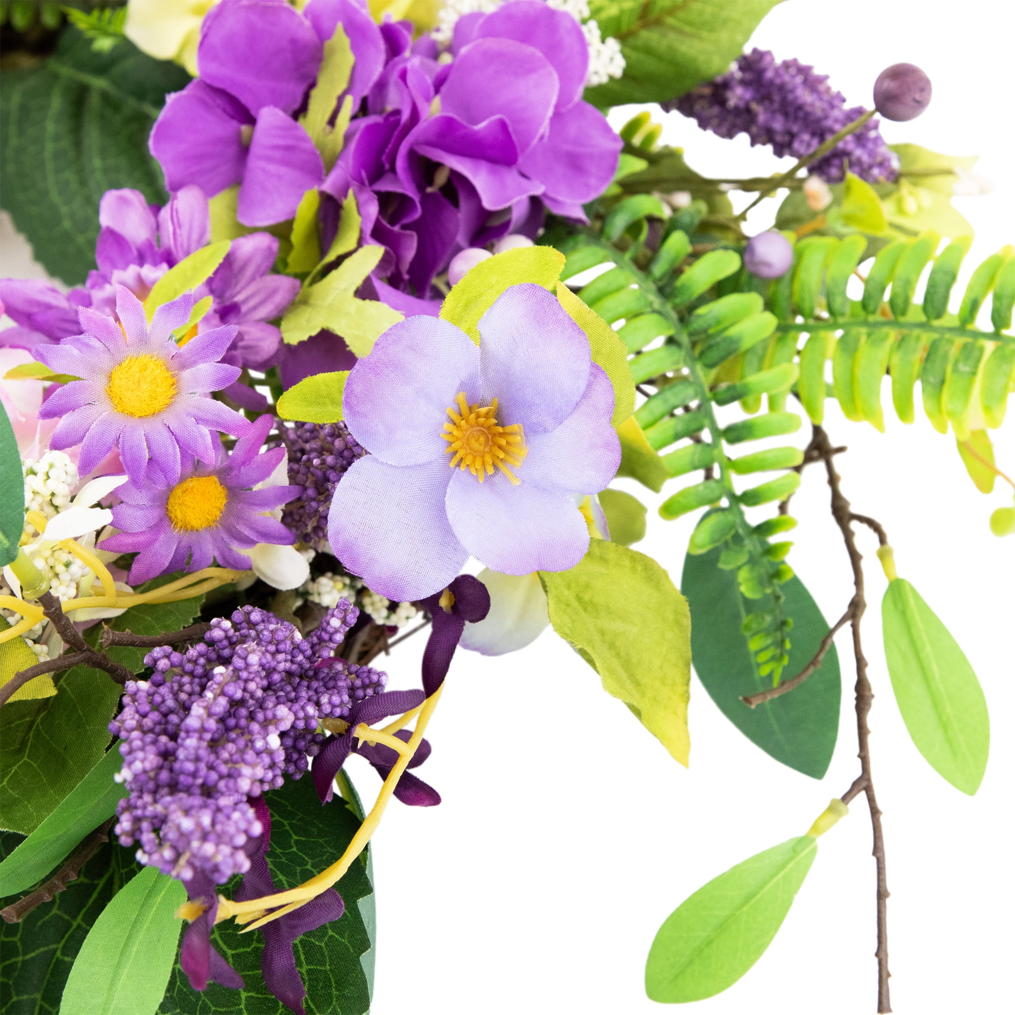 Floral spring hydrangea and fern wreath Small purple and white flowers throughout Purple berries and small pip berries accent this wreath Hangs on a natural round twig grapevine Measures approximately 24 inches in diameter by 6 inches deep