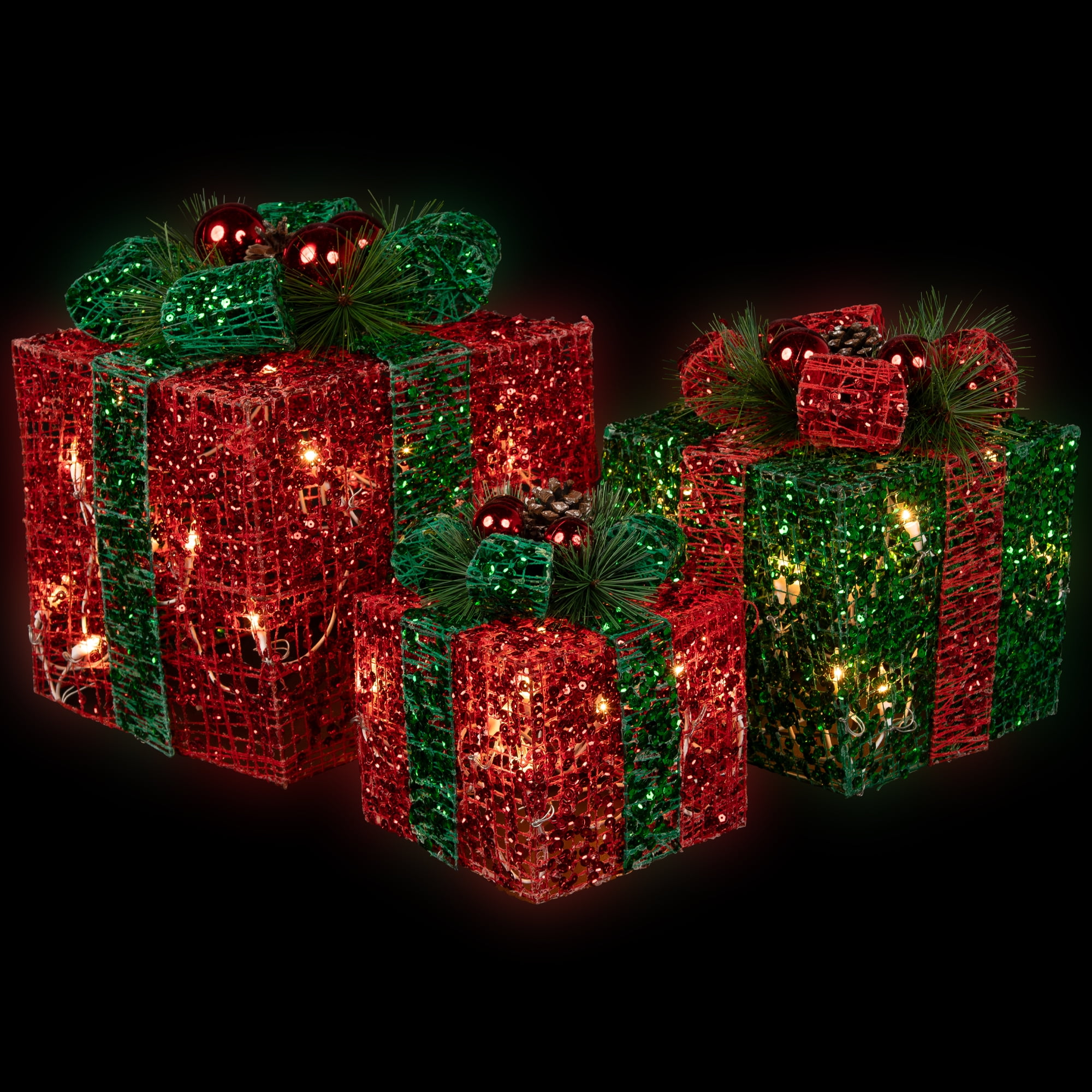 Set of 3 LED lighted gift boxes Pre-lit with 35 LED warm white lights LED lights use 90 percent less energy Contains 1 plug where multiple items can be stacked Gift boxes can not be displayed separately