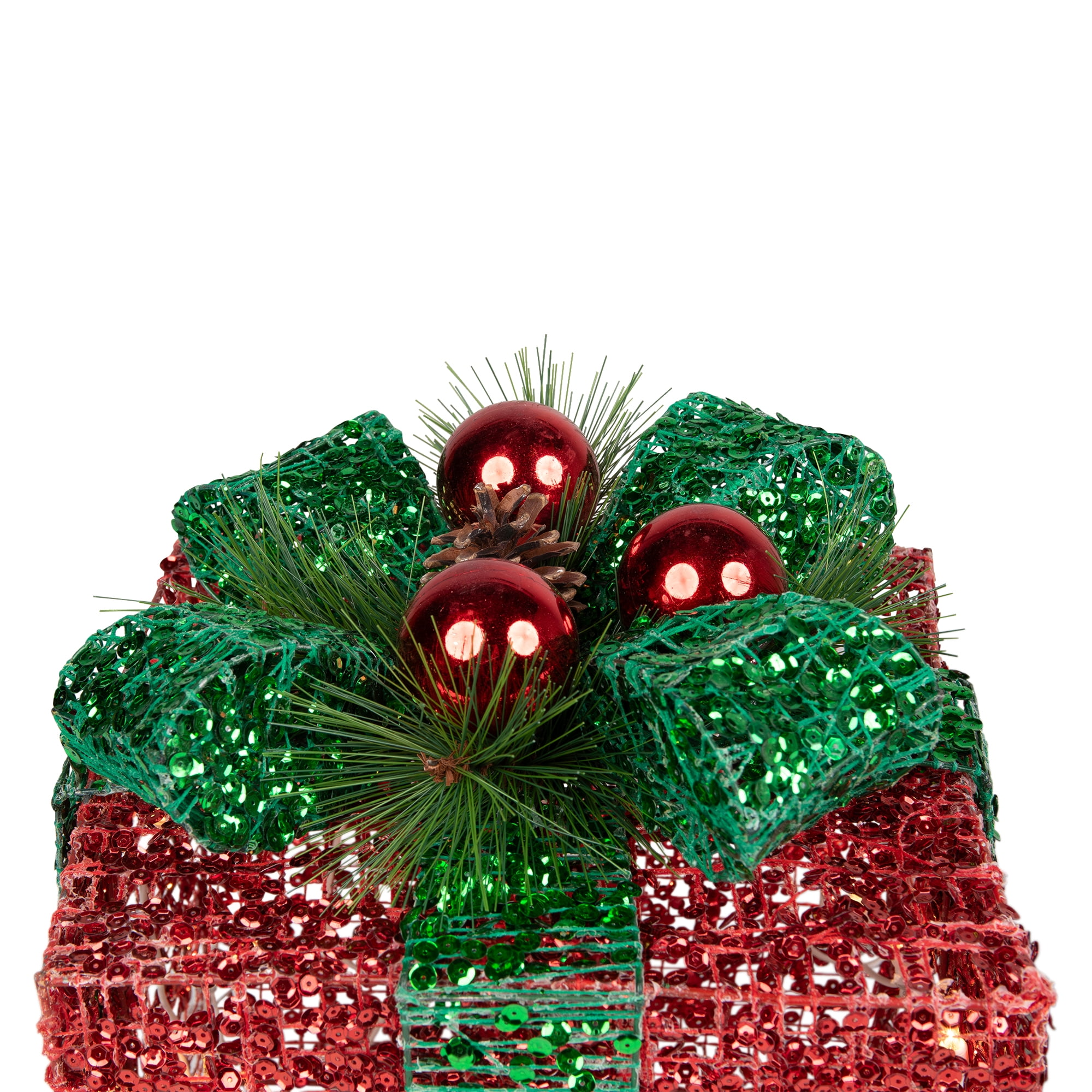 Nothing says Christmas like gift boxes wrapped in bows. This trio is glitter drenched, adding sparkle when the LED lights shine. Made with a unique construction of glittered thread. Elegantly topped with ball ornaments and pine sprigs, this display adds an upscale feel. The perfect addition to yard, porch or indoors. Product Features: Pre-lit with 35 warm white lights . Bulb size: mini. Bulb type: LED. 58″ white lead wire . Can not displayed separately. Additional product features: LED lights use 90% less energy . Lights stay cool to the touch . Some assembly required. Contains 1 plug with end connector which allows you to stack multiple sets together (not to exceed 210 watts). Lights are UL approved and certified for indoor or outdoor use. 120 volts, 60 hertz, 12 amps, 14.4 watts. Dimensions: . Large: 9.5″H x 10″W x 10″D. Medium: 7.5″H x 8″W x 8″D. Small: 5.5″H x 6″W x 6″D. Material(s): metal/plastic/wire