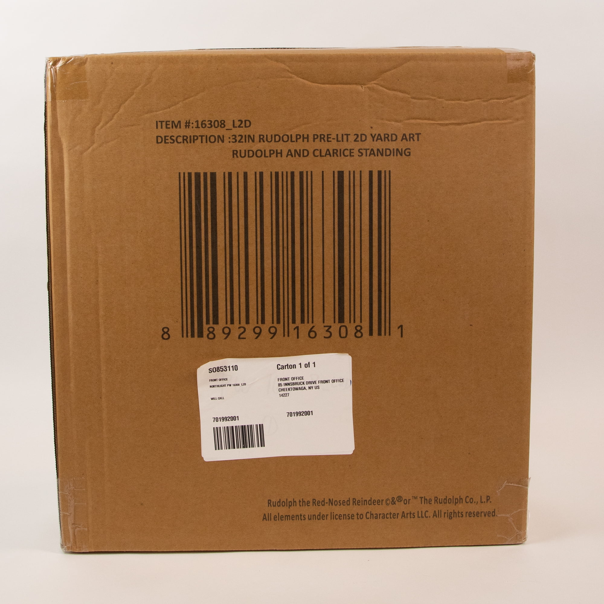 Officially licensed merchandise. Rudolph, the Red-Nosed Reindeer, is an all-time favorite, spreading holiday cheer alongside his lady friend Clarice. Place them in your house or yard, for a fun nostalgic addition. If using outdoors, it is recommended that it is placed under a covered area. Product Features: Pre-lit with 100 clear lights . Bulb size: mini. Bulb type: incandescent. 44″ white lead cord. Easy 4-piece assembly. One sided-flat design. Rudolph and Clarice can be placed together or separate. Collapsible for easy storage. Contains 1 plug with end connector allowing you to stack multiple lighted decorations together (not to exceed 210 watts). UL certified and approved for indoor or outdoor use. Comes with ground stakes, extra cotter pins, spare replacement bulbs, and fuses. 120 volts, 60 hertz, 0.16 amps, 19.2 watts. Dimensions: . Rudolph: 32″H x 21″W x 6″D. Clarice: 29″H x 19″W x 6″D. Material(s): metal/fabric/glass bulbs/wire. Note: items are not 3 dimensional