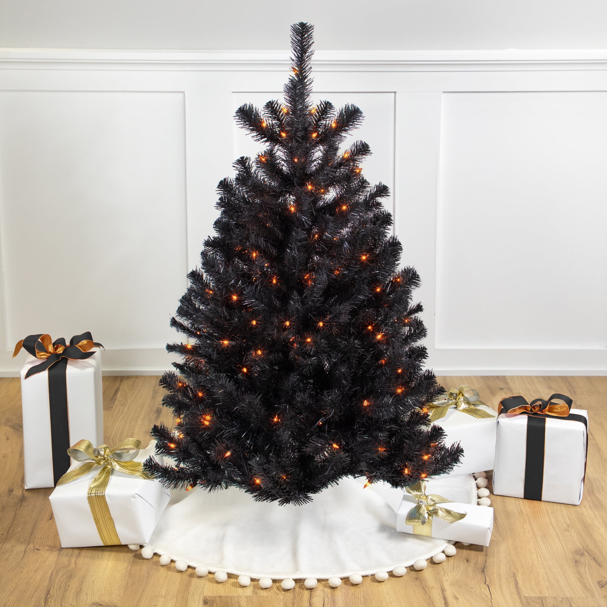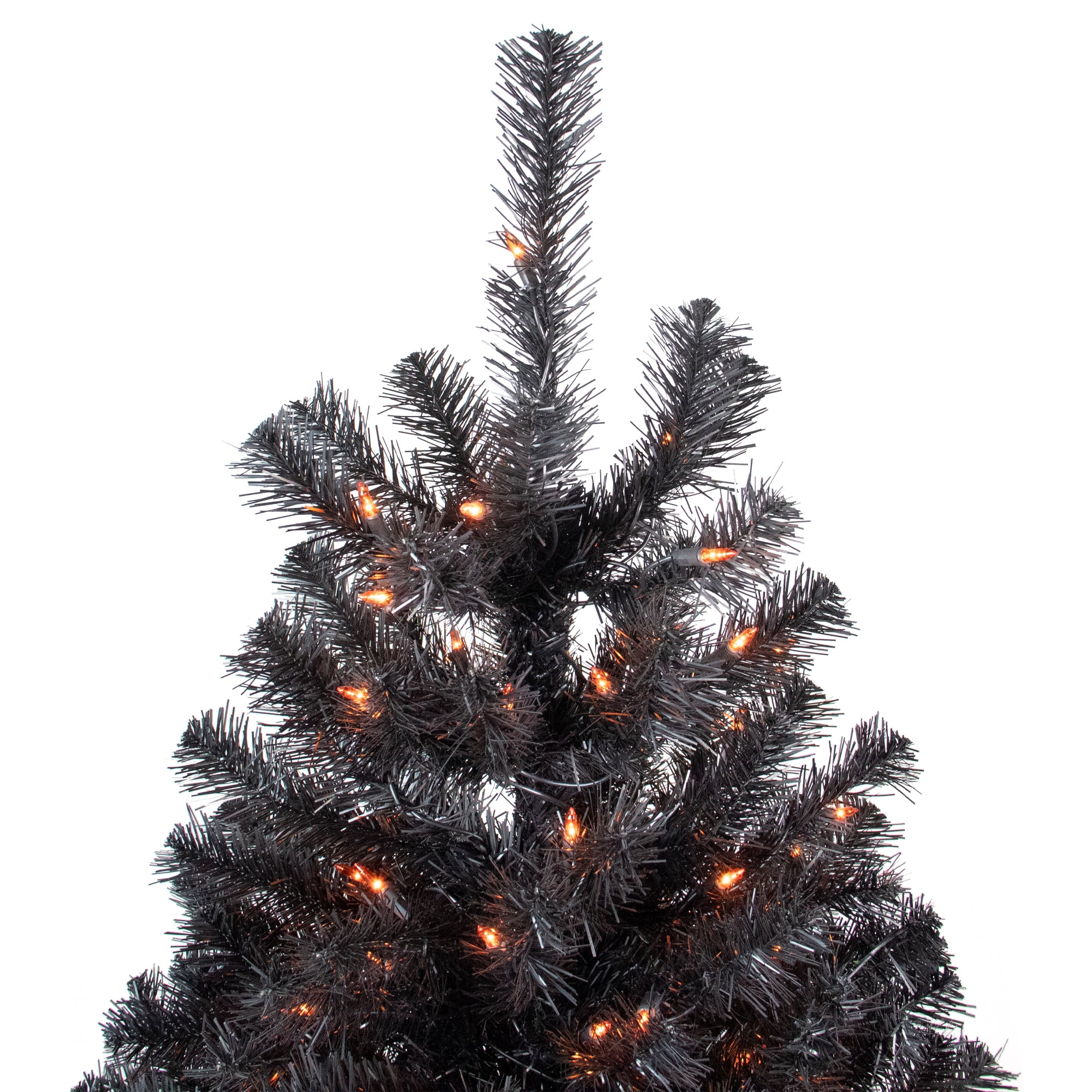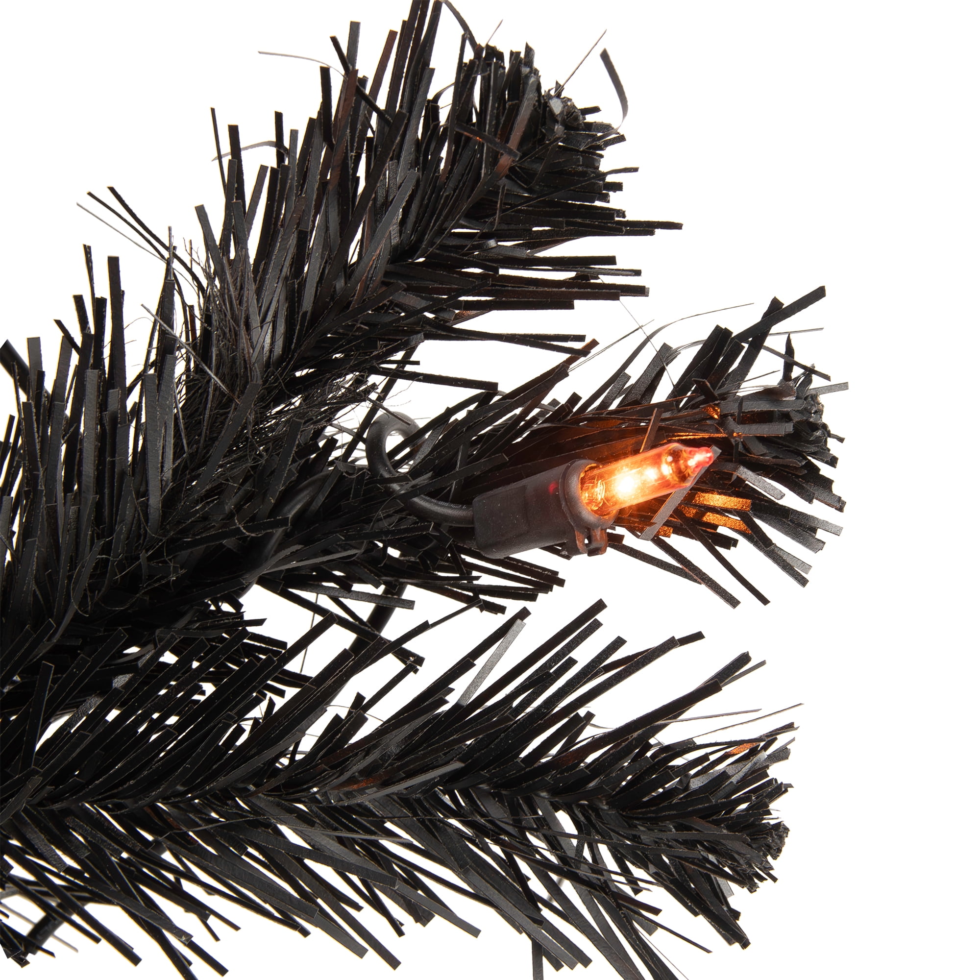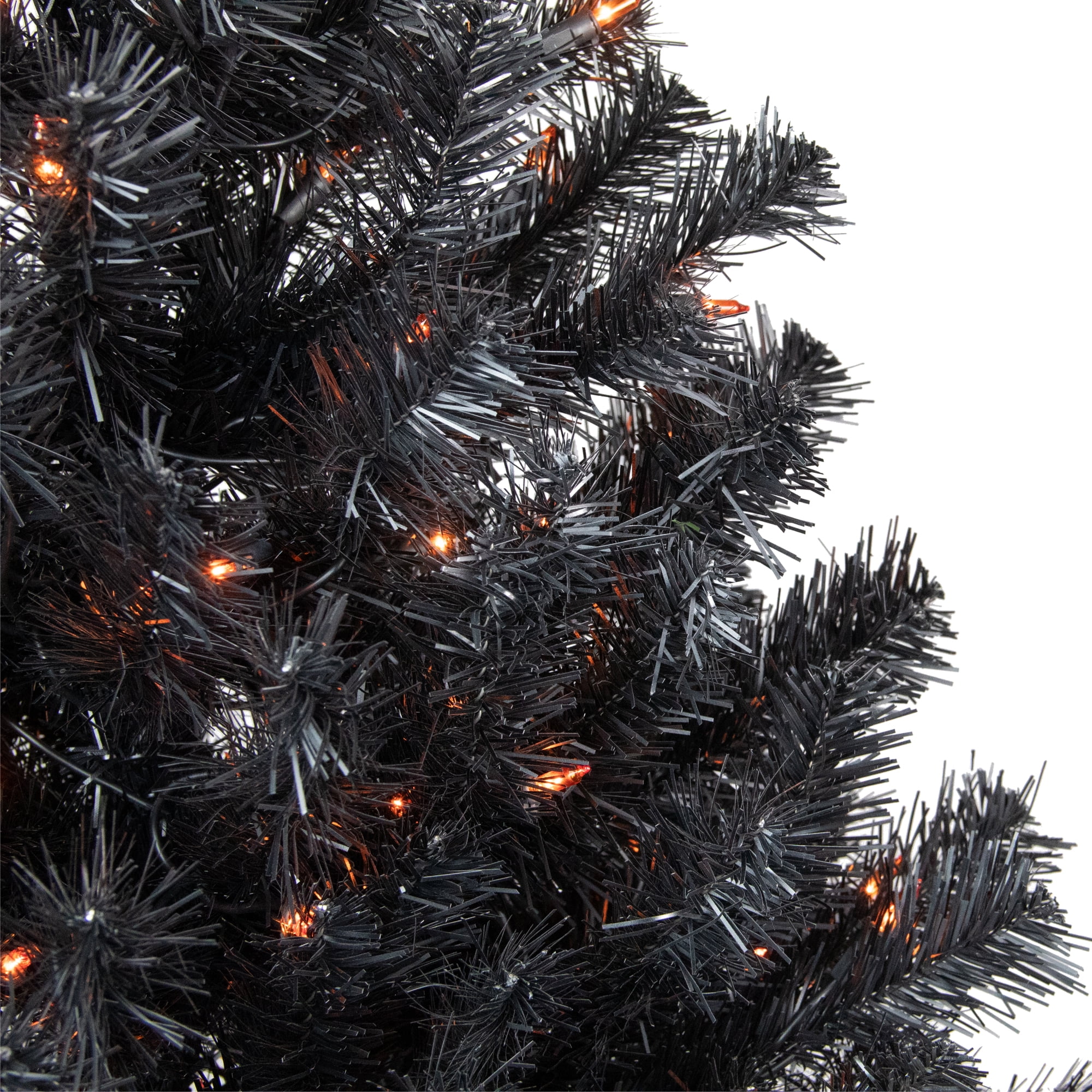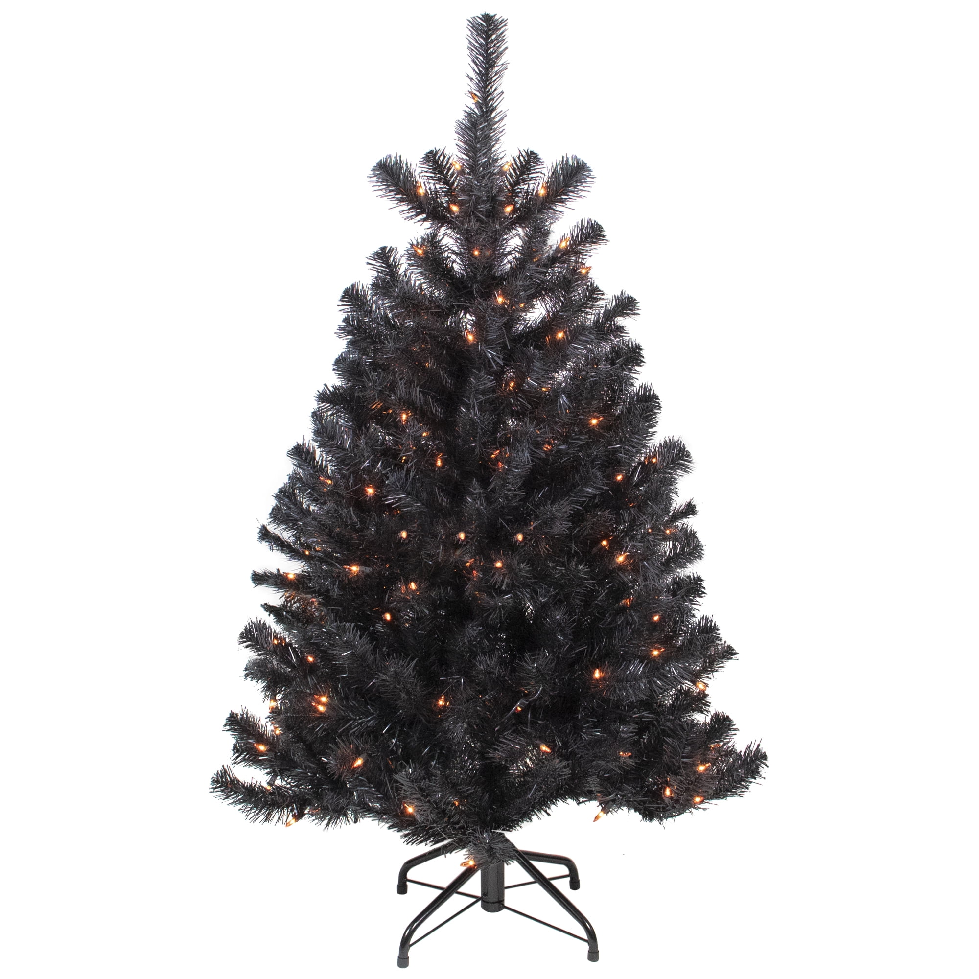 Lighted black spruce Halloween tree with orange lights Fitted with 150 orange incandescent mini lights Contains 314 branch tips that measure 2 inches wide; Matte black needles 3 piece easy assembly including the black metal tree stand Measures 4 feet high and has a 31 inch base diameter at the widest point