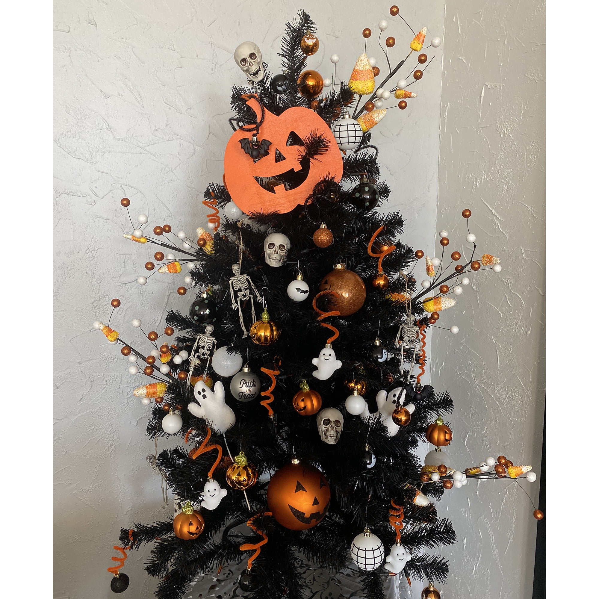This black Noble Spruce artificial tree features thick, black tips to create a full, luxurious look. The needles have a matte finish and when coupled with the orange lights make this tree perfect for adding some frightful fun to your Halloween display this year. Trim with ornaments, garland, twigs, or spooky accents for some added seasonal fun. . Product features: Pre-lit with 150 orange lights. Bulb size: mini. Bulb type: incandescent. 314 tips. 2″ wide tips. 35″ black lead cord. Medium profile tree. 3-piece easy assembly (including stand). Additional product features: Light sets on the tree are UL certified and approved for indoor or outdoor use, however, the tree itself is recommended for indoor use. If one bulb burns out, the rest will stay lit. Lights are equipped with Lamp Lock feature, which makes them replaceable, interchangeable and keep them from falling out. Contains 1 plug with end connector which allows you to stack multiple lighted items together (not to exceed 210 watts). Comes with replacement bulbs and spare fuse. Includes a black metal tree stand. Wire gauge: 22. 120 volts, 60 hertz, 17 amps, 20.4 watts. . Dimensions: 4′ high (measured from outermost tip to outermost tip across the wreath) . 31″ base diameter (at the widest point). Material(s): PVC/metal/glass bulbs/wire