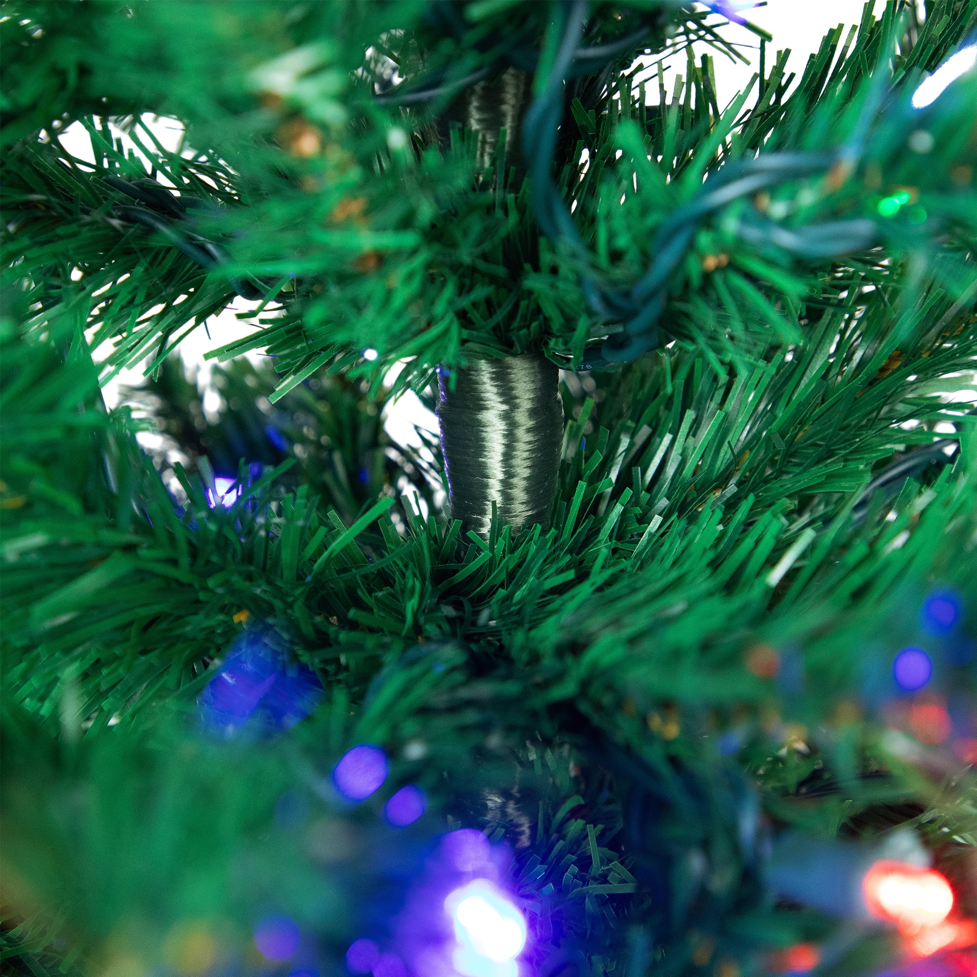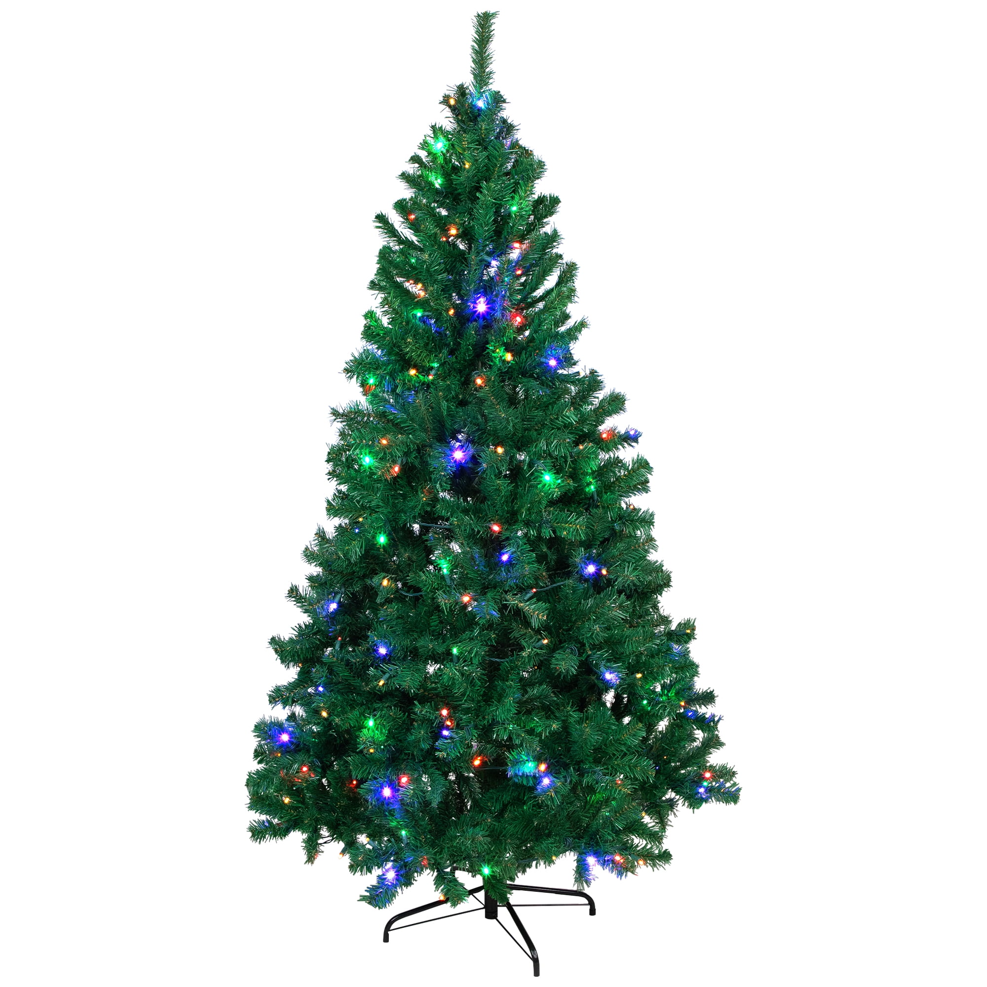 Pre lit pine artificial Christmas tree Features 890 branch tips and 250 multi-color LED lights Three piece easy assembly including free stand Branches feature 2 inch wide tips for a full and lush look Tree measures 6 feet high by 42 inches in base diameter