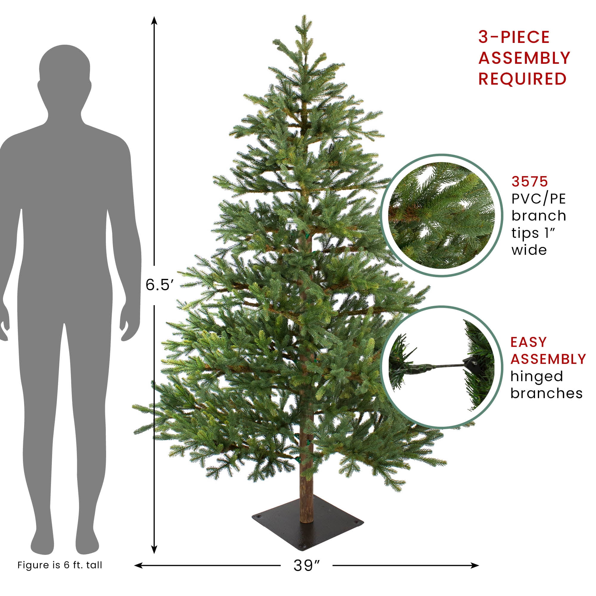 Real Touch™️ northern pine artificial Christmas tree Hinged branch construction with 3575 tips 3 piece easy assembly including stand Rcommended for indoor use Measures 6.5 feet high by 39 inch base diameter