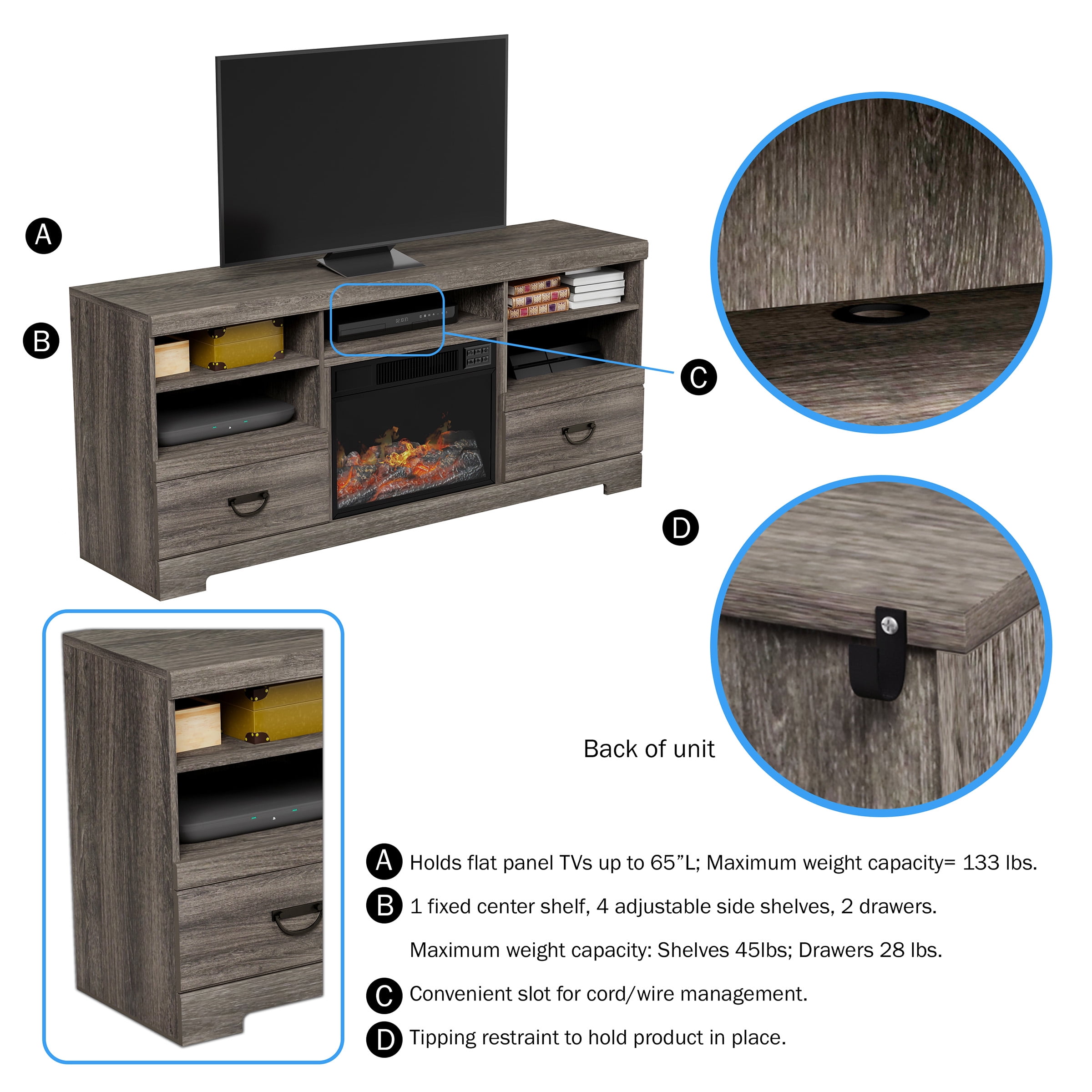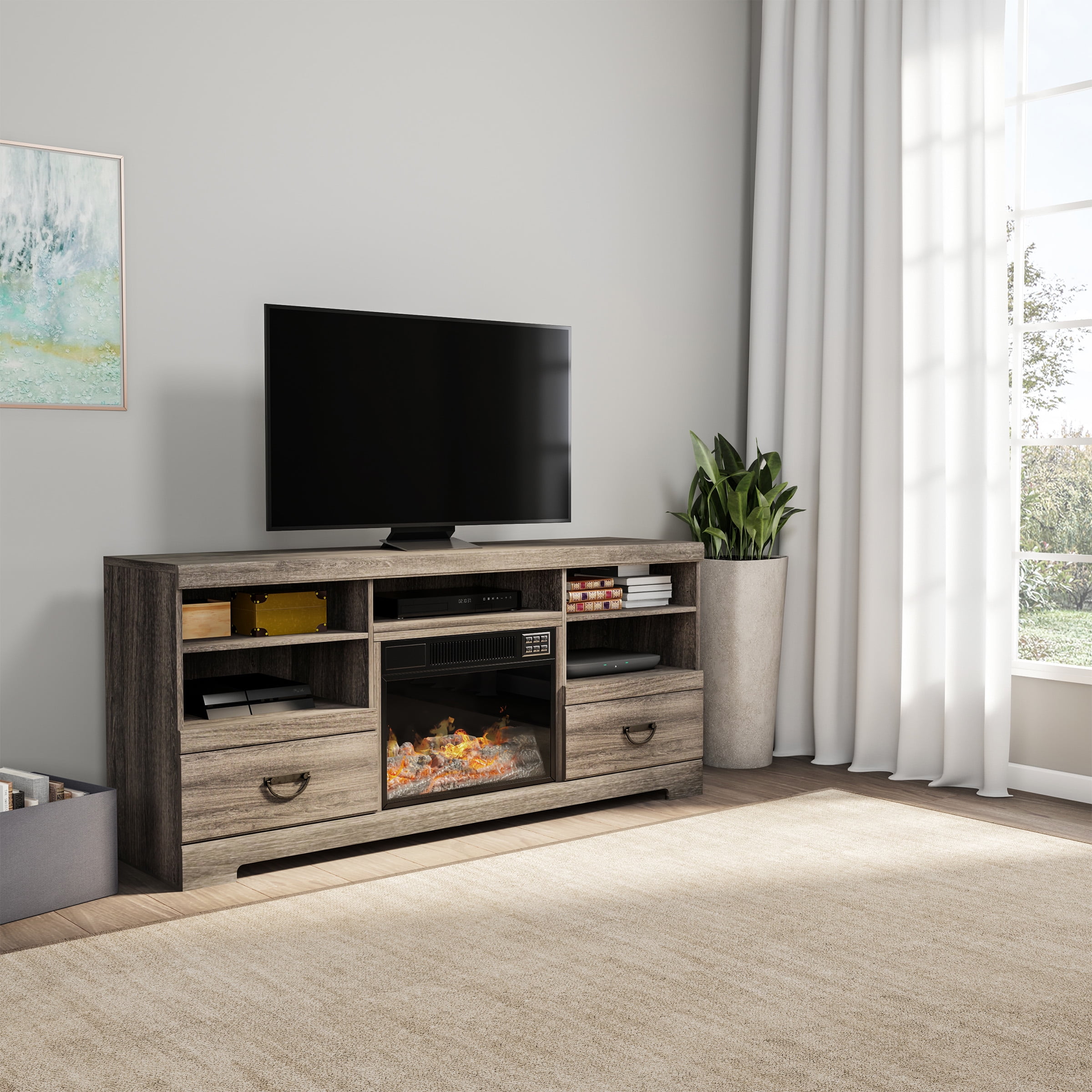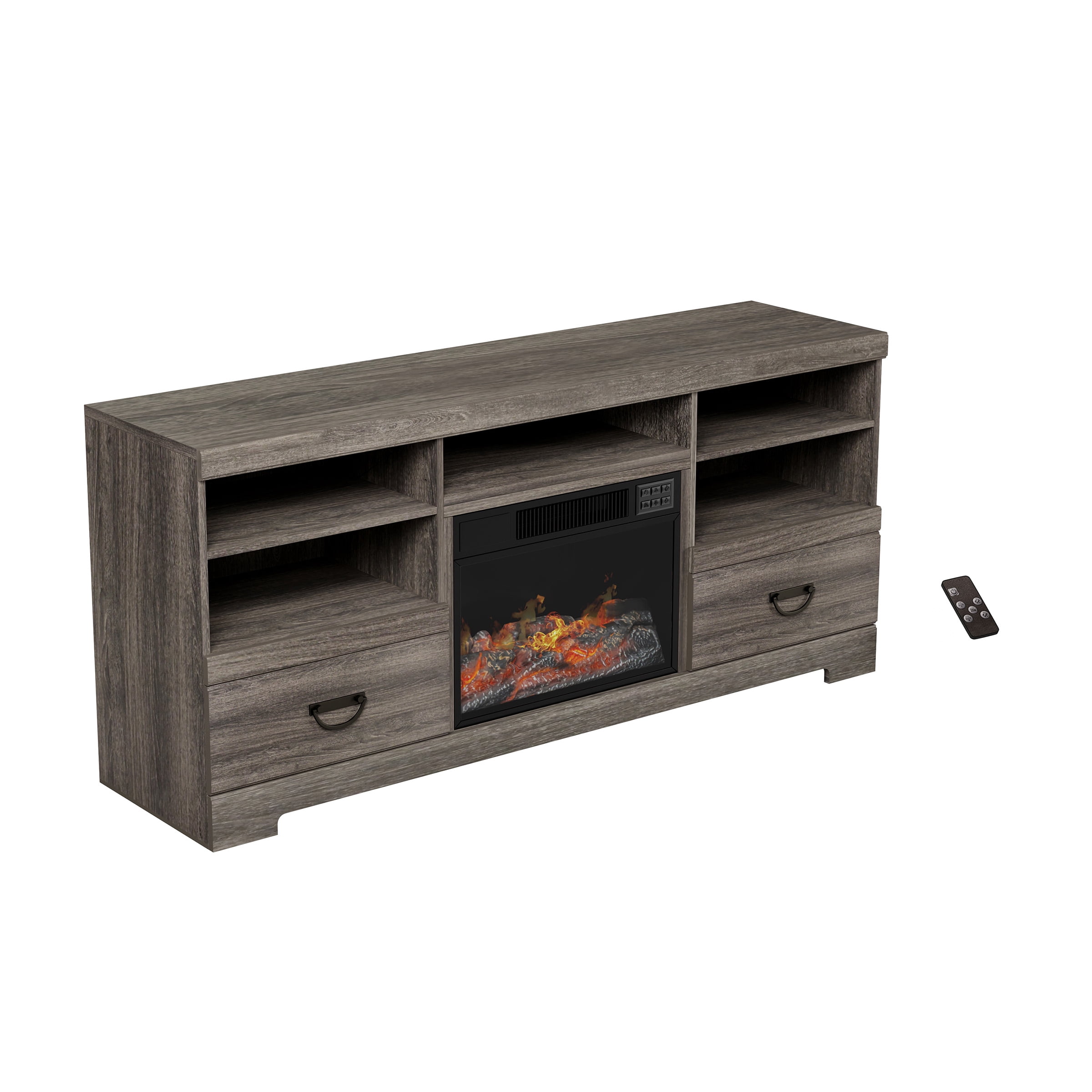 65-INCH FIREPLACE TV STAND – Designed to hold up to 65-inch televisions, this entertainment center has five open shelves and 2 pull-out drawers to store all your media equipment. FIREPLACE INSERT – To create a warm and cozy atmosphere, a remote-controlled fireplace heater is attached to the media console for heating rooms up to 400 square feet in size. EFFICIENT AND SAFE – The electric fireplace uses LED flame technology to heat your home efficiently, while a built-in safety cutoff device prevents the heater from overheating. USE ALL-YEAR ROUND – Ideal for year-round use, this ventless fireplace television stand is equipped with glowing logs, five brightness levels, and two adjustable heat settings. MATERIALS – MDF Wood, Steel, Tempered Glass, and Plastic. DIMENSIONS – (L) 62″ x (W) 16″ x (H) 28″; Cord: (L) 6′. COLOR – Gray.