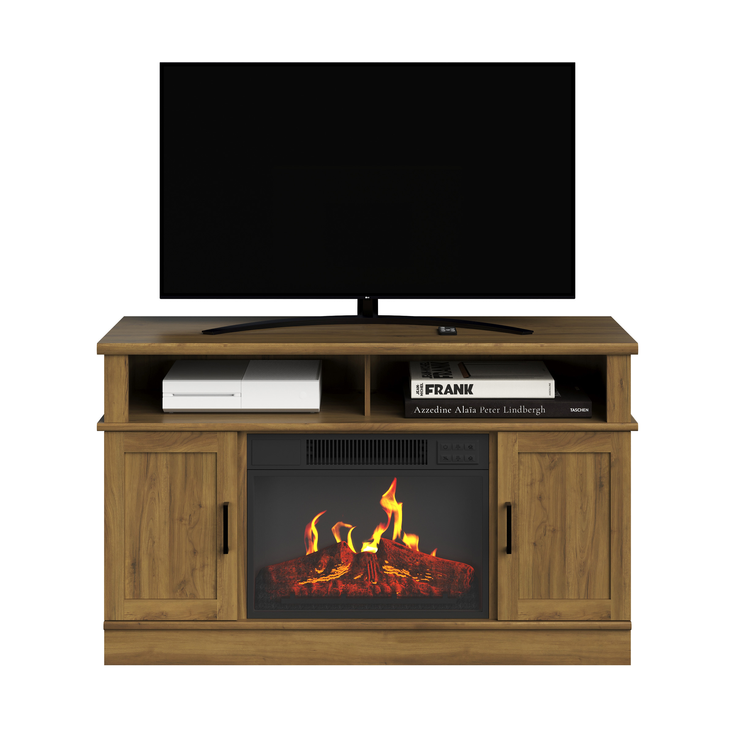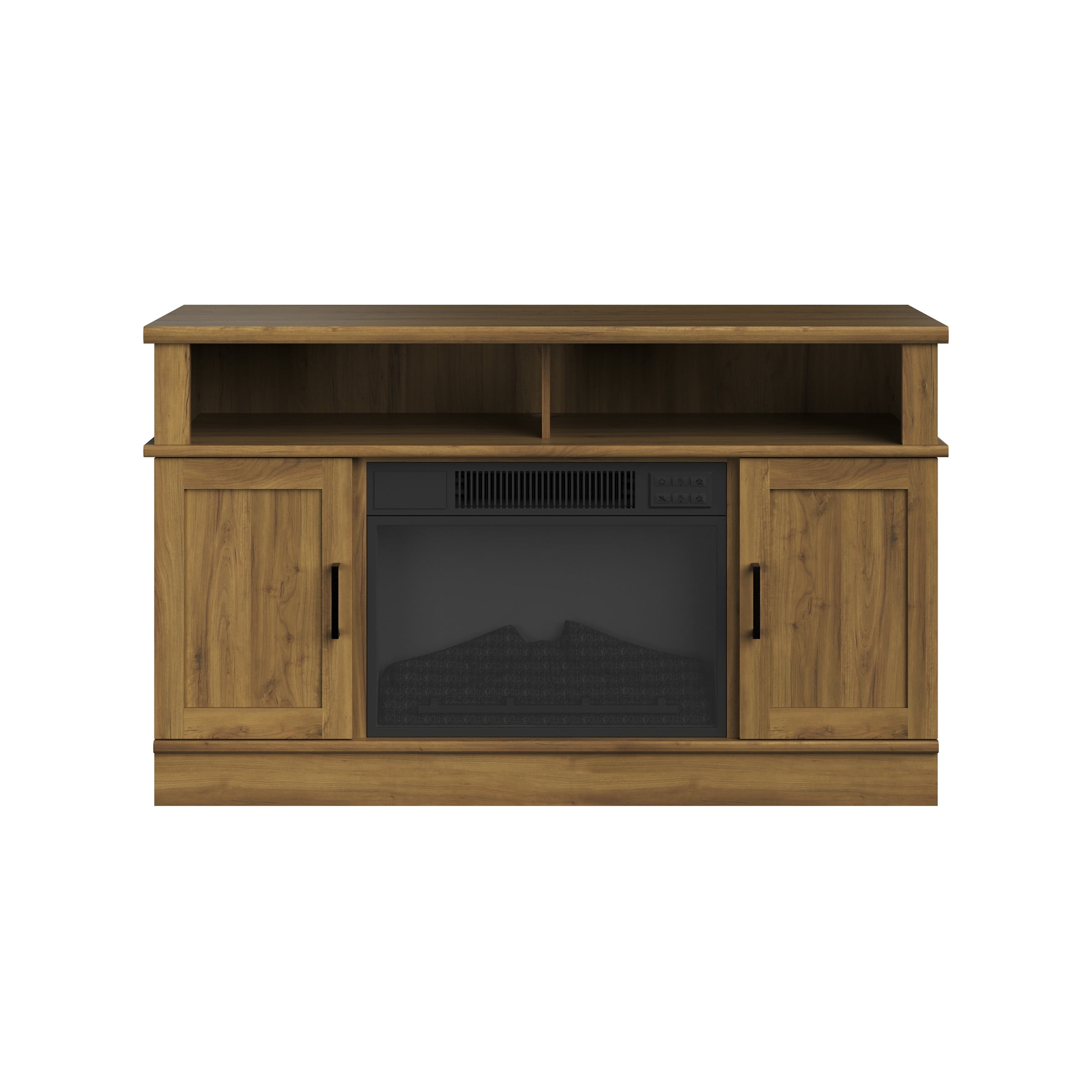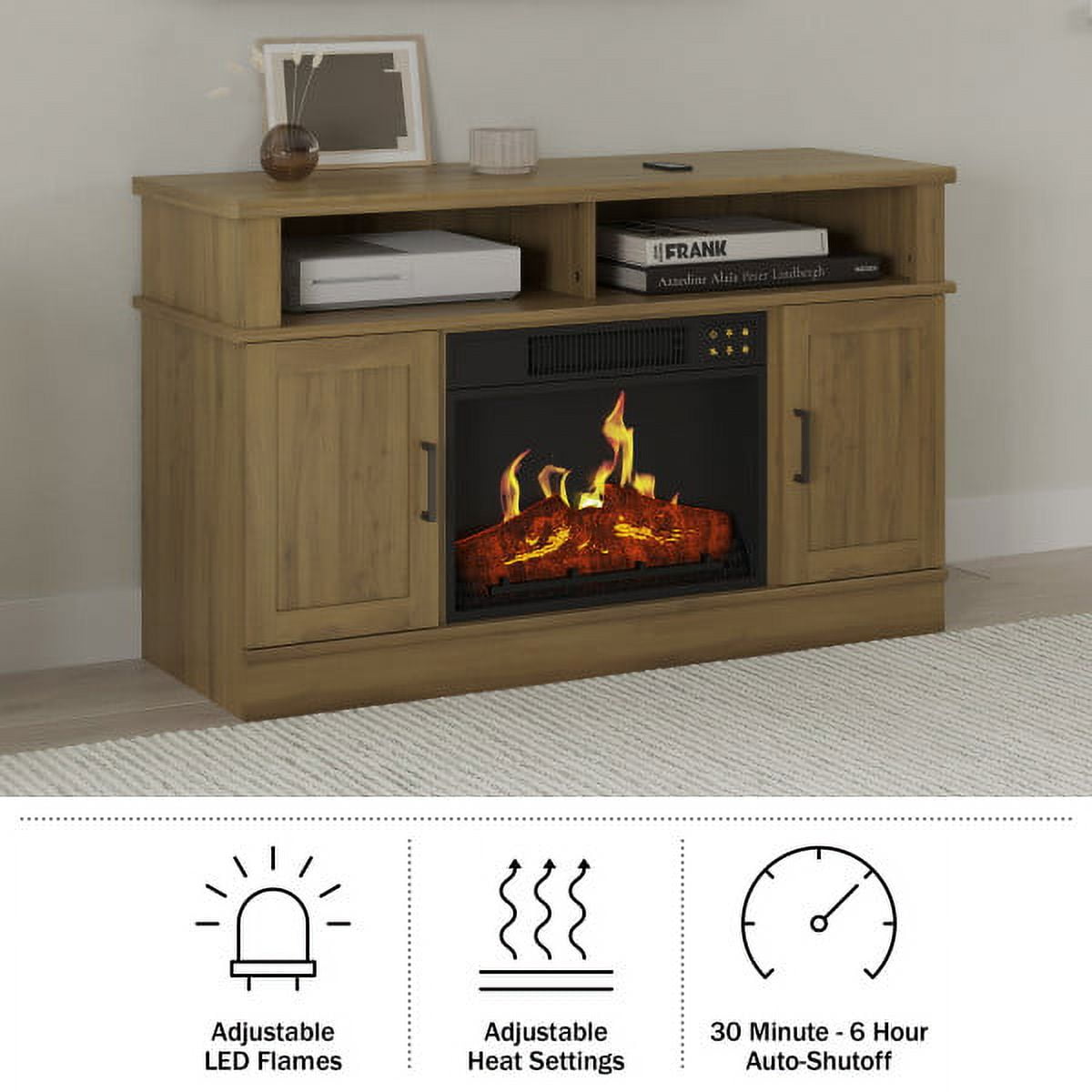 FIREPLACE TV STAND – Add a spark of style with this entertainment center that can hold a 50-inch TV, all your media players, movies, and so much more in the 2 open shelves and behind the 2 wood cabinet doors. EASY CONVENIENCE – This TV stand with fireplace includes a remote control, so you can adjust the heat, light, and timer settings from across the room or you can use the manual panel. ENERGY EFFICIENT – Along with LED flame technology that requires less energy to heat your home, the fireplace features a timer with auto-shutoff and can be set for 30 minutes up to 6 hours. USE YEAR ROUND – Turn the heat on or off and enjoy the changeable LED flames with options to increase or decrease the faux flame intensity providing just the right ambiance in any room and any season. MATERIALS – MDF Wood, Steel, Tempered Glass, and Thermoplastic Resin. DIMENSIONS – (L) 44.5″ x (W) 15.4″ x (H) 27.5″; Power: 1400 Watts, 4777 BTUs, 120V; Weight: 78lbs; CSA Listed. COLOR – Woodgrain Brown.
