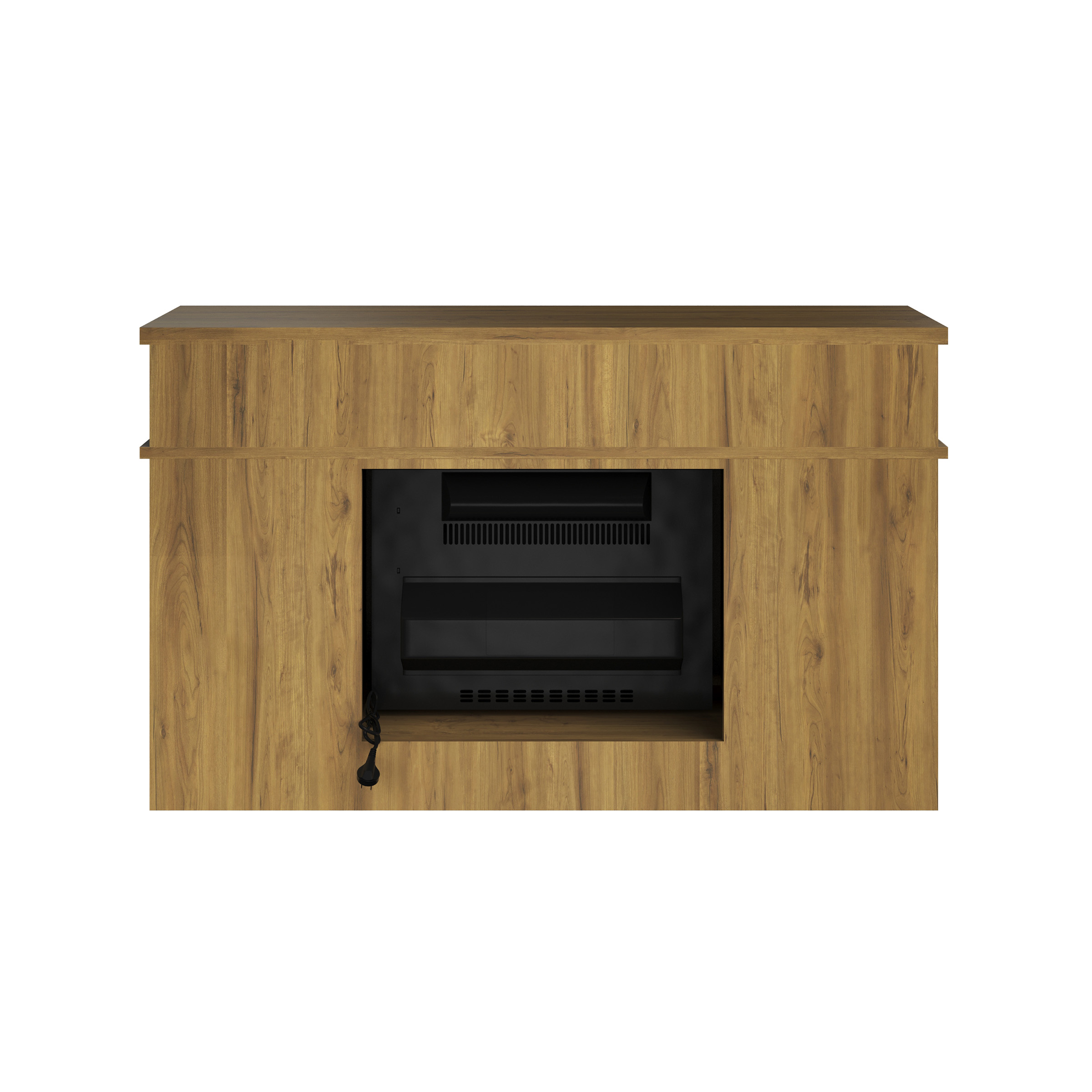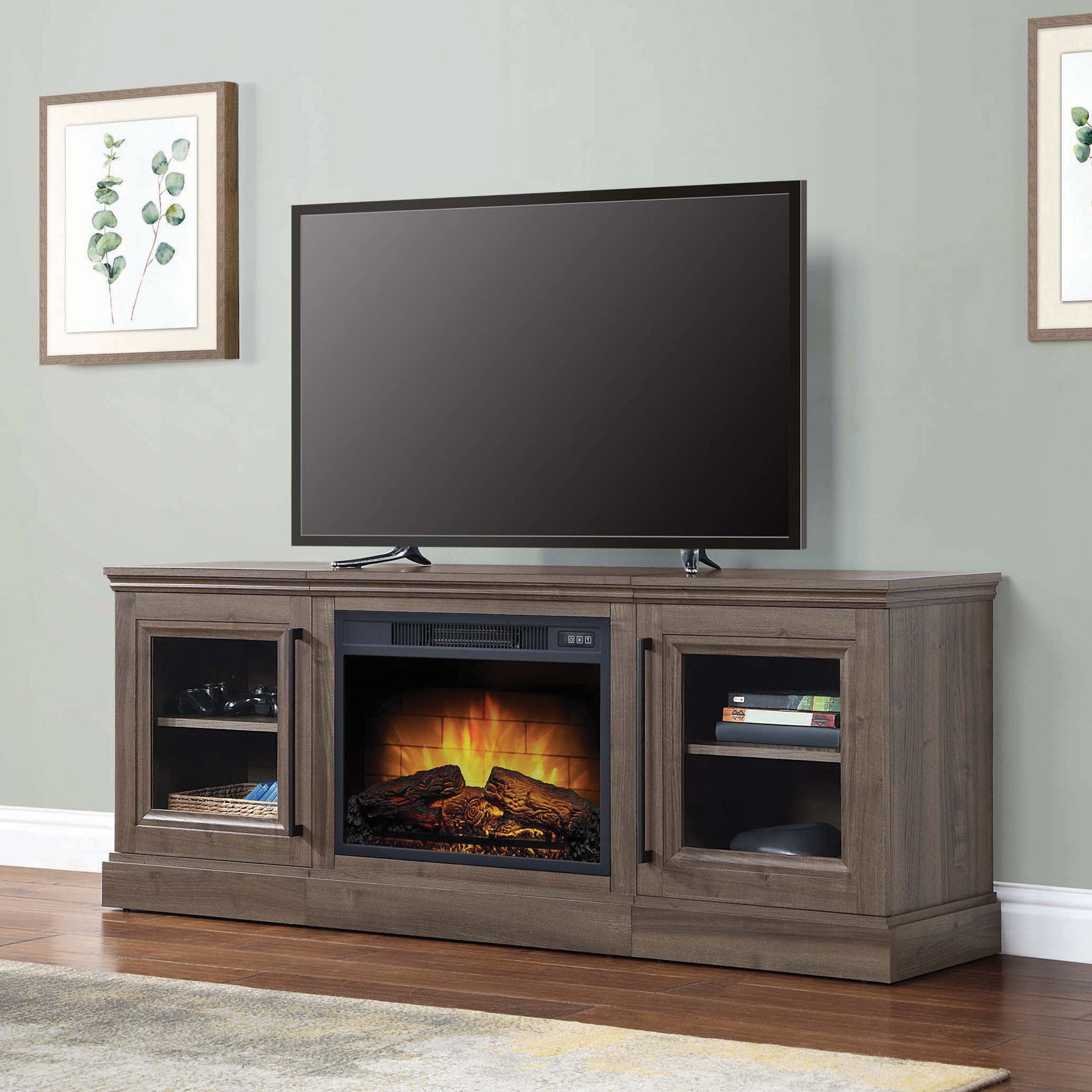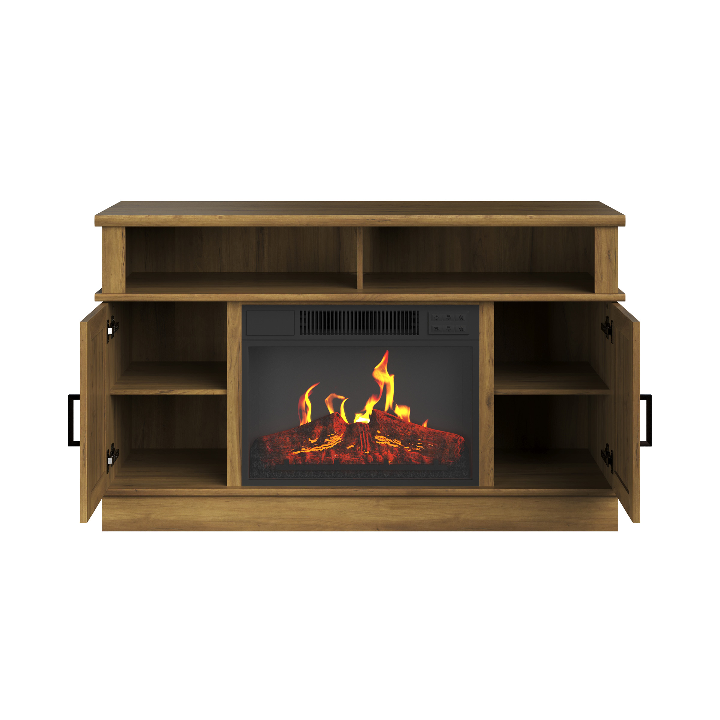 FIREPLACE TV STAND – Add a spark of style with this entertainment center that can hold a 50-inch TV, all your media players, movies, and so much more in the 2 open shelves and behind the 2 wood cabinet doors. EASY CONVENIENCE – This TV stand with fireplace includes a remote control, so you can adjust the heat, light, and timer settings from across the room or you can use the manual panel. ENERGY EFFICIENT – Along with LED flame technology that requires less energy to heat your home, the fireplace features a timer with auto-shutoff and can be set for 30 minutes up to 6 hours. USE YEAR ROUND – Turn the heat on or off and enjoy the changeable LED flames with options to increase or decrease the faux flame intensity providing just the right ambiance in any room and any season. MATERIALS – MDF Wood, Steel, Tempered Glass, and Thermoplastic Resin. DIMENSIONS – (L) 44.5″ x (W) 15.4″ x (H) 27.5″; Power: 1400 Watts, 4777 BTUs, 120V; Weight: 78lbs; CSA Listed. COLOR – Woodgrain Brown.