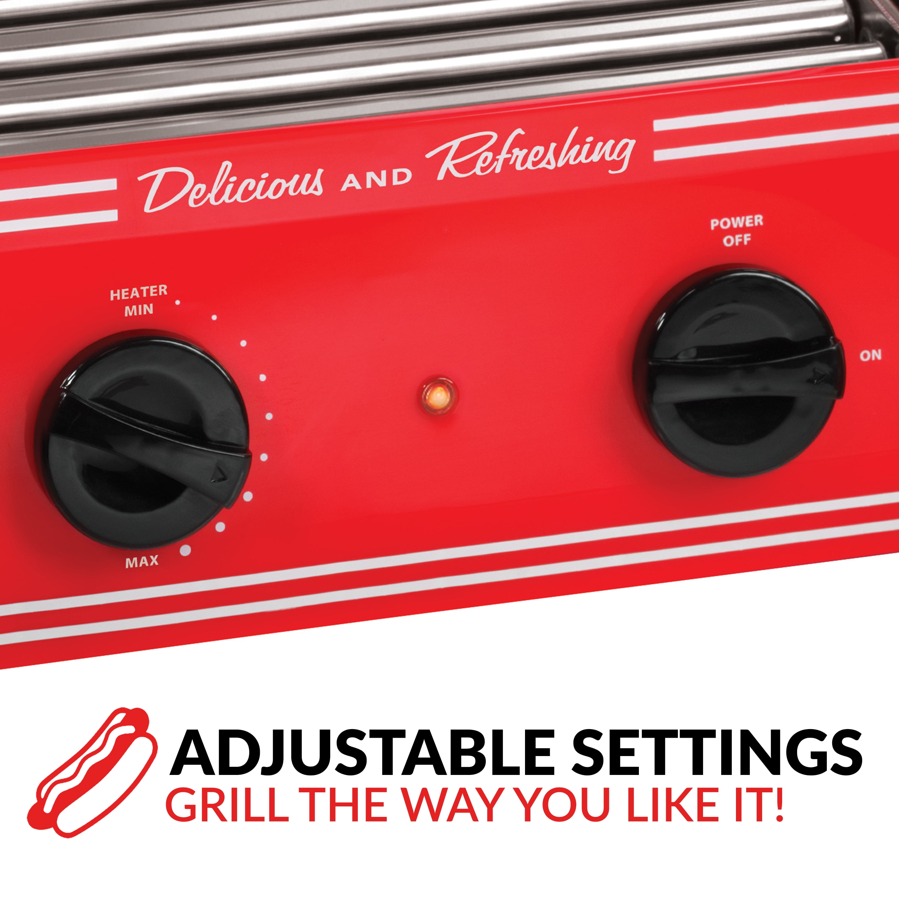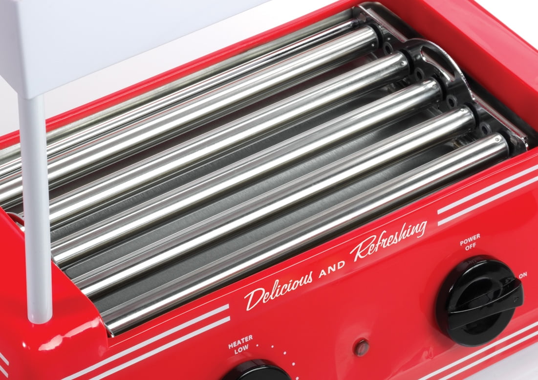 GREAT STYLE & GREAT TASTE: New retro-looking hot dog roller cooks up to 8 regular-size or 4 foot-long hot dogs at a time, as well as breakfast sausages, bratwursts, taquitos, and egg rolls STAINLESS STEEL ROLLERS: Five continuously rotating stainless steel rollers rotate 360-degrees for even cooking CANOPY BUN WARMER: The bun warmer holds up to 6 buns at a time, keeping them warm and ready to enjoy ADJUSTABLE SETTINGS: Simple ON/OFF control and an adjustable heat setting that allows you to grill your hot dogs to the way you like it CONVENIENT COUNTERTOP UNIT: Compact design of this hot dog roller machine makes it perfect for small spaces and it’s portable – making it easy to cook at parties or any occasion on the go. EASY CLEAN UP: The stainless steel rollers and drip tray are removable, making clean up a breeze INCLUDED COMPONENTS: Hot dog roller; canopy DIMENSIONS: 14.25 in, 6.4 lb