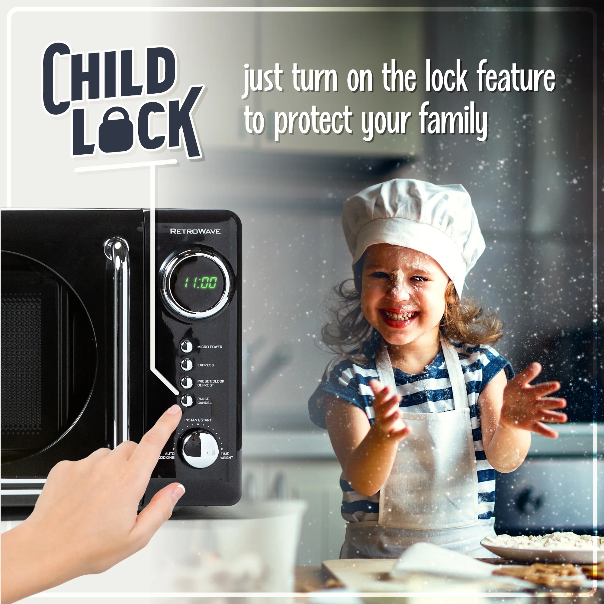 700-WATTS COOKING POWER : At 0.7 cubic foot, this microwave provides the cooking power needed to quickly cook and reheat foods CONVENIENT COOKING CONTROLS: 12 pre-programmed cooking settings, delay timer and express cooking provide options for the optimal heating of popular foods like popcorn, pizza, potatoes, veggies and more DIGITAL CLOCK : Easy-to-read LED display lights up the digital clock and highlights each cooking setting EVEN COOKING : Rotating glass carousel helps cook food evenly RETRO ACCENTS: A sleek chrome door handle, control panel and accents add fun and flair to this unique retro-styled appliance SIMPLE PROGRAM DIAL: Easily navigate cooking settings with simple turn-and-push program dial NOSTALGIA: From designs inspired by early 20th century America to the timeless appeal of our appliances, we offer unique, novel, and fun products for the family. We preserve the past, embrace the present, and look forward to the future.