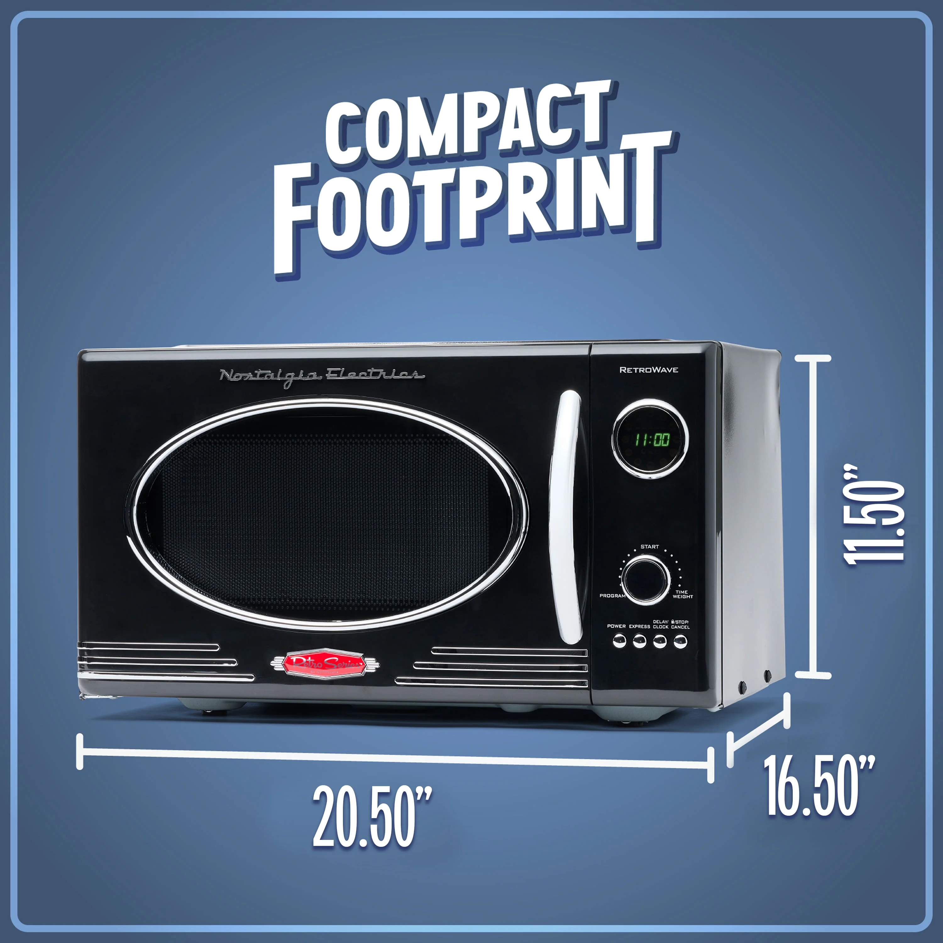 800-WATTS COOKING POWER: At 0.9 cubic foot, this microwave provides the cooking power needed to quickly cook and reheat foods CUSTOMIZABLE COOKING SETTINGS : 12 pre-programmed cooking settings and delay timer provide options for the optimal heating of popular foods like popcorn, pizza, potatoes, veggies and more DIGITAL CLOCK: Easy-to-read LED display lights up the digital clock and highlights each cooking setting EVEN COOKING: Rotating glass carousel helps cook food evenly RETRO ACCENTS: A sleek chrome door handle, control panel and accents add fun and flair to this unique retro-styled appliance SIMPLE PROGRAM DIAL : Easily navigate cooking settings with simple turn-and-push program dial
