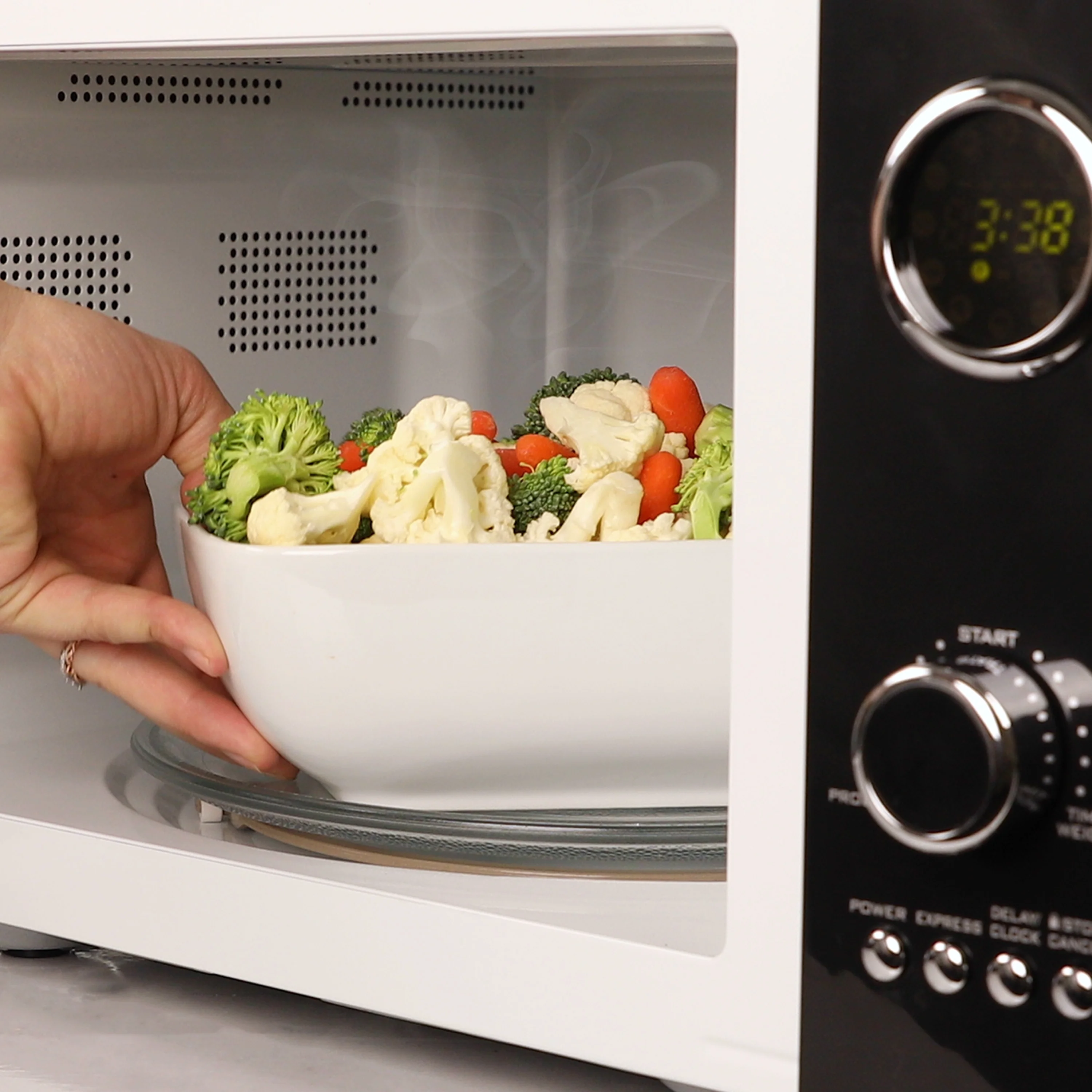 With a beautiful and sleek retro design, this microwave is sure to stand out in any kitchen. It features 12-pre programmed cooking settings and a bright LED display, making usability simple. Five power levels and 800-watts of power are perfect for reheating leftovers or cooking food.