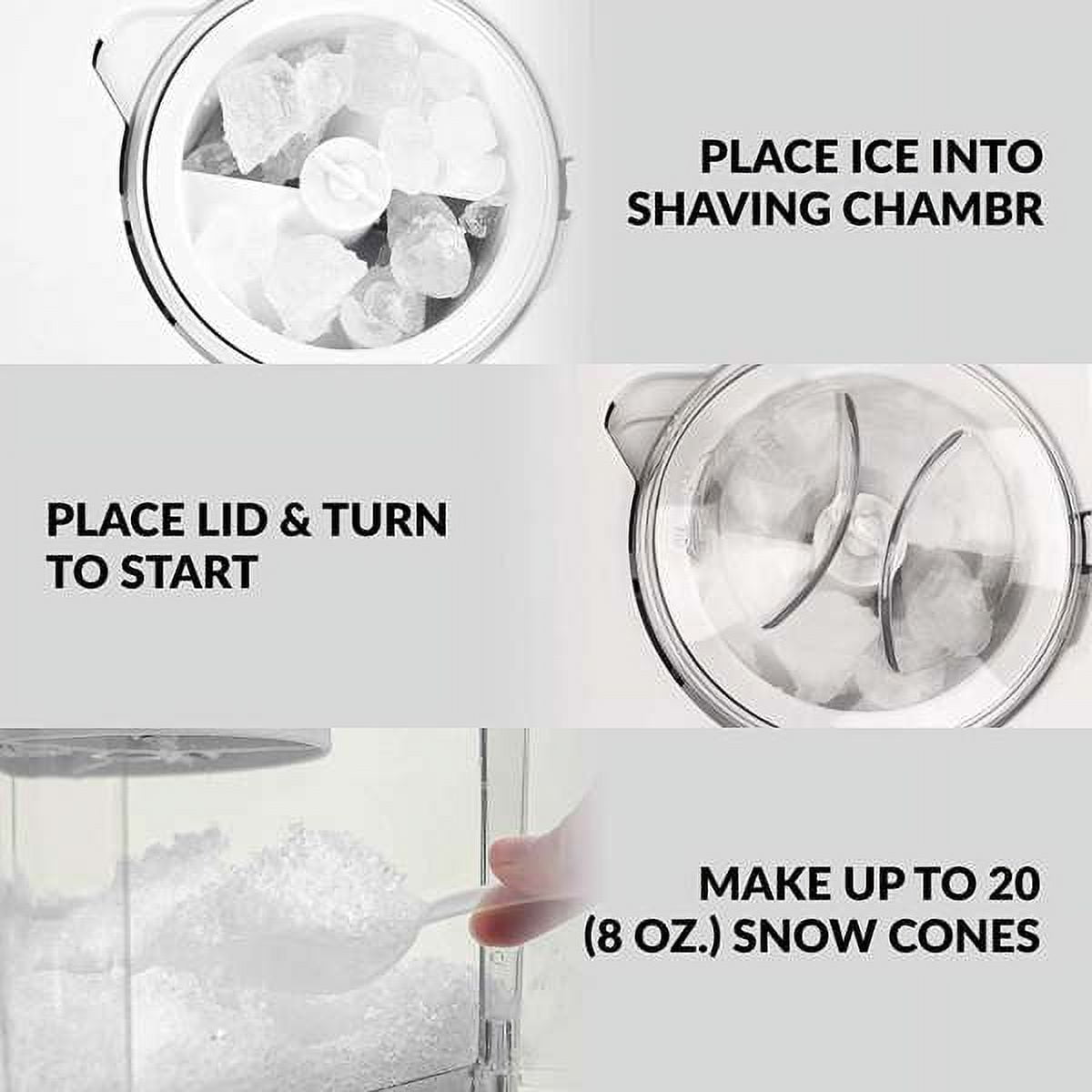Approximate capacity: 20 (8 oz.) snow cones Perfect for use with all Nostalgia Snow Cone Kits! (Snow Cone Kit-SCK800, SCS160-Snow Cone Syrups, Straws and Cups-SCSTRAWCUP20) Stainless steel cutting blades Includes 2 (8 oz.) reusable plastic cones and an ice scoop Cone shelf holds 2 snow cones Built-in safety switch Convenient countertop model BPA free