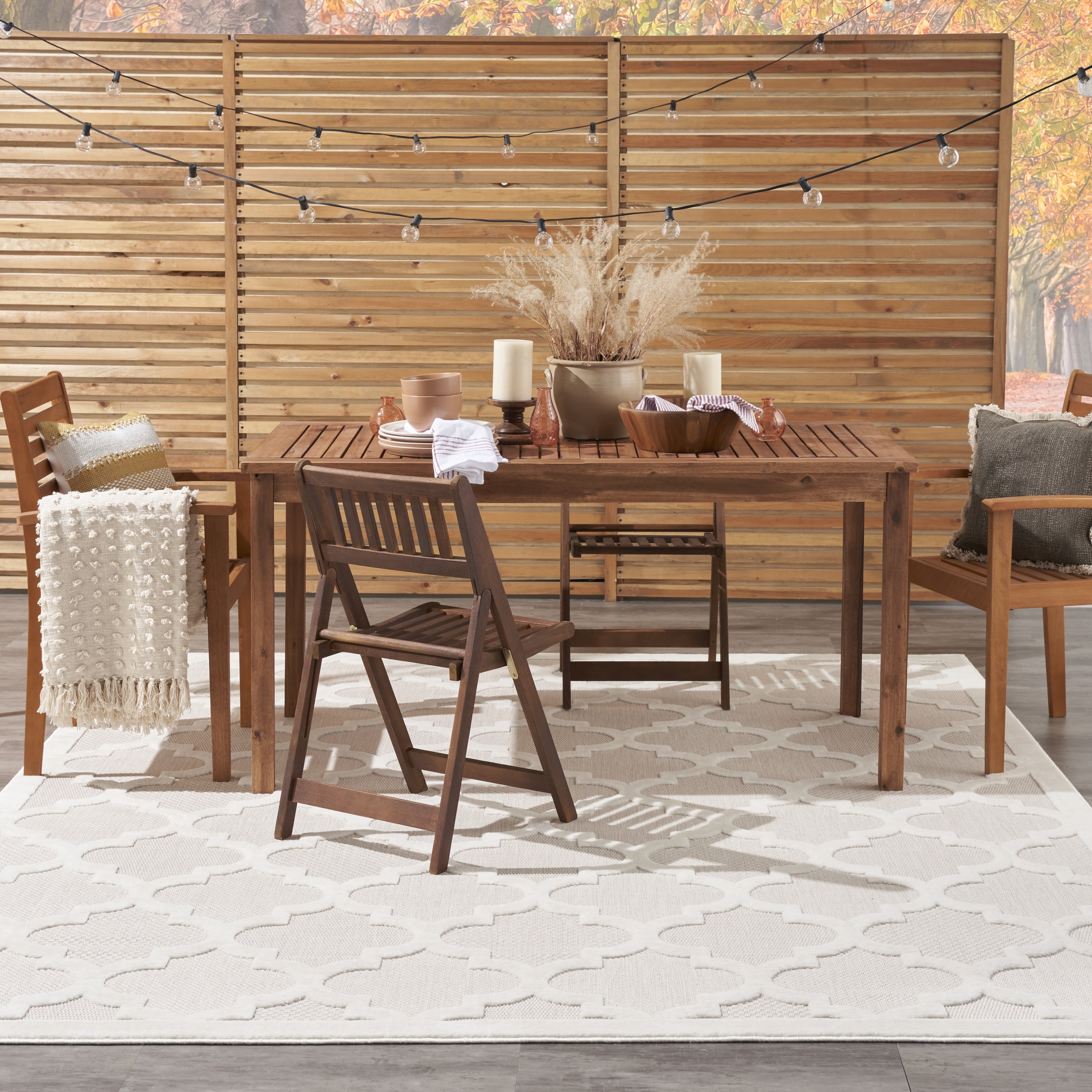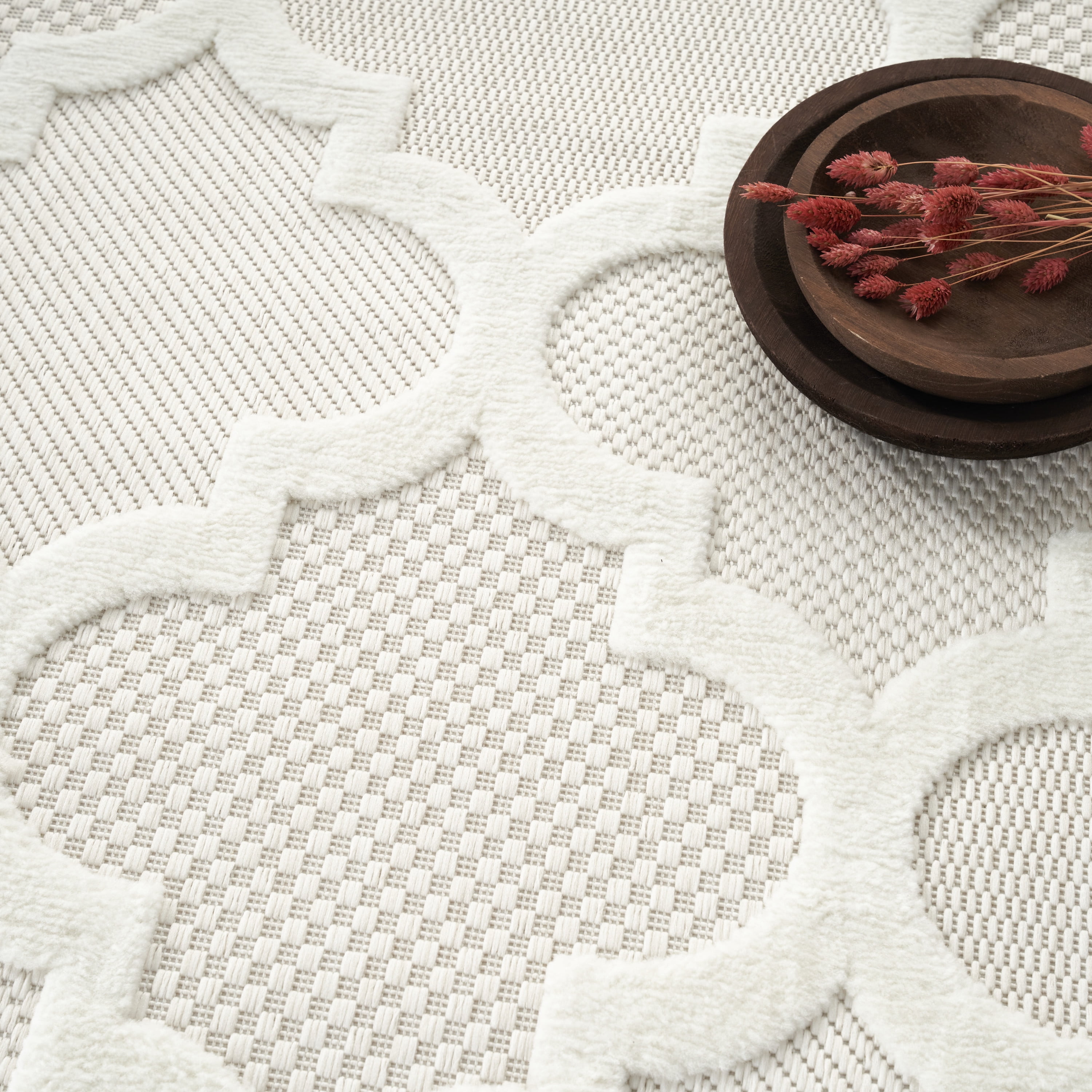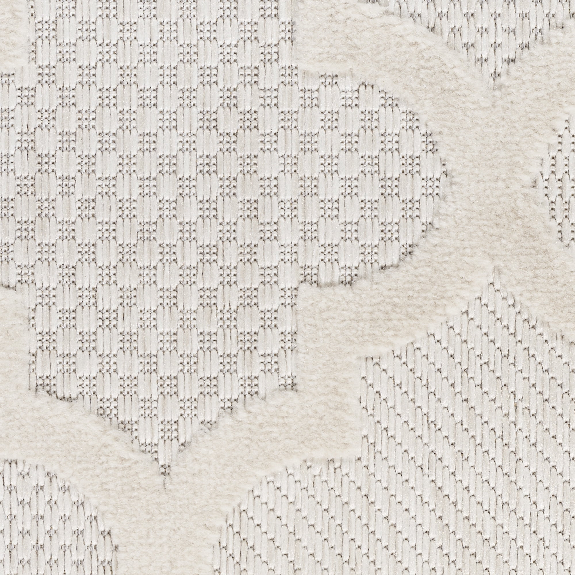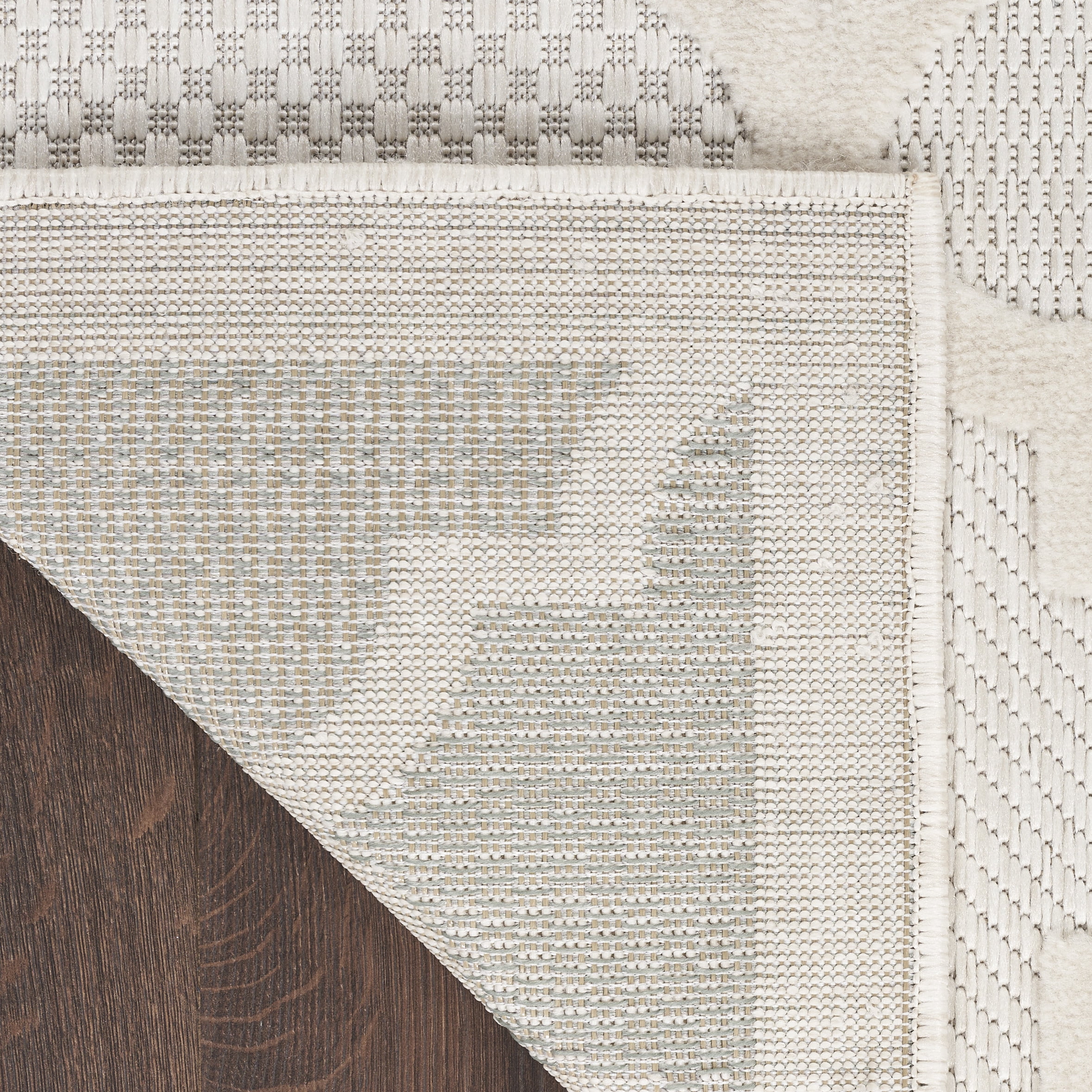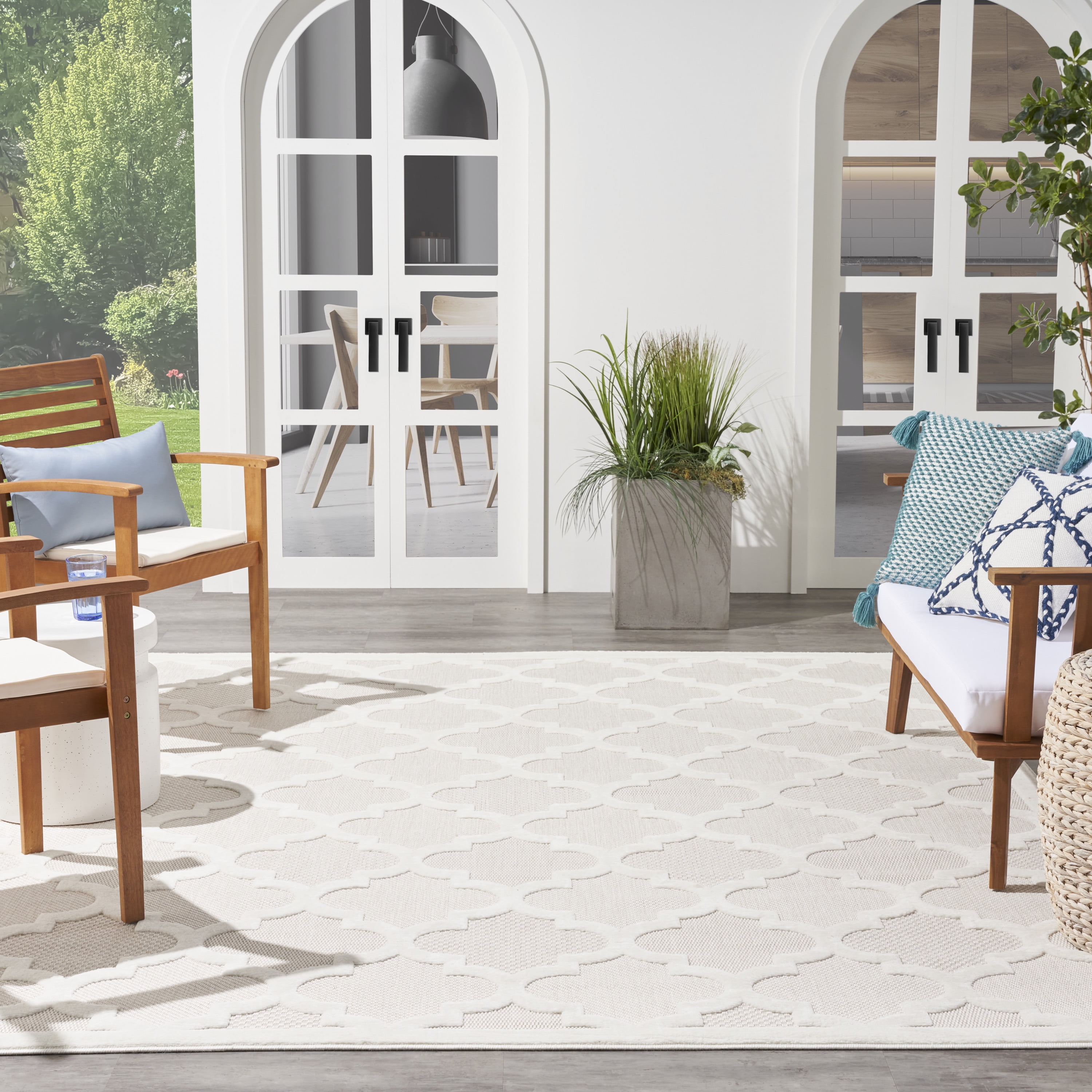 Refresh your home with the stylish designs showcased in the Nourison Easy Care Rug Collection. Featuring a flatweave ground with a softly textured high-low pattern, these indoor/outdoor rugs bring pleasing dimension to just about any space – from the living room, entryway, or kitchen to the porch, patio, deck, or balcony. Machine made from durable, low-shed, easy-clean fibers that are great in busy households and for all seasons spent outdoors. Ground your indoor or outdoor seating area in the stylish appeal of this indoor/outdoor rug from the Easy Care Collection. With a white backdrop that showcases multiple flatweave styles, enhanced by a raised Moroccan trellis pattern in ivory, this contemporary rug adds an appealing sense of depth to your surroundings. Place it in your living room, dining room, entryway, or favorite outdoor space such as the patio, porch, or deck for an instant style boost. Machine-made from durable, low-shed fibers that are easy to clean, making this a great choice for all seasons spent outdoors.