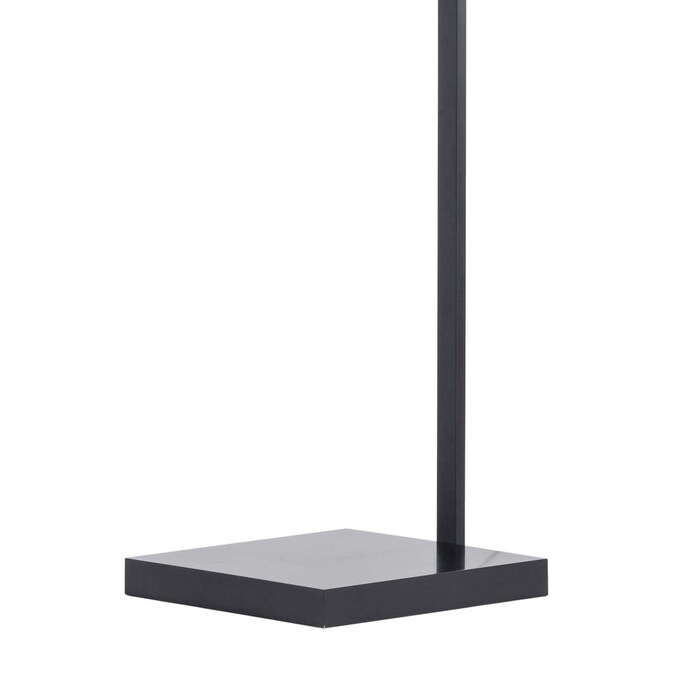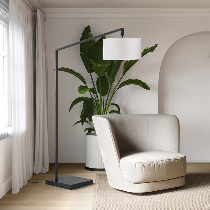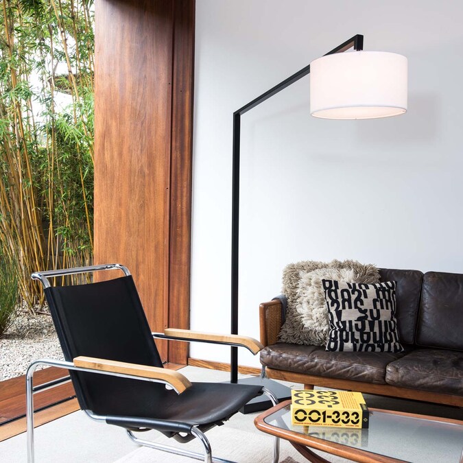 Practical modernity. This black arc floor lamp makes itself useful and attractive with geometric lines in steel with matte black finish. A white linen drum shade softens the angles while a step switch adds convenience to the minimalistic look.