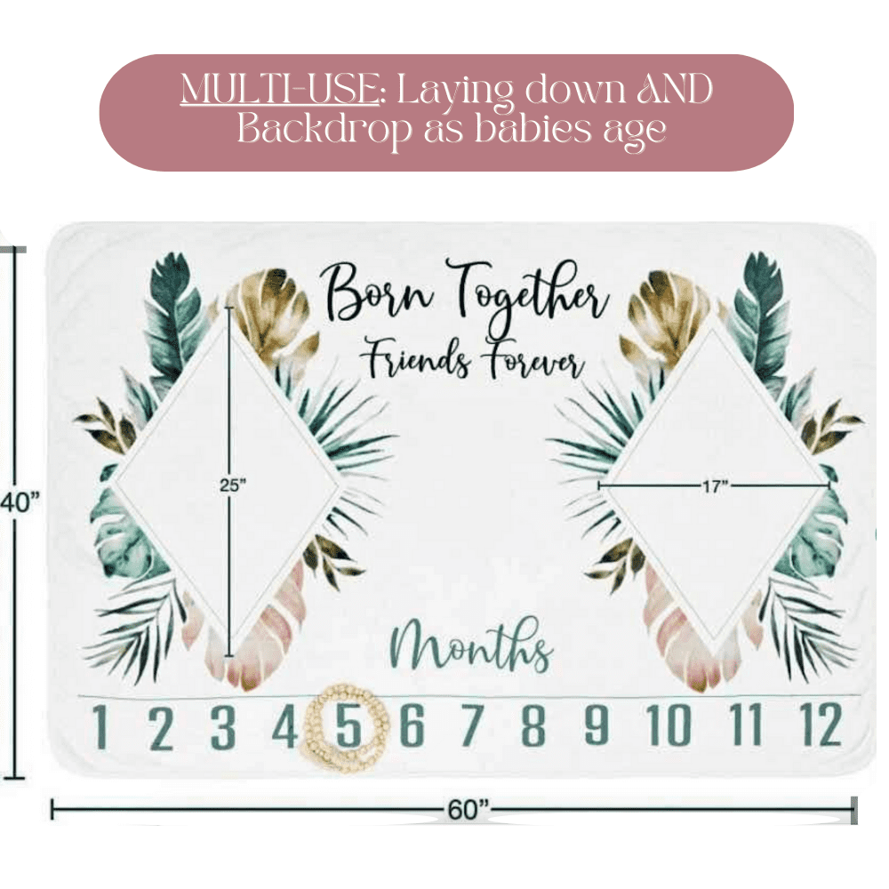 MONTHLY MILESTONE BABY PHOTO BLANKET FOR TWINS NovaaLife’s large-sized (40×60) gender neutral baby blankets for twins make for a beautiful baby photography prop backdrop. This one-of-a-kind, vintage watercolor print is a true eye-catcher. It’s super soft and includes boho beads that parents can make a numbered frame out of. This milestone blanket stands out from other baby growth blankets, so much so that parents can’t wait to newborn wrap their little ones. Our baby photo blanket makes a wonderful twins gift for relatives, friends or the expectant mom to be. We have twin girls in our family who are 12 now, so we know how much you will love showing off their growth milestones! Mostly, we are excited to share this journey with you. P.S. The beads are purposely placed in the middle of the blanket when packaged to protect them.