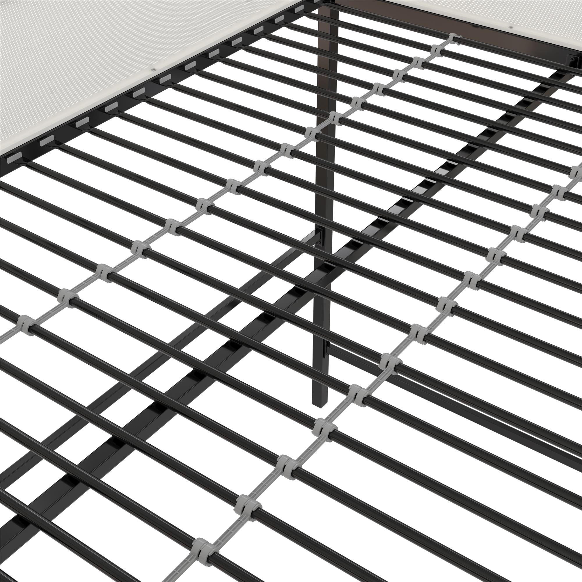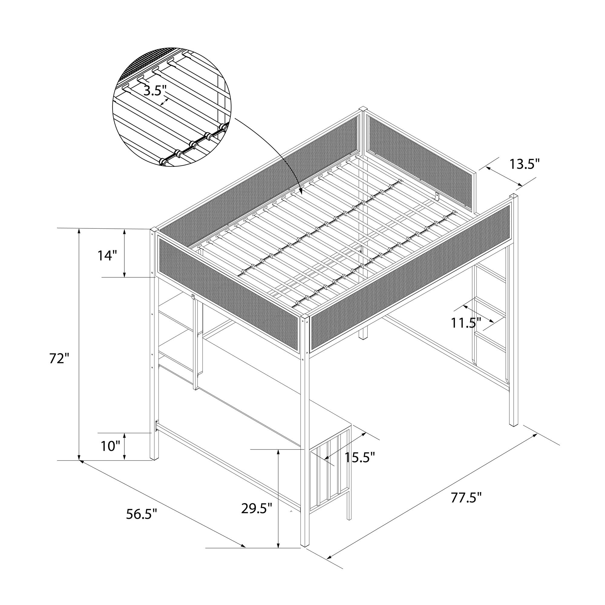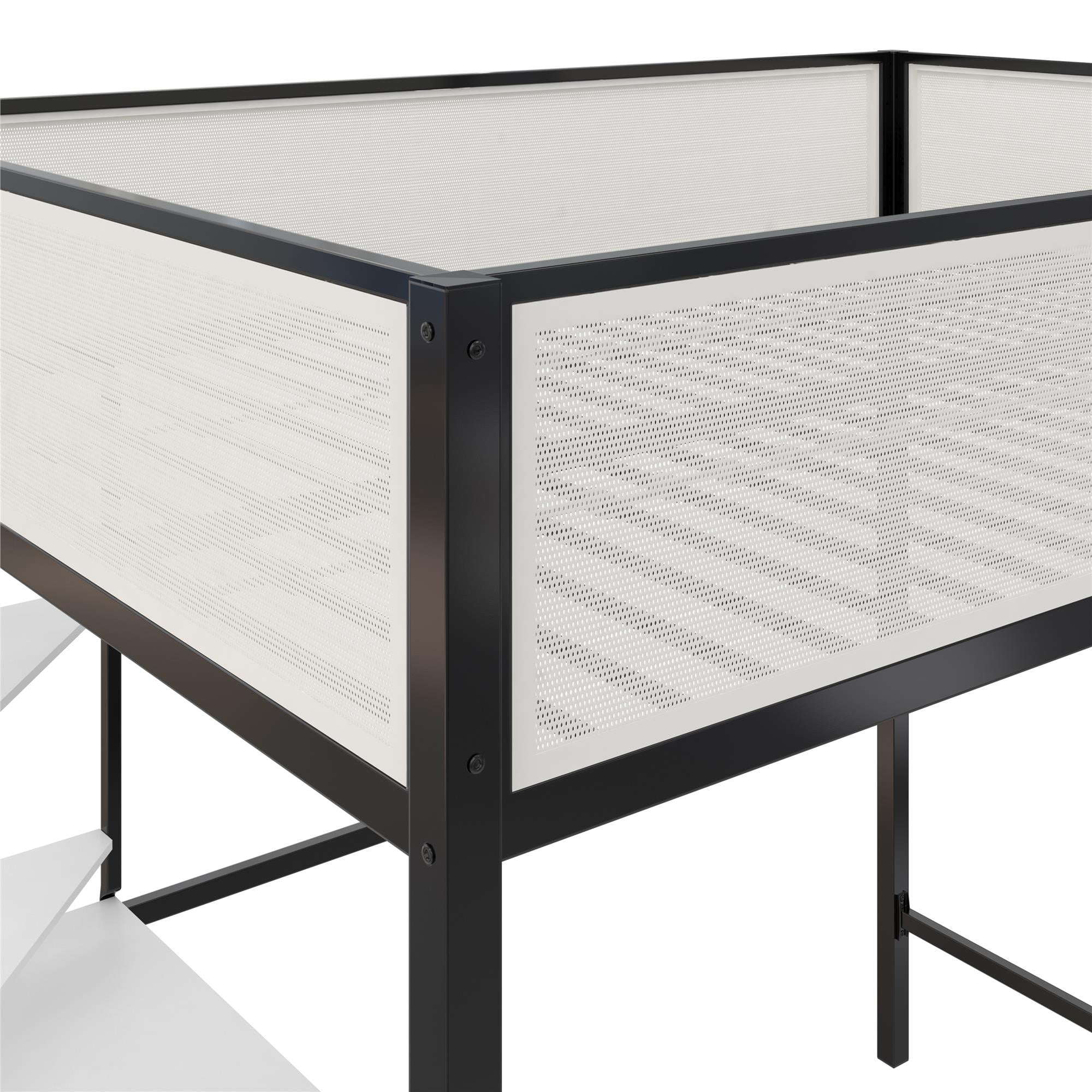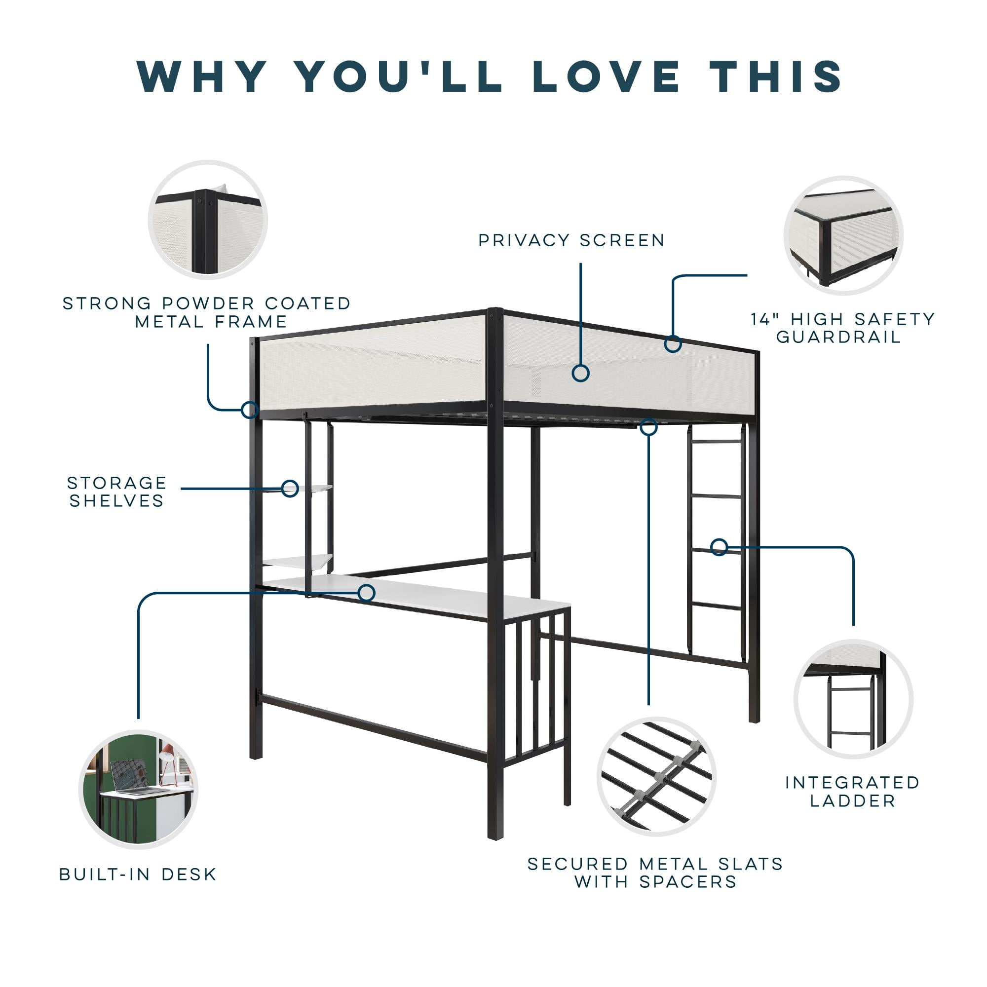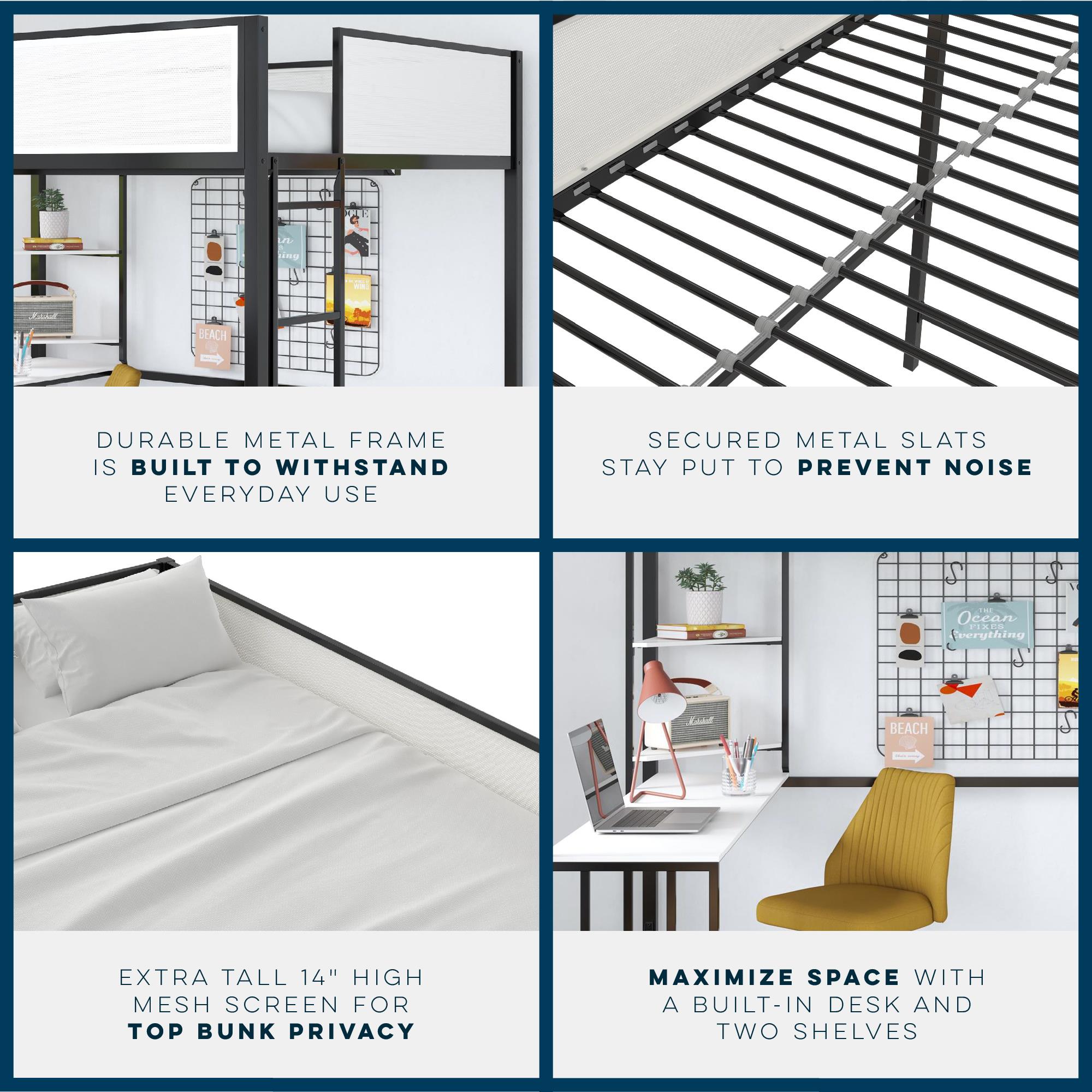 MIX & MESH MODERN: Our two-tone metal bunk bed with integrated step ladder is ideal for kids and teens who value multifunctional bedroom decor or for anyone who needs to outfit a small guest room or college dorm room in classic black and off white SLEEP, STUDY, & STORAGE: A supreme organizer, this kid’s bed features a comfy top bunk for rest, a lower-level computer desk workspace with two shelves for productivity, and an open area that can be used for lounging or added organization for clothes SUPERIOR SAFETY: Includes a steel bed frame that is powder-coated for corrosion and rust protection, engineered wood shelving, secured metal slats tailored for a 6″ mattress, and 14″ upper bunk privacy mesh panels that serve as full-length guardrails NO FUSS ASSEMBLY: Tools and easy-to-follow instructions are included in box. Get answers to all your questions from our helpful customer support team 7 days a week by phone, email, or chat and easily order any replacement parts if needed SPACE SAVING SIZE: Full loft bed: 77.5″L x 56″W x 72″H. Weight limit: 300 lbs. Desk dimensions: 55.5″W x 15.5″D. Desk weight limit: 100 lbs. Shelf dimensions: 15″W x 15″D. Shelf weight limit: 50 lbs. Net weight: 111 lbs. 1-year limited warranty