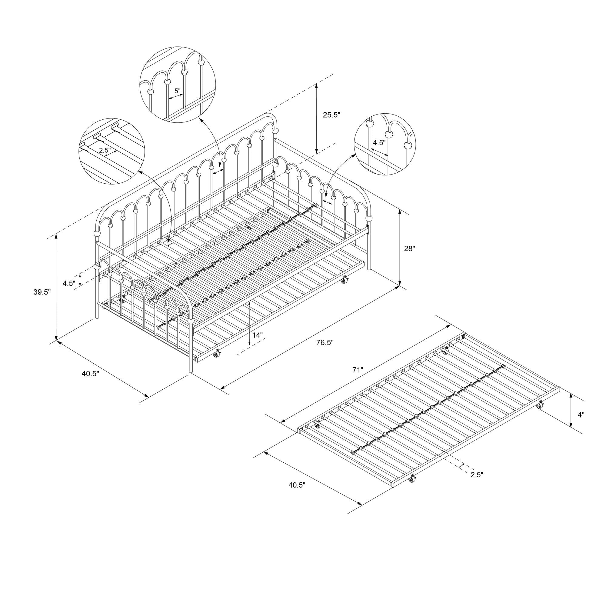 Stunning modern metal daybed with stylish metal details Multi-functional piece, ideal for small living spaces and accommodating guests Sturdy metal frame construction with side rails and heavy duty steel slats that do not require additional foundation Trundle includes casters that have built-in breaks Available in white, black and turquoise Designed to fit two twin size mattresses (75″ x 39″) – sold separately Ships in one box and it is easy assembly Daybed dimensions: 76.5″L x 40.5″W x 39.5″H Trundle dimensions: 71″L x 40.5″W x 4″H Carton dimensions: 88″L x 31.5″W x 4″H Weight limit for Daybed: 400 lb. Weight limit for Trundle: 225 lb. Net weight: 60.5 lb. Gross weight: 76.5 lb.