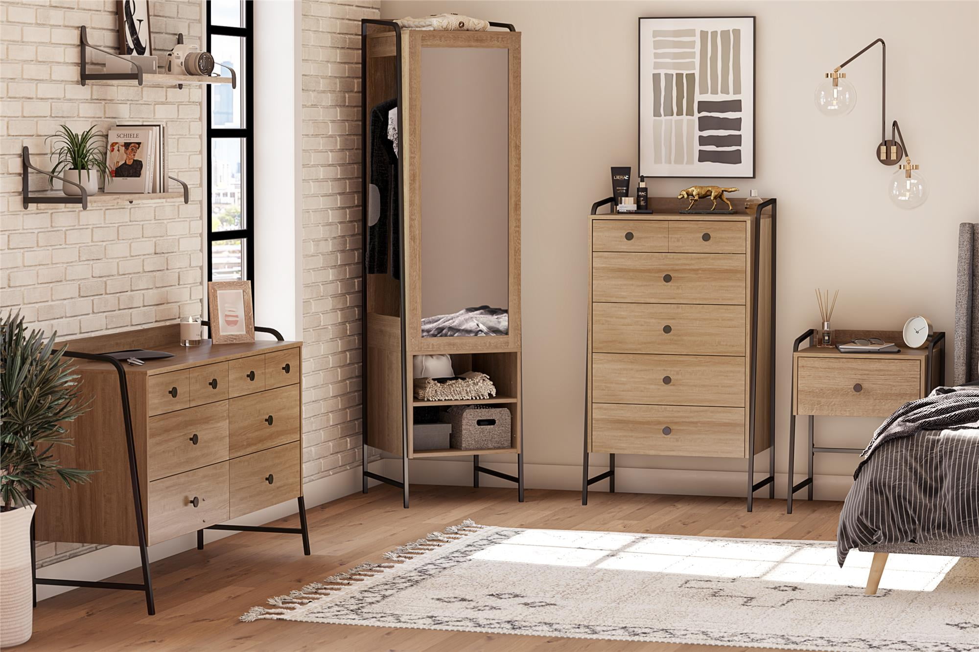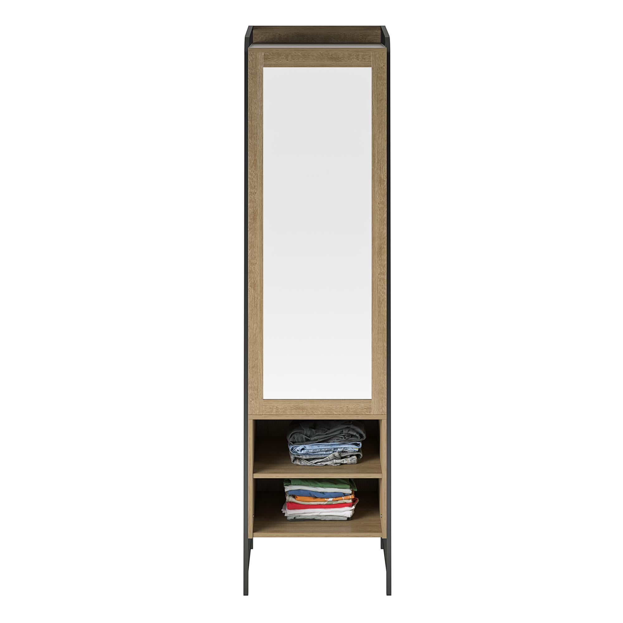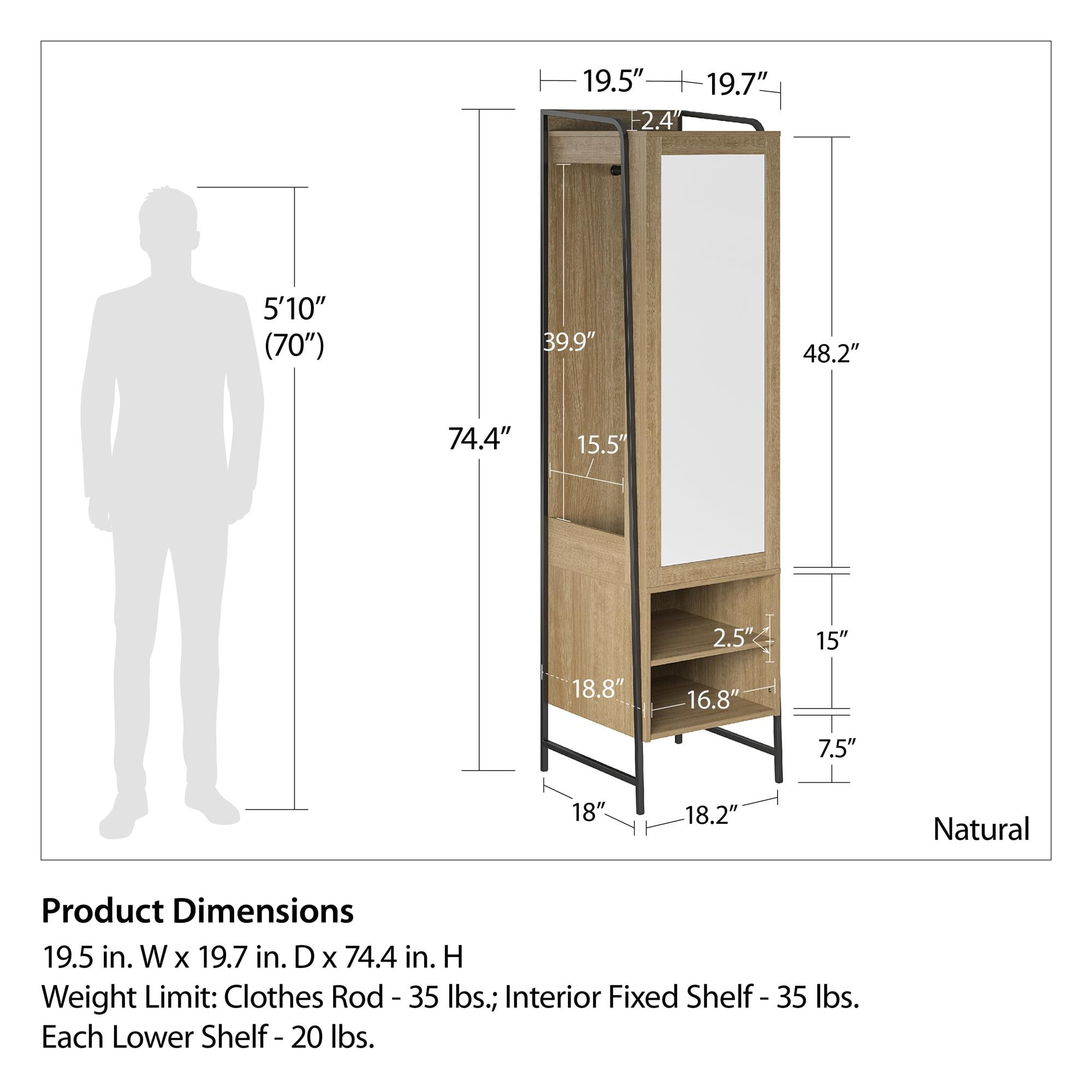 Give your bedroom a fresh makeover with the Bushwick Collection from Novogratz This rustic Wardrobe is comprised of engineered wood with a natural wood grain finish atop an industrial style power coated frame Hang your clothing on the roomy rack in back and stack your hats or shoes on any one of the 3 shelves provided Before you walk out the door, give yourself a once-over in the mirror before stepping out to make your mark on the world Perfect for the entryway, college dorm, bathroom, or simply used as bonus closet space in the bedroom Complete the look with the entire Bushwick collection. (each sold separately) The Wardrobe ships flat in one box and requires assembly. Two adults are recommended to assemble. Once assembled, the Wardrobe measures to be 19.5″ W x 19.7″ D x 74.4″ H Max weight capacities: Clothing Rod: 35 lbs. Inner shelf: 35 lbs. Lower shelves: (x2): 20 lbs. each. Assembled Unit weight: 82.8 lbs. 1-Year Limited Warranty Included