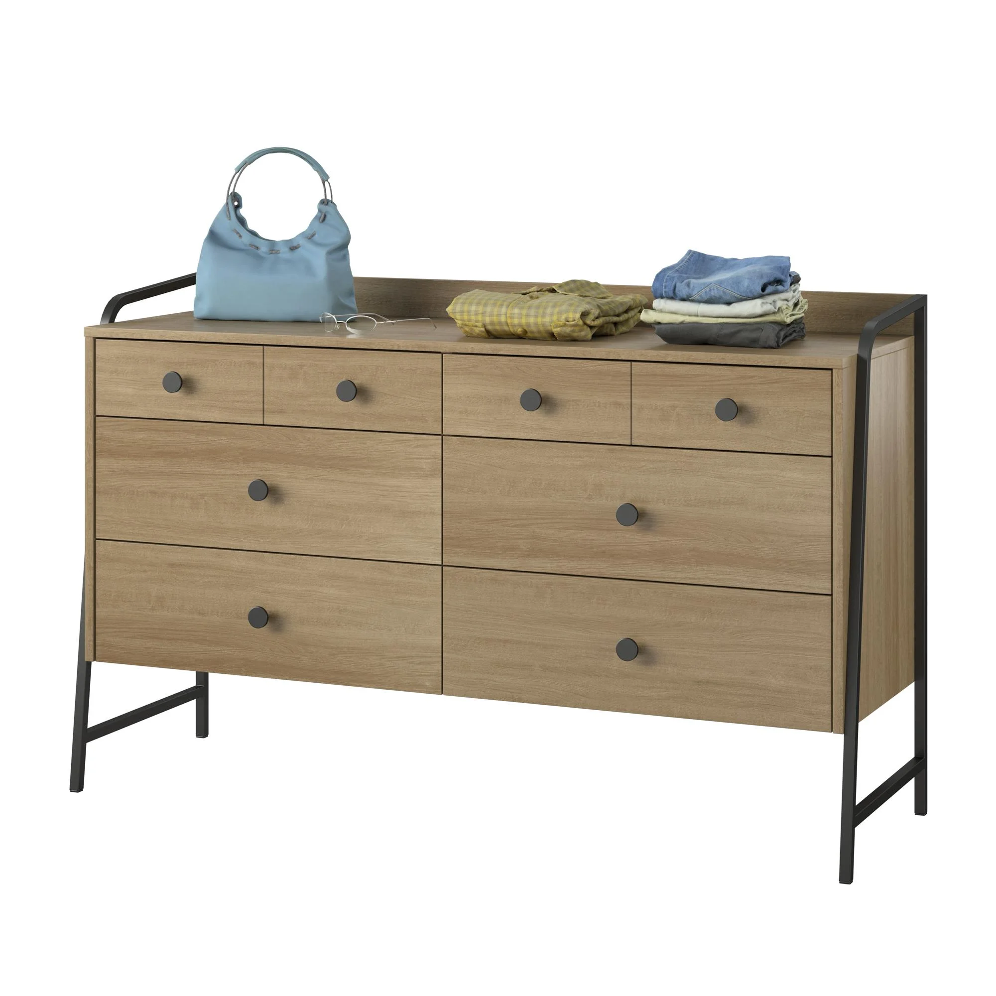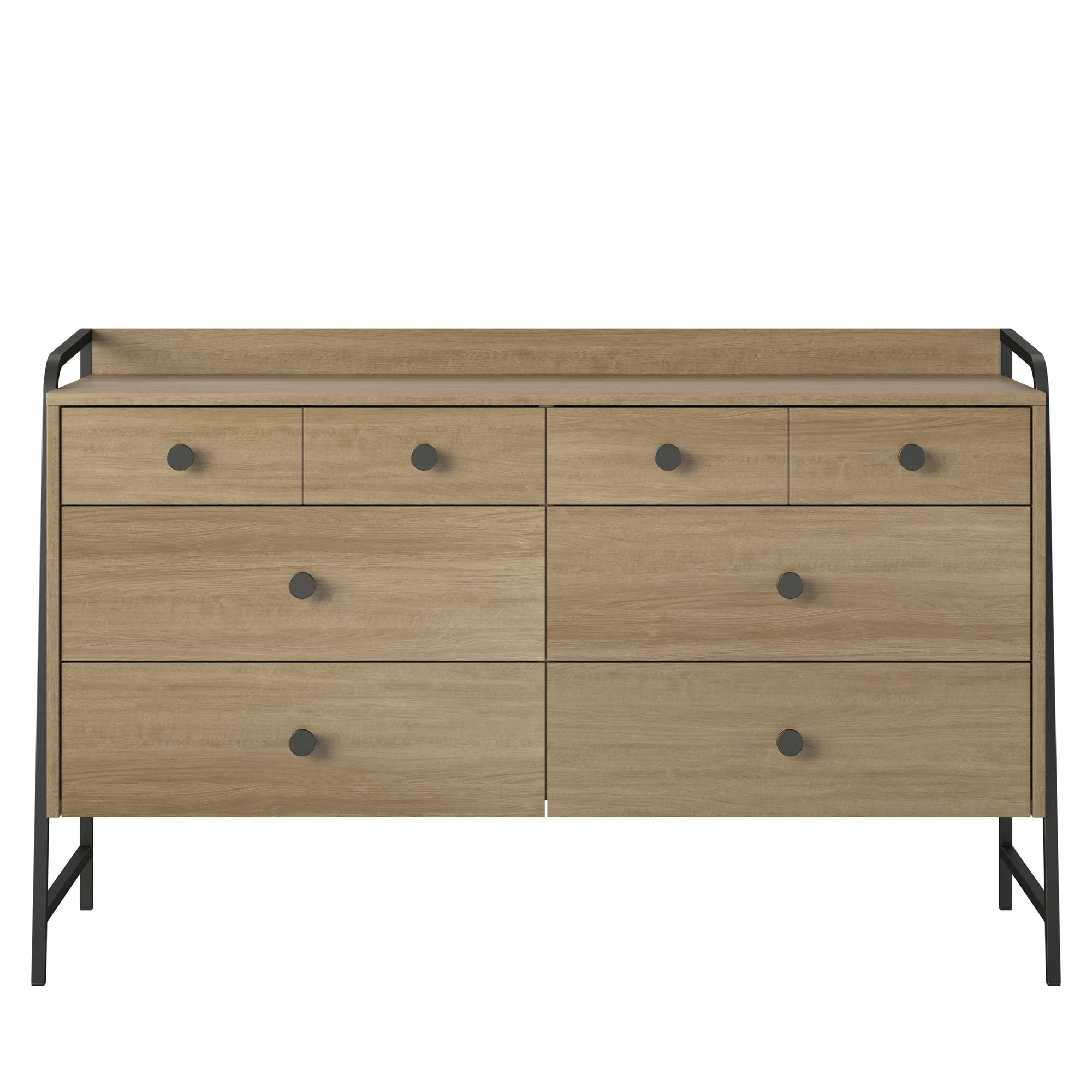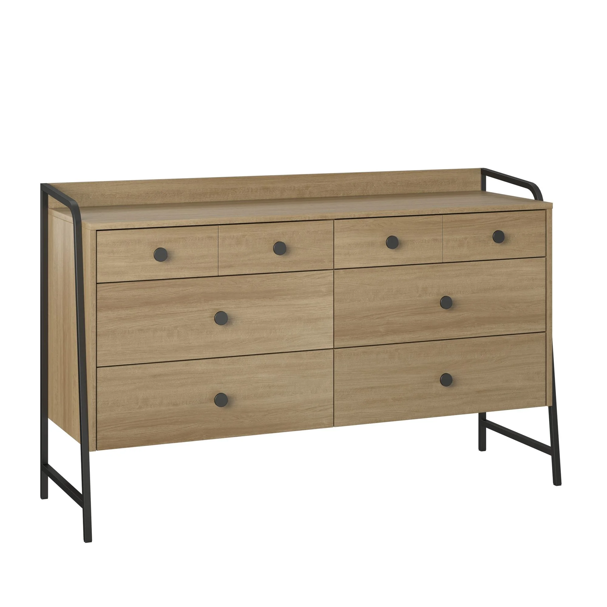 Give your bedroom a fresh makeover with the Bushwick Collection from Novogratz This rustic Wide 6 Drawer Dresser is comprised of engineered wood with a natural wood grain finish atop an industrial style power coated metal frame The top 2 drawers are conveniently sized for smaller items, while the roomy lower 4 drawers give enough space to stow away an abundance of clothing Complete the look with the entire Bushwick collection. (each sold separately) The Wide 6 Drawer Dresser ships flat in one box and requires assembly. Two adults are recommended to assemble. Once assembled, the Dresser measures to be 50.2″ W x 16.3″ D x 31.2″ H Top drawer measurements (x2): 21.6″ W x 13″ D x 3″ H. Lower drawer measurements (x4): 21.6″ W x 13″ D x 4.1″ Max weight capacities: Top: 75 lbs. Top drawers (x2): 15 lbs. each Lower drawers (x4): 25 lbs. each. Assembled unit weight: 84 lbs. 1-Year Limited Warranty Included